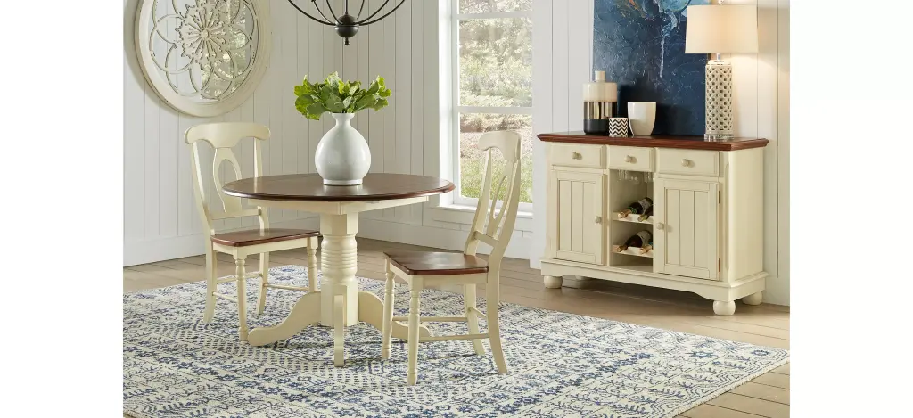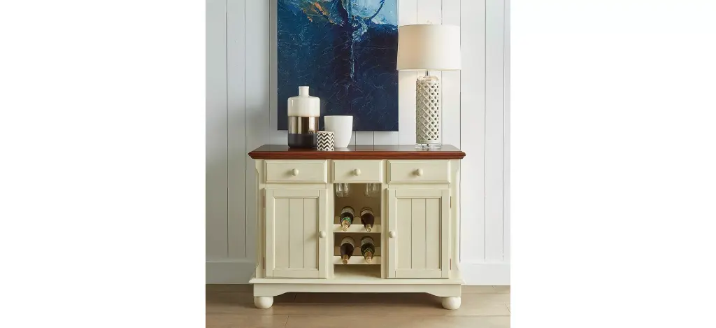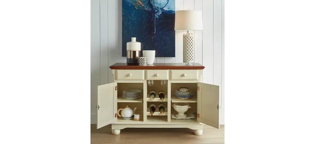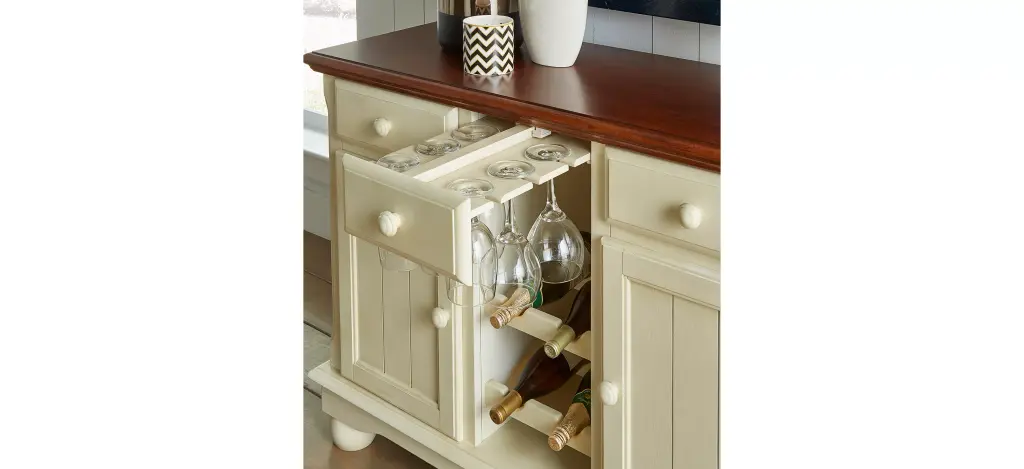 The British Isles server is constructed of solid Rubberwood and designed with traditional country appeal. The server provides ample hidden storage, along with wine storage for up to four bottles. The server's middle drawer is actually a wine glass rack that holds up to six glasses.