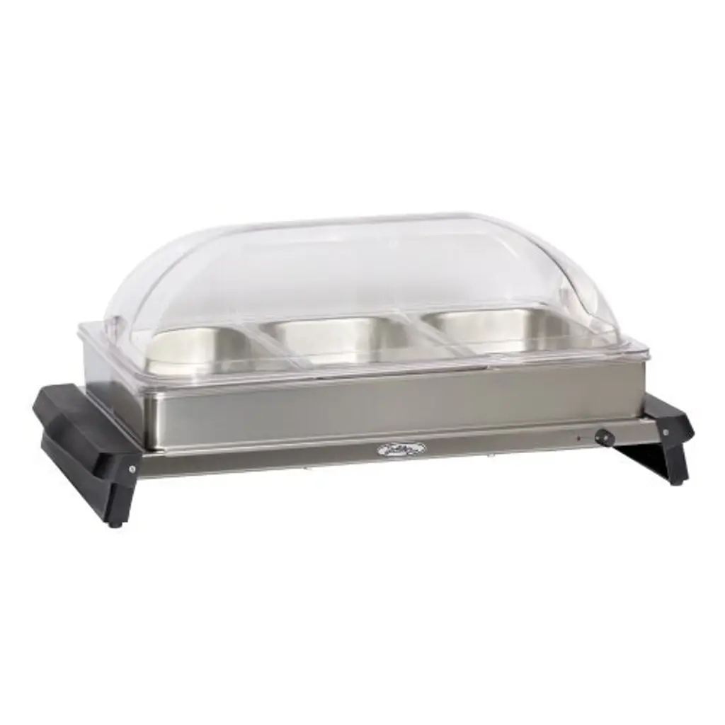 Keep prepared food hot and ready to serve with BroilKing`s electric Rolltop Buffet Server. Comes with a convenient roll top lid that allows your guests to view the food you ve prepared and easily roll back the lid when they re ready to serve themselves. Stainless warming tray base is equipped with an adjustable thermostat that ranges from 155 to 205 degrees Includes three 2.6 quart pans and 1 pans frame both of which are removable Equipped with safety signal on light 4 non-skid feet and cool-touch handles 2.6 quart pans hold up to 25 four ounce servings each. Stainless warming tray base is equipped with an adjustable thermostat that ranges from 155 - 205 degrees F Includes three 2.6 quart pans and 1 pans frame, both of which are removable Equipped with safety signal on light 4 non-skid feet and cool-touch handles 2.6 quart pans hold up to 25 four ounce servings each Three 2.6 qt. stainless chafing pans; each holds up to 25 four oz. servings (NBS-3RT) One clear polycarbonate rolltop lid Stainless chafing pan holder removable; can use base as warming tray Variable heat control - 155 to 200o F l Safety signal light Generous 20-1/2"x14" warming surface l Stylish Cool-Touch handles. Easy to clean stainless warming surface l 4 non-skid feet 3 prong commercial cord set l Two-year limited warranty l UL Listed 120 Volts - 300 Watts - 2.5 AmpsWhile we aim to supply accurate product information, it is sourced by manufacturers, suppliers and marketplace sellers, and has not been provided by Overstock.