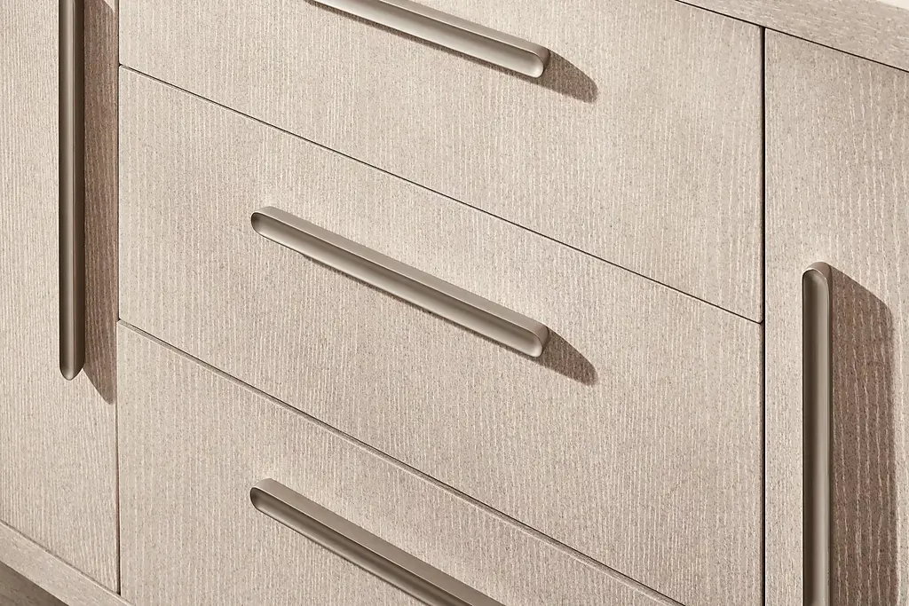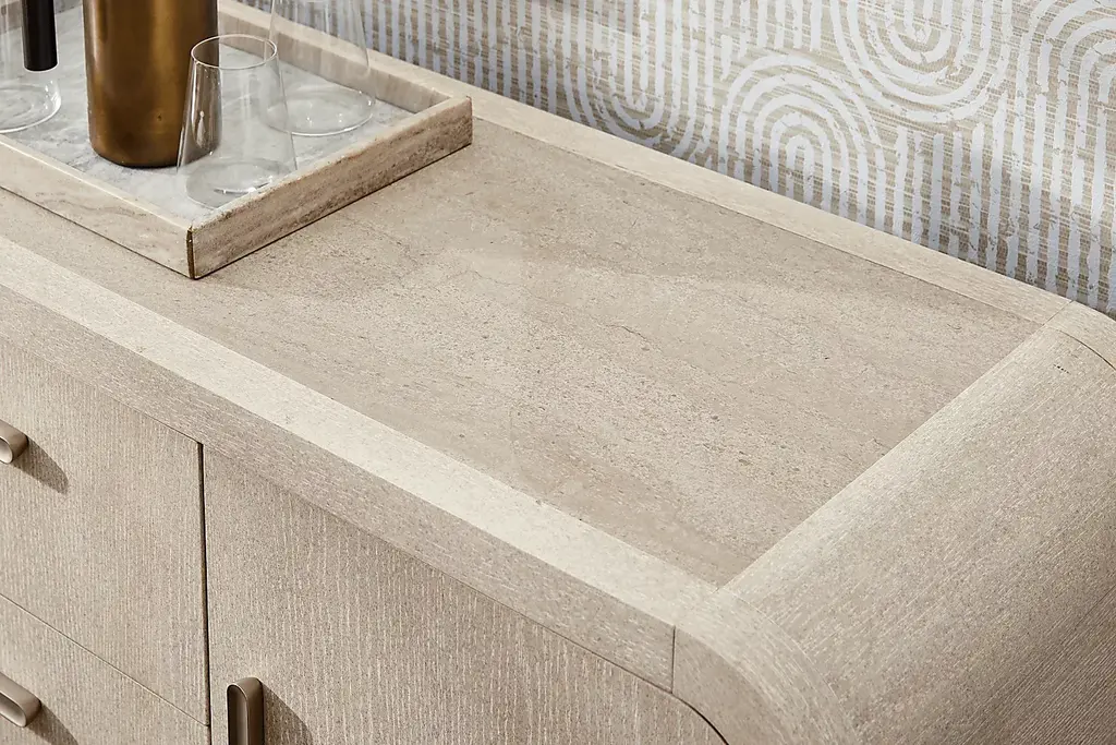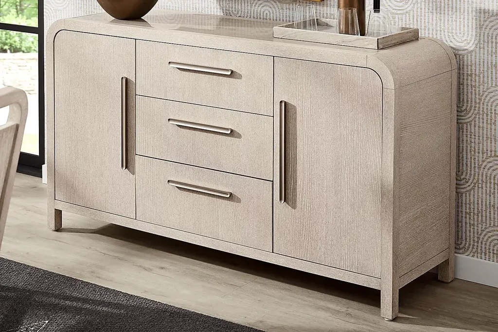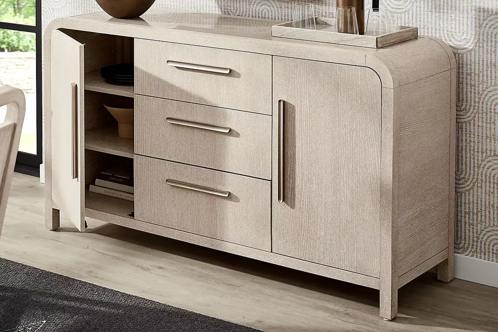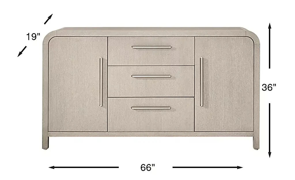 Subtle art deco flair infused with warm, family-friendly appeal is the hallmark of the captivating curves and lines of the Drew & Jonathan Canyon buffet. Exuding contemporary charm, this piece is finished in a light gray hue and shaped into organic stirrup-style bends. Three shelves on either side keep things tidy behind the cabinet doors, and three central drawers maximize the storage space.