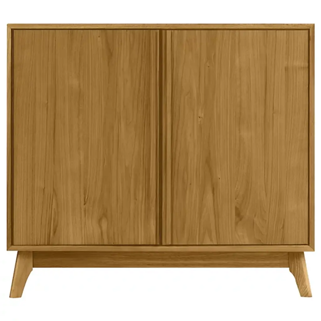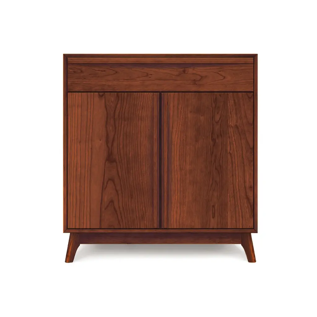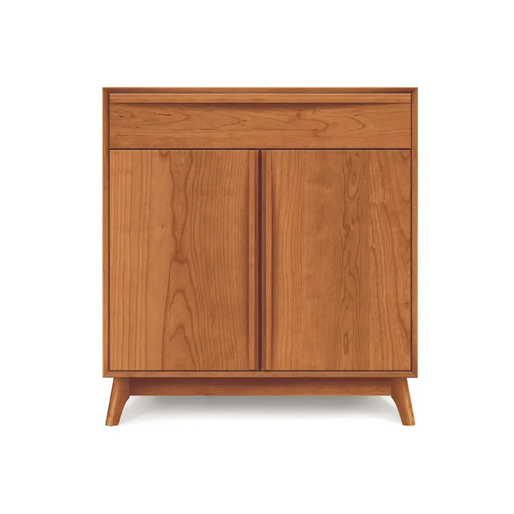 Copeland's high-end Catalina 2 Door, 1 Drawer Buffet with open interior and adjustable shelving. Real solid wood fine dining furniture crafted for generations of service in your luxury home. Custom handmade to order with solid natural North American wood. Top drawer features removable silverware tray with Guardian Anti Tarnish lining and cloth. Best in its class of authentic custom fine dining furniture, this small buffet is destined to be a cherished family heirloom!Mid-century, modern, 1950s American design is what the Copeland Catalina dining furniture collection is all about. Handcrafted in Vermont, with sustainably harvested hardwoods, this collection combines the clean, unadorned lines of the International Modernists with organic and geometric forms.Construction details include 45-degree miter construction where solid wood tops and sides are joined to create a perfectly seamless perimeter. The technique to produce this style requires extreme precision and is only attainable through exacting detail. The leading edge of this modern buffet is beveled to present a thin delicate, line that belies its considerable heft. Custom solid wood throughout, fully finished drawer boxes with solid wood drawer fronts/sides/backs, asymmetrical English dovetails and full-extension, under-mounted, soft close drawer slides (with no visible hardware) for sturdy, smooth operation. Integrated wooden bar pulls run the length of the drawers and doors.Base price represents buffet in natural cherryShown in natural cherry Matching furniture available in our Catalina Furniture CollectionNatural variations in solid wood and hand applied finishes make each piece unique. Slight grain and finish irregularities tell you that the furniture has been crafted from solid wood and are considered hallmarks of quality.