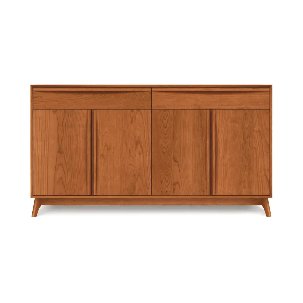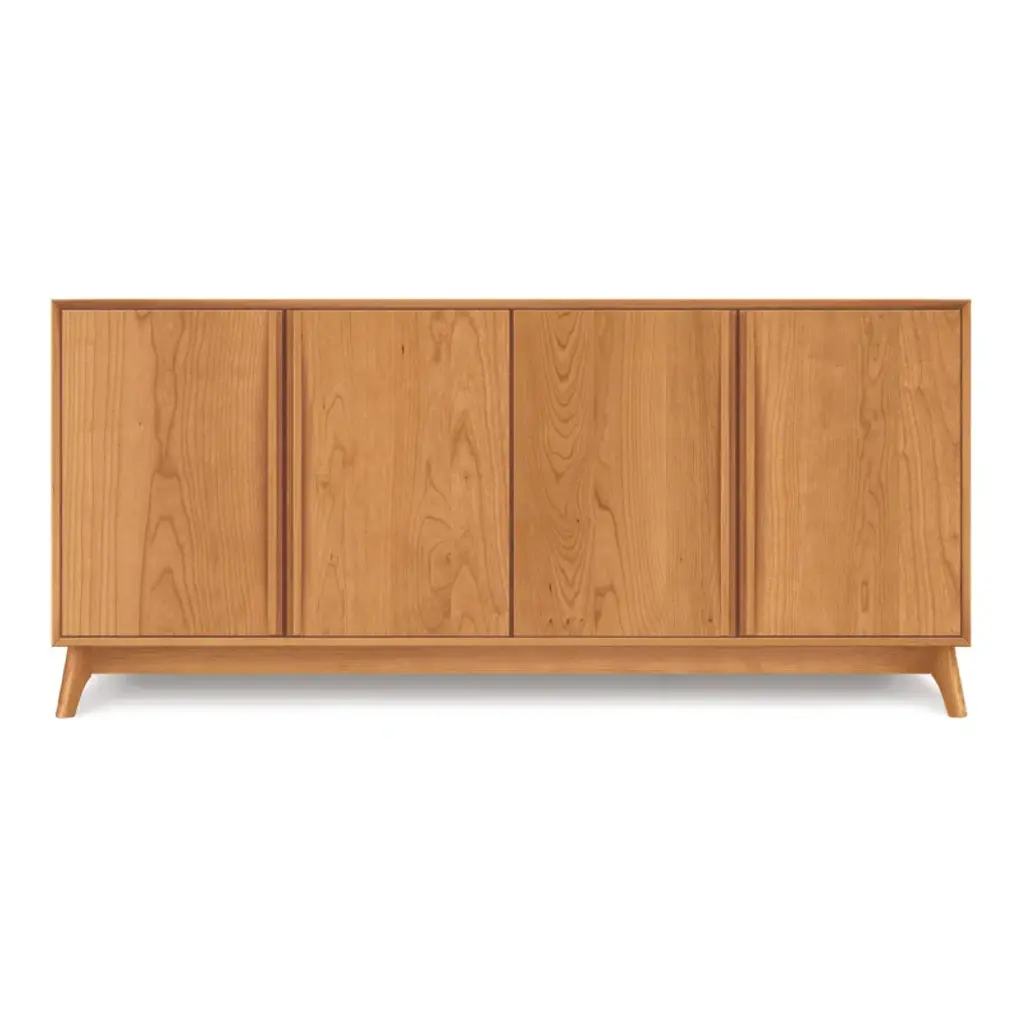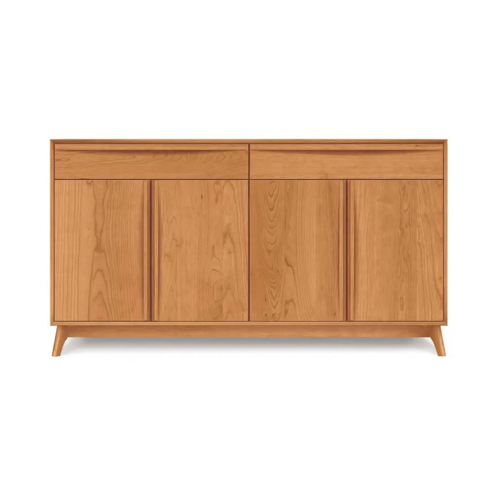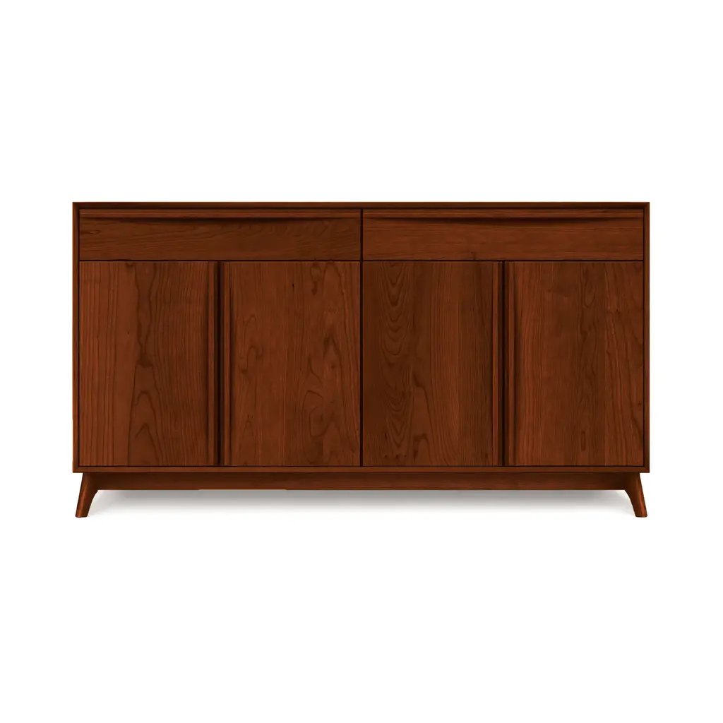 Copeland's luxury Catalina 4 Door, 2 Drawer Buffet with adjustable interior shelves and removable silverware tray with Guardian Anti Tarnish lining and cloth for each drawer. Optional hutch top has adjustable / removable shelves for wine bottles and stemware storage.Catalina is real solid wood fine dining furniture crafted for generations of service in your natural home. Custom handmade to order with solid natural North American wood. Best in its class of authentic custom fine dining furniture, this large buffet is destined to be a cherished family heirloom!Mid-century, modern, 1950s American design is what the Copeland Catalina dining furniture collection is all about. Handcrafted in Vermont, with sustainably harvested hardwoods, this collection combines the clean, unadorned lines of the International Modernists with organic and geometric forms.Construction details include 45-degree miter construction where solid wood tops and sides are joined to create a perfectly seamless perimeter. The technique to produce this style requires extreme precision and is only attainable through exacting detail. The leading edge of this modern buffet is beveled to present a thin delicate, line that belies its considerable heft. Custom solid wood throughout, fully finished drawer boxes with solid wood drawer fronts/sides/backs, asymmetrical English dovetails and full-extension, under-mounted, soft close drawer slides (with no visible hardware) for sturdy, smooth operation. Integrated wooden bar pulls running the length of the drawers and doors.Base price represents buffet in natural cherryShown in natural cherryMatching furniture available in our Catalina Furniture CollectionNatural variations in solid wood and hand applied finishes make each piece unique. Slight grain and finish irregularities tell you that the furniture has been crafted from solid wood and are considered hallmarks of quality.