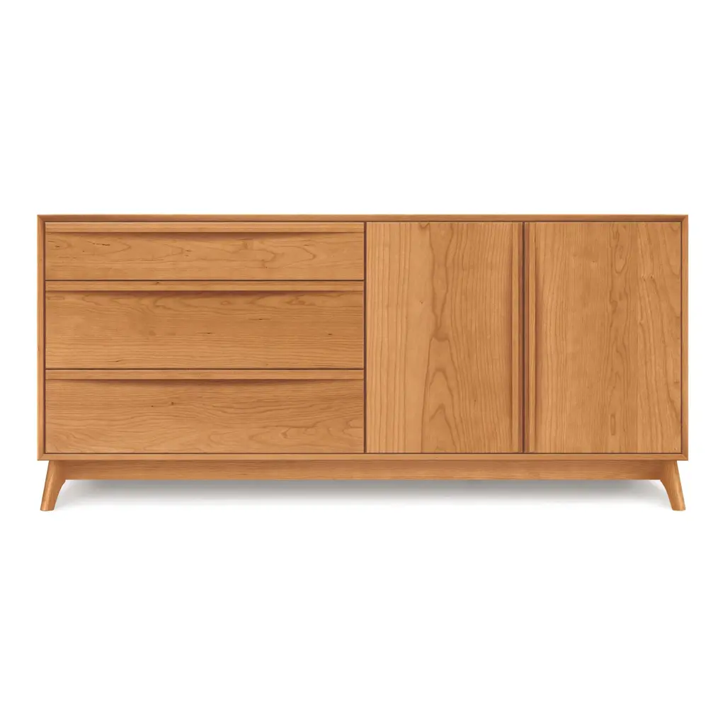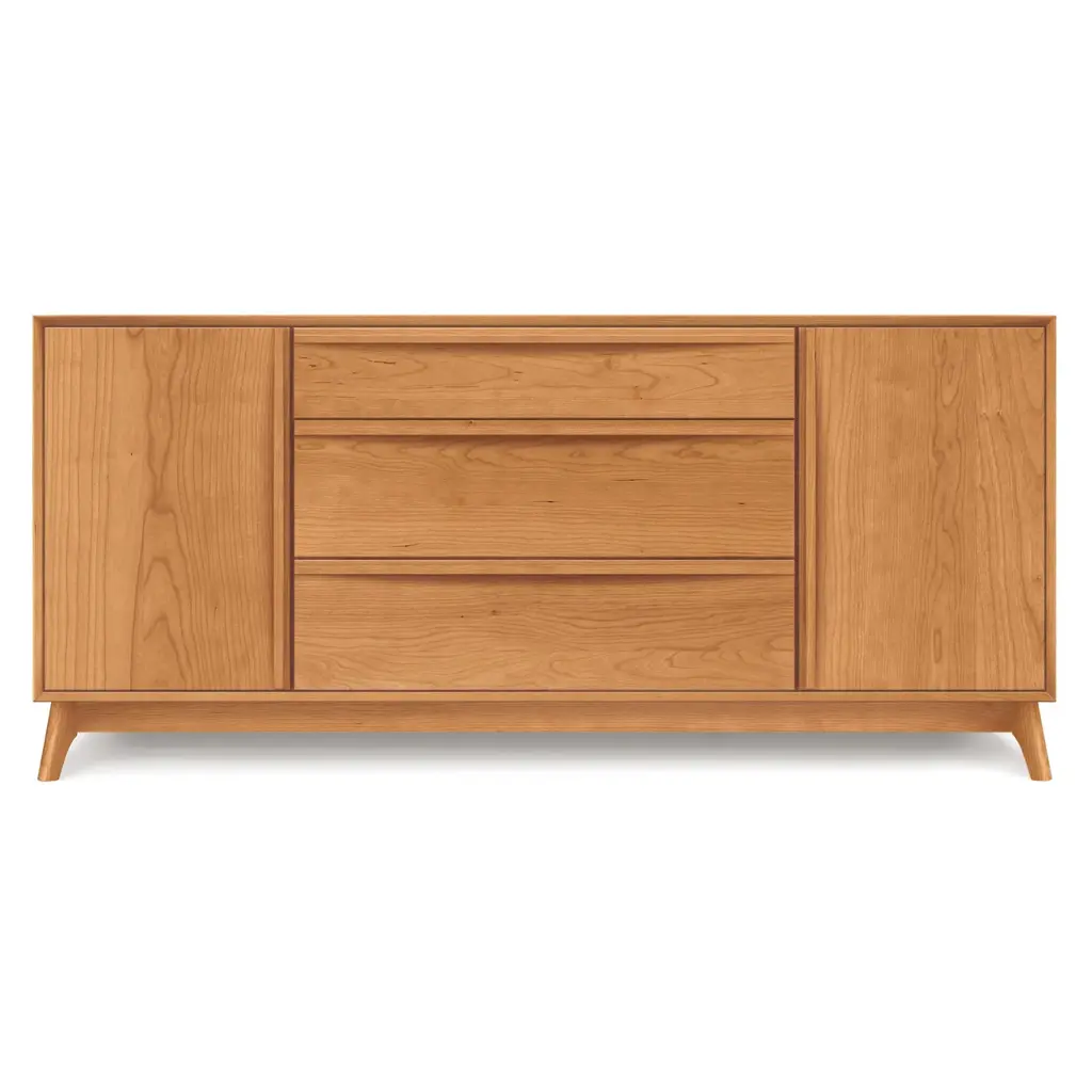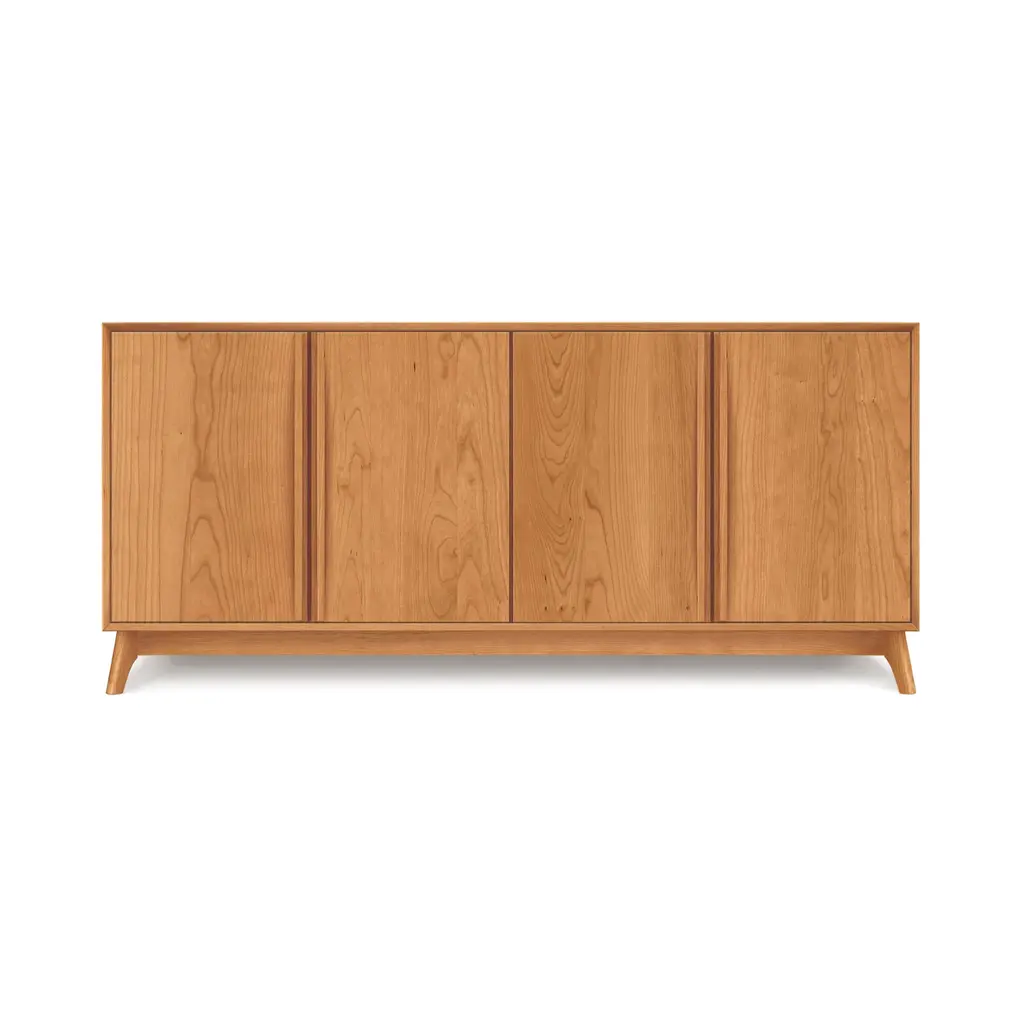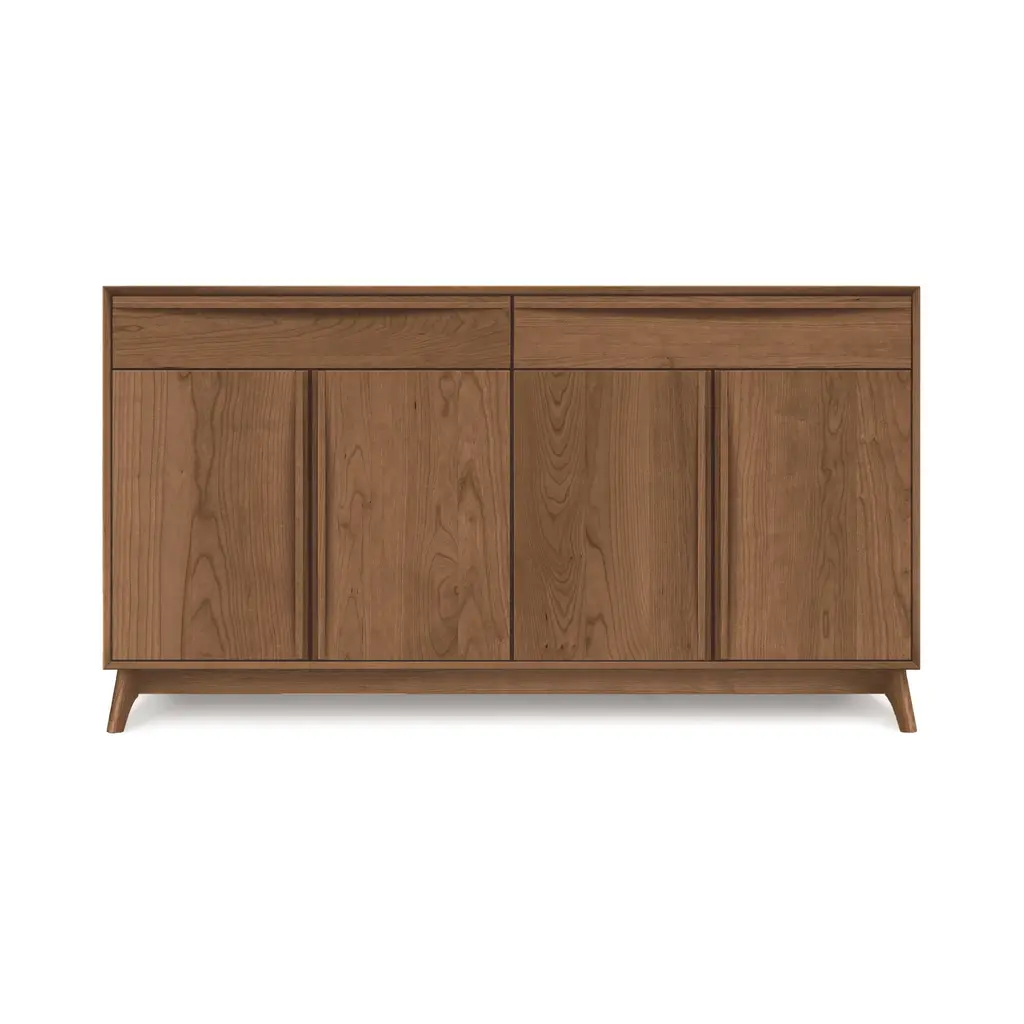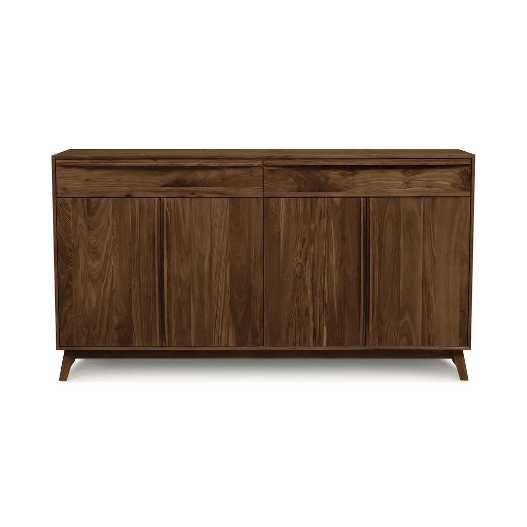Copeland's luxury Catalina 4 Door, 2 Drawer Buffet with adjustable interior shelves and removable silverware tray with Guardian Anti Tarnish lining and cloth for each drawer. Optional hutch top has adjustable / removable shelves for wine bottles and stemware storage.Catalina is real solid wood fine dining furniture crafted for generations of service in your natural home. Custom handmade to order with solid natural North American wood. Best in its class of authentic custom fine dining furniture, this large buffet is destined to be a cherished family heirloom!Mid-century, modern, 1950s American design is what the Copeland Catalina dining furniture collection is all about. Handcrafted in Vermont, with sustainably harvested hardwoods, this collection combines the clean, unadorned lines of the International Modernists with organic and geometric forms.Construction details include 45-degree miter construction where solid wood tops and sides are joined to create a perfectly seamless perimeter. The technique to produce this style requires extreme precision and is only attainable through exacting detail. The leading edge of this modern buffet is beveled to present a thin delicate, line that belies its considerable heft. Custom solid wood throughout, fully finished drawer boxes with solid wood drawer fronts/sides/backs, asymmetrical English dovetails and full-extension, under-mounted, soft close drawer slides (with no visible hardware) for sturdy, smooth operation. Integrated wooden bar pulls running the length of the drawers and doors.Base price represents buffet in natural cherryShown in natural cherryMatching furniture available in our Catalina Furniture CollectionNatural variations in solid wood and hand applied finishes make each piece unique. Slight grain and finish irregularities tell you that the furniture has been crafted from solid wood and are considered hallmarks of quality.