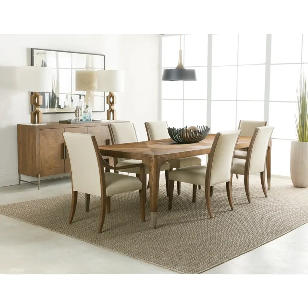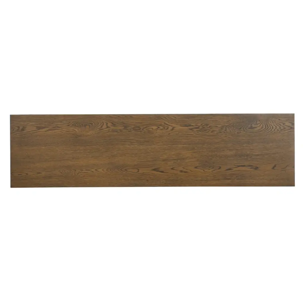 Craftsman style gets a casual modern twist with the Chapman Buffet, constructed of White Oak Veneers with a warm brown Sorrel finish revealing the woodgrain and a refined decorative veneer pattern. Custom hardware in a forged pewter finish is complemented by a thinly-scaled metal base and stretcher. Featuring 4 doors with soft-close hinges, there is one drawer and one adjustable shelf behind each pair of doors, and the left drawer has a removable felt lined silverware tray. Ventilated back panel.