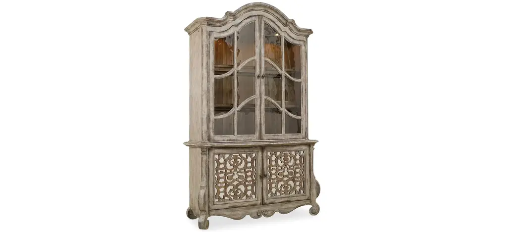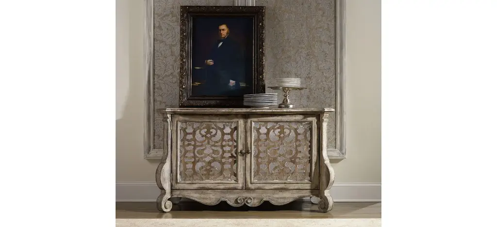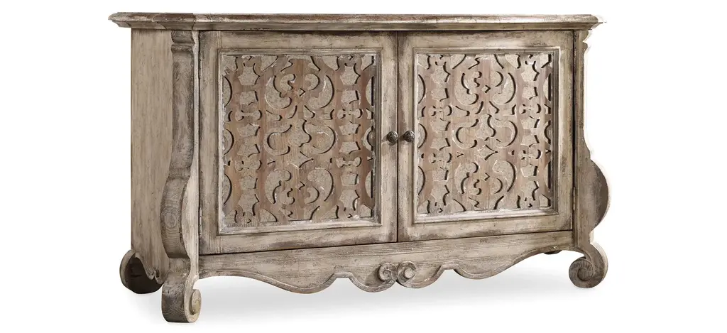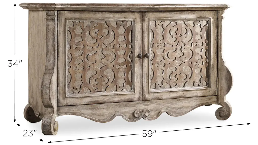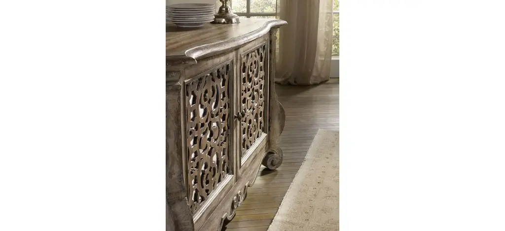 Set a buffet of livable luxury with the timeless Chatelet Buffet, which features two mirrored fretwork doors, a scalloped base and the soft amber Caramel Froth finish. The accent finish is Paris Vintage, a distressed white with fretwork overlay. The burnished bronze drawer pulls are inspired by antiques. One adjustable shelf.