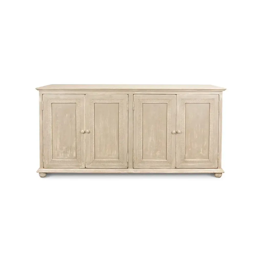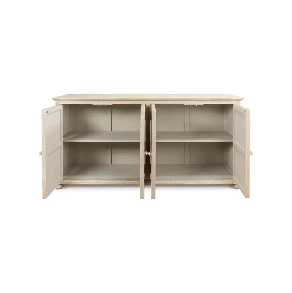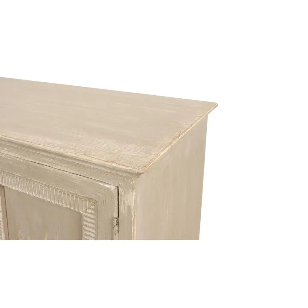 Made of pine with an antiqued and distressed hand-painted finish in a coastal beach beige color. With four doors framed in a classic American pie crust detail. Dimensions: 76" W x 22" D x 36" H