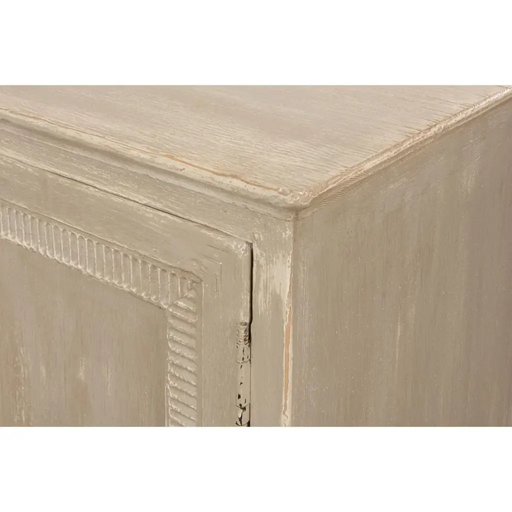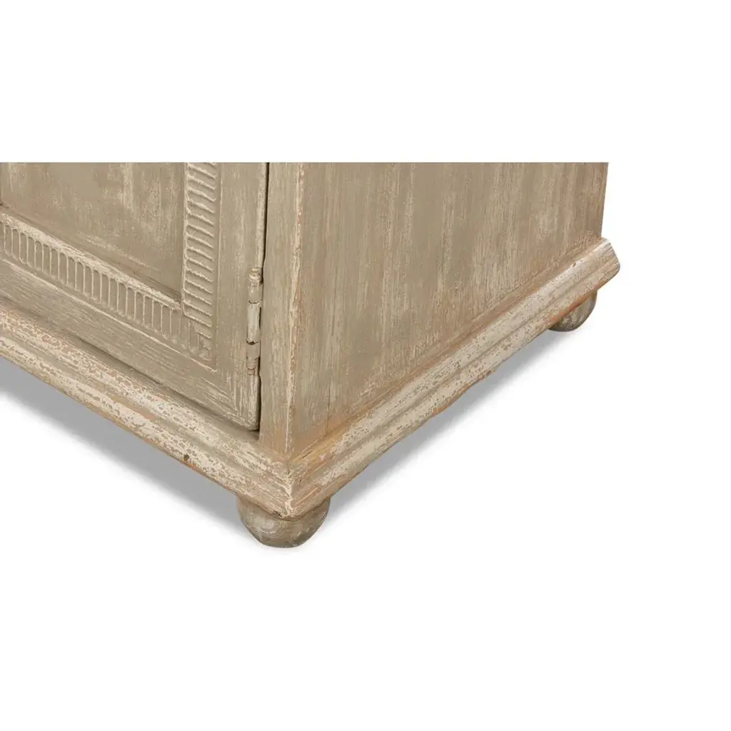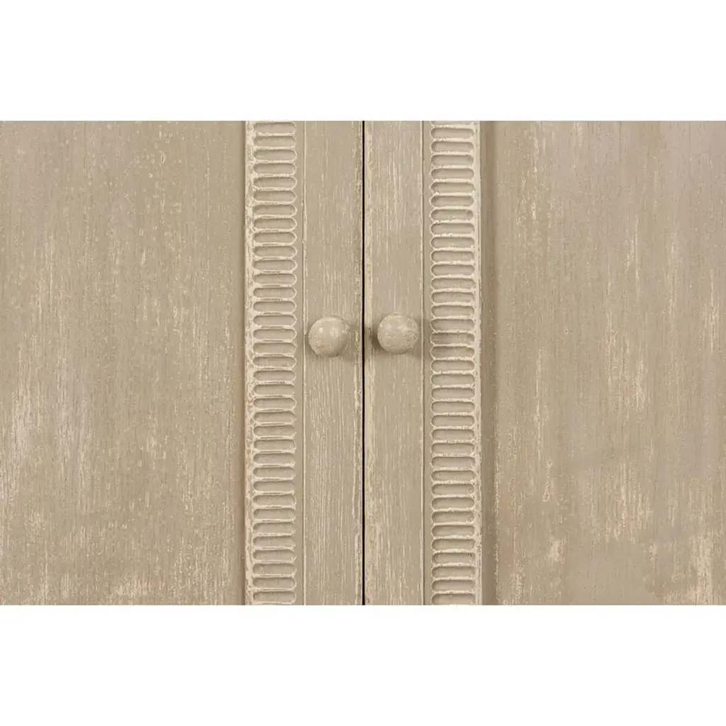 Made of pine with an antiqued and distressed hand-painted finish in a coastal beach beige color. With four doors framed in a classic American pie crust detail. Dimensions: 76" W x 22" D x 36" H