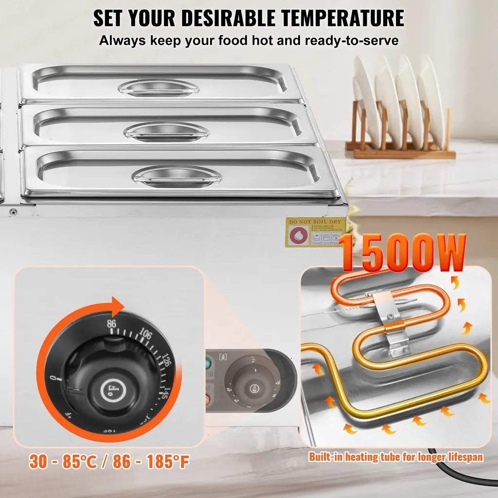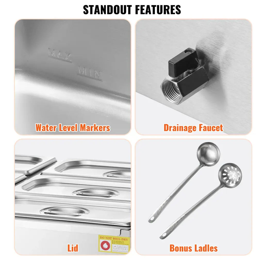 Fast Heating, Lasting Warmth: This impressive food warmer with pans comes with a powerful 1500-watt stainless steel heating tube that rapidly warms up your food to maintain its hot and delicious flavors. You can adjust the temperature output to suit your preference, ranging from 86 - 185℉ / 30 - 85℃, thanks to the temperature controller. Robust Stainless Steel Build: This food warmer is built to last, with a sturdy all-stainless steel construction that can withstand constant use, and is easy to clean and maintain. The well has a thickened wall (0.03" / 0.8 mm thick) that provides additional sturdiness and has a secure water seal. Additional Security: We have upgraded our food warmer with newly designed "Dry Burning Indicator" and "Reset Button". The dry-burning indicator function automatically stops heating the food when the temperature exceeds 248°F (120°C). To resume operations, you need to press the Reset Button. Details Made for You: The well is thoughtfully designed with water level markers inside for effortless water maintenance. The container features a faucet for draining water after use, reducing the hassle of cleaning the machine's interior. Additionally, two extra long-handled ladles are included, perfectly suited for deep pots. Includes 4 Pans / 6 Pans: Our commercial food warmer comes with 4 x 8qt / 6 x 5qt food pans accompanied by their respective lids, allowing you to serve different dishes simultaneously. Feel free to change up your menu from soups and sauces to stew, or even nacho cheese and chocolate. Package Content 1 x Food Warmer 4 x 1/2 Size Food Pan / 6 x 1/3 Size Food Pan 4 x Lid / 6 x Lid 1 x Teflon Tape 1 x Drainage Faucet 1 x Soup Ladle 1 x Slotted Spoon