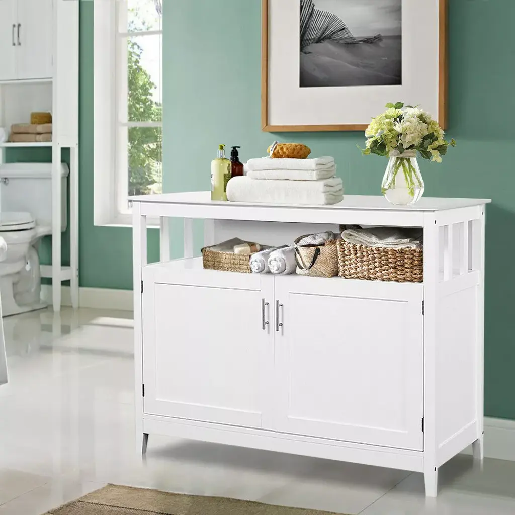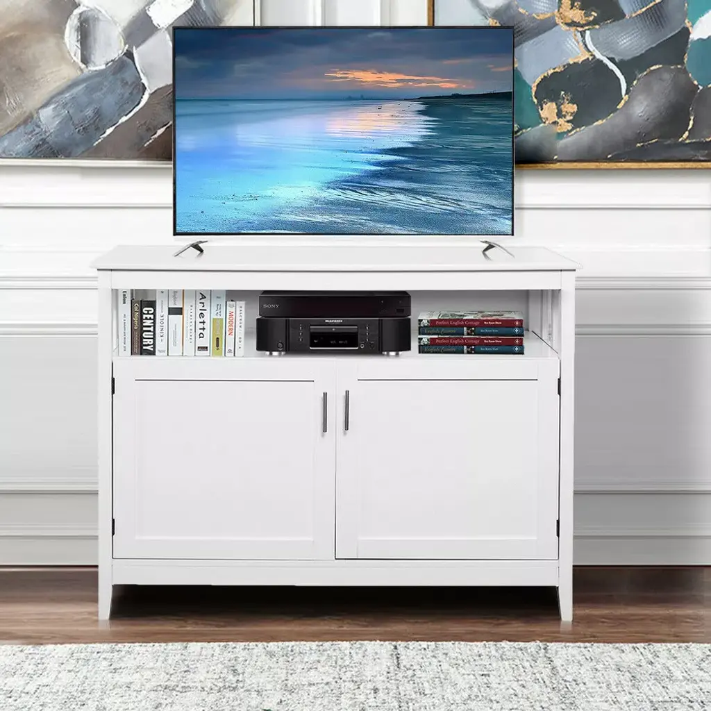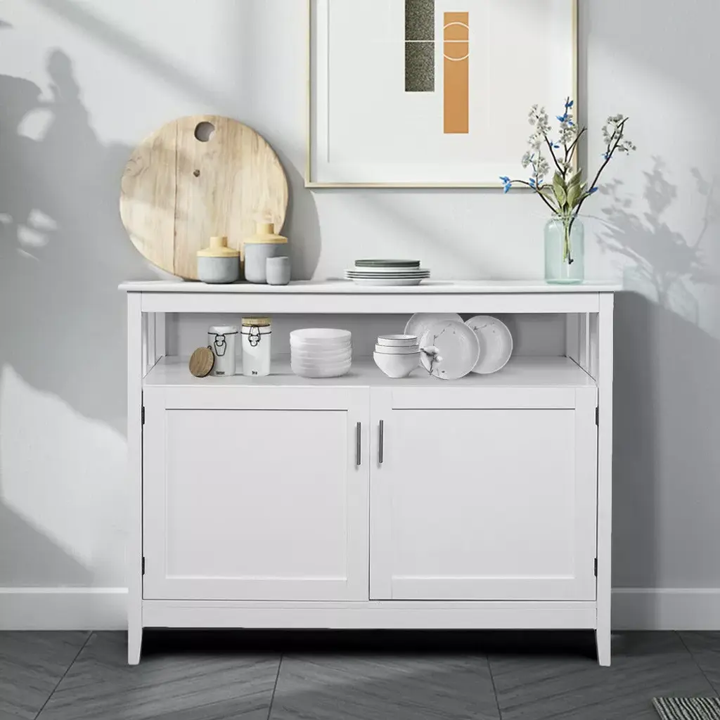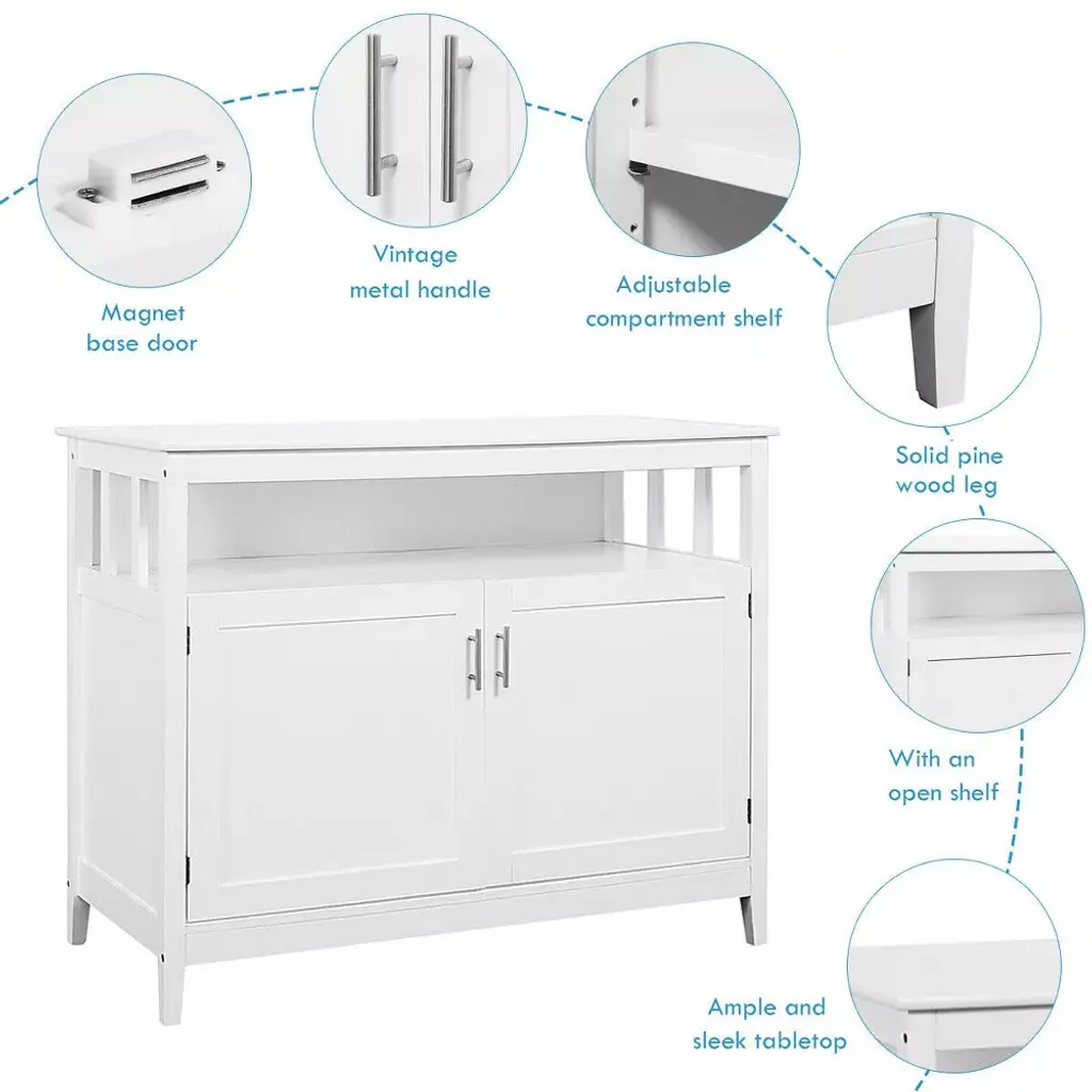 This is our kitchen storage cabinet, which is a perfect to fit your kitchen or dining room and provides you with a unmatched convenience. It features a big two doors storage cabinet for all your kitchen gadgets and tools, making it a tremendous value as well as a great space saver for your kitchen. It come with a spacious top and an open shelf that is great for storage or display. Plus, the solid wood construction provides years of sturdy and reliable use. Host dinner parties and prepare great meals with this wonderful kitchen cabinet!FeaturesMade of sturdy painted wood composite A large two doors storage cabinet Spacious top and an open shelfSpace-saving designContemporary style with clean linesIdeal for kitchen, dining room and restaurantAssembly requirementassembly video https://youtu.be/1VAYTyJXxIQColor: White Material: MDF, Pine Overall size: 45"L×20" W×36" H Weight Capacity of Tabletop: 120 lbs Weight Capacity of Open Shelf: 70 lbs Weight Capacity of Inside Shelf: 50 lbs Total Weight Capacity: 290 lbs Package includes: 1 × Kitchen cabinet 1 × Instruction
