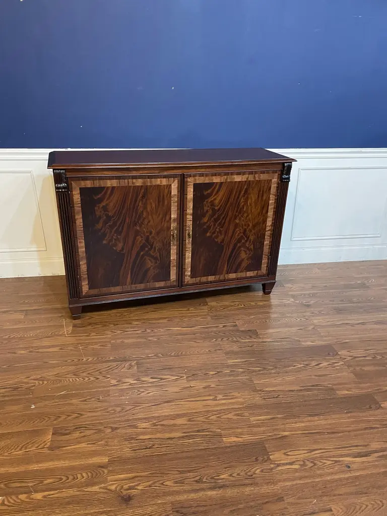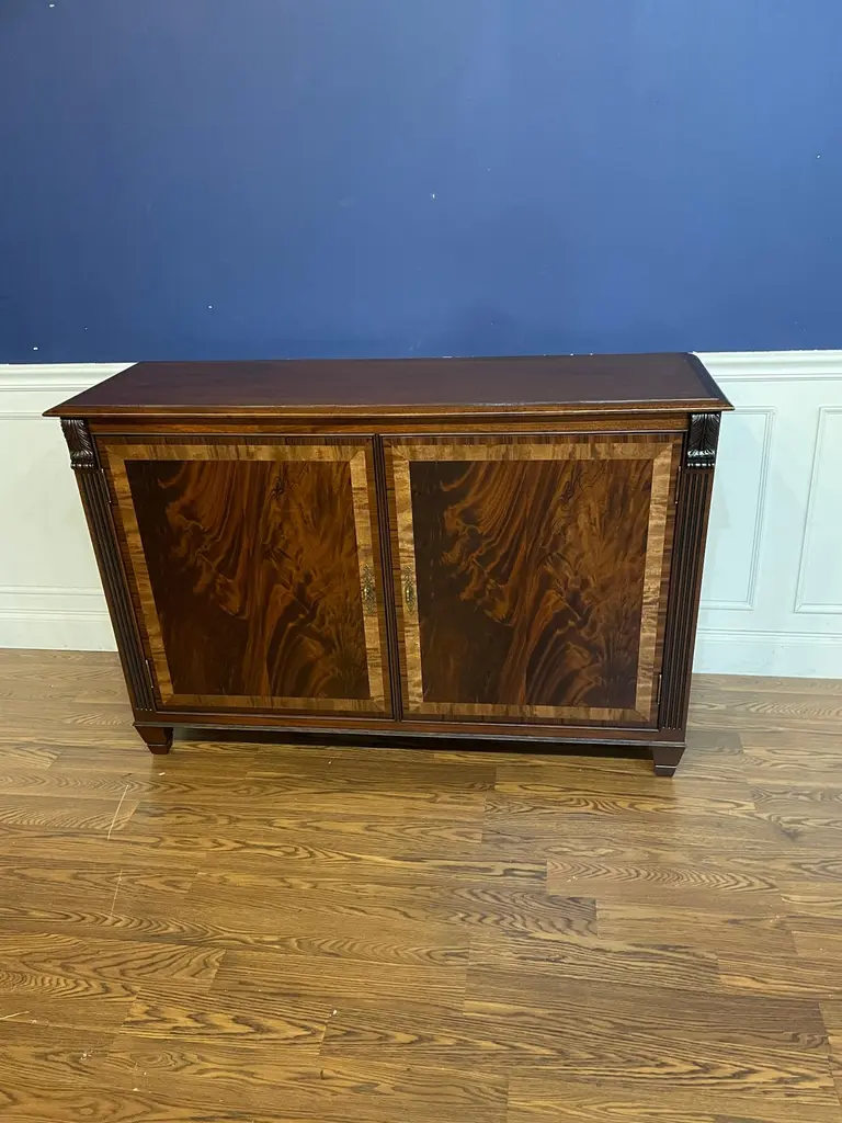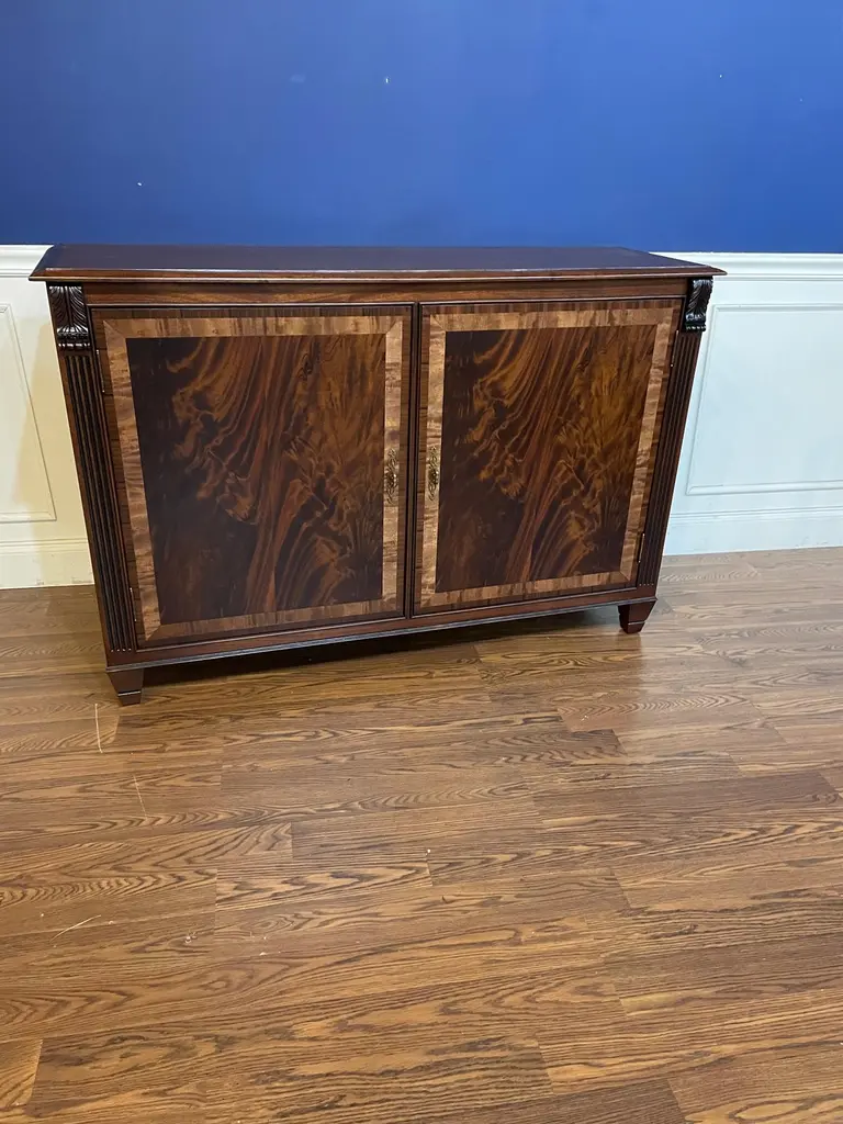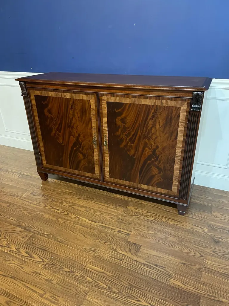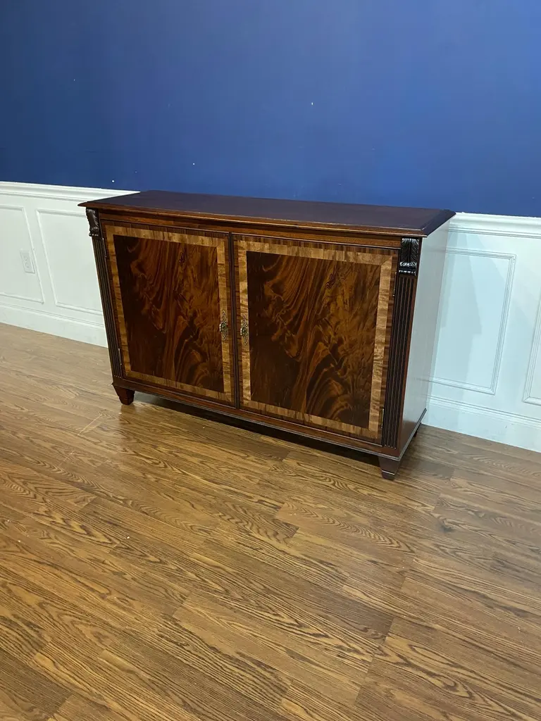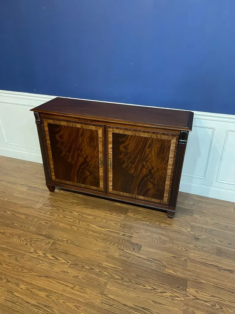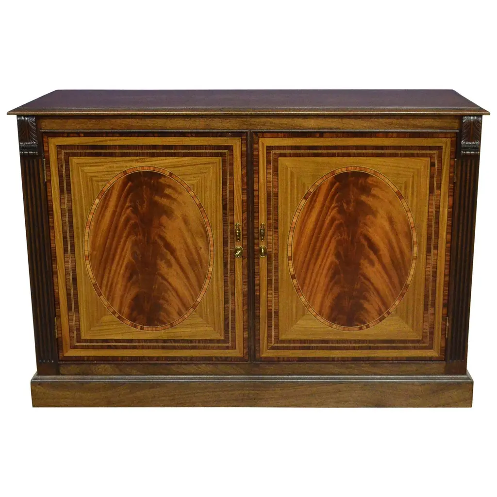 This is made-to-order traditional mahogany two door buffet or credenza made in the Leighton Hall shop. It features two doors with reverse-slip-match swirly crotch mahogany fields and Satinwood and Santos Rosewood (Pau Ferro) borders. It has a cathedral mahogany top with a traditional ogee profile edge. The corner posts are fluted with carvings at the top. The feet are square and tapered with a classic Hepplewhite influence. There are adjustable shelves behind the doors. It has a satin finish.Dimensions: Width: 54 1/4 in., Depth: 17 1/2 in., Height: 36 in.This piece can be purchased as shown or we can make a custom piece in our shop to your size and specifications. Optional features include: width, depth, height, door inlay design, door post design, foot design, addition of drawers behind doors, door locks and finish.