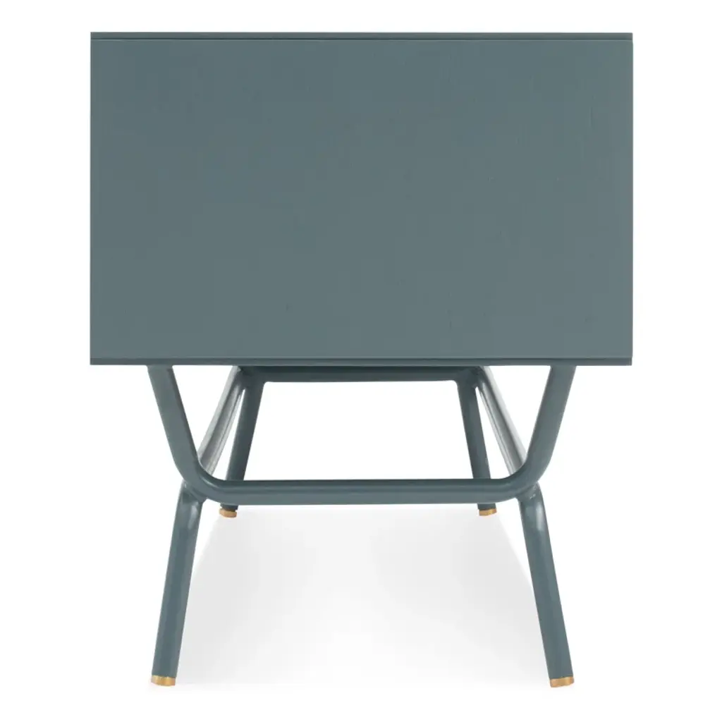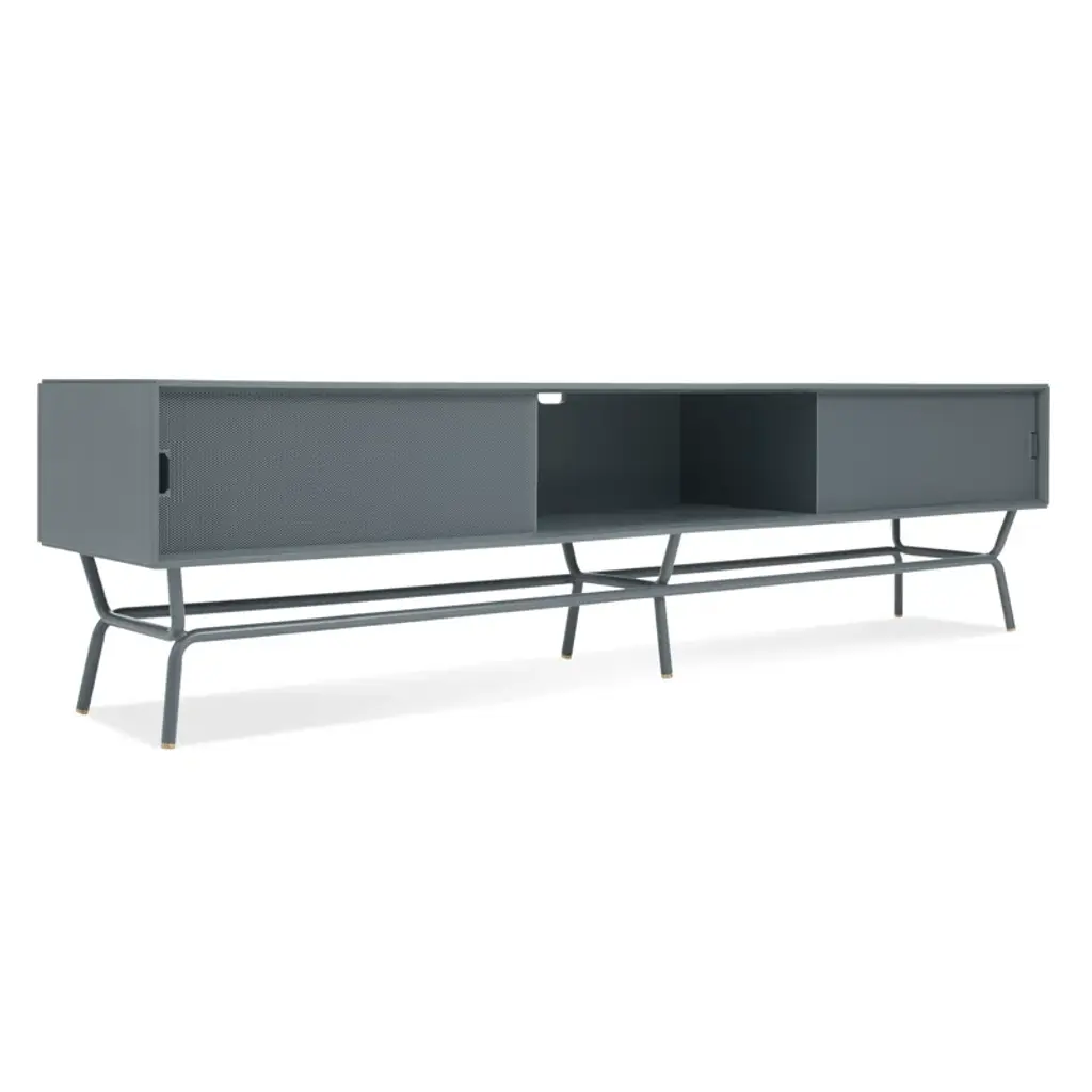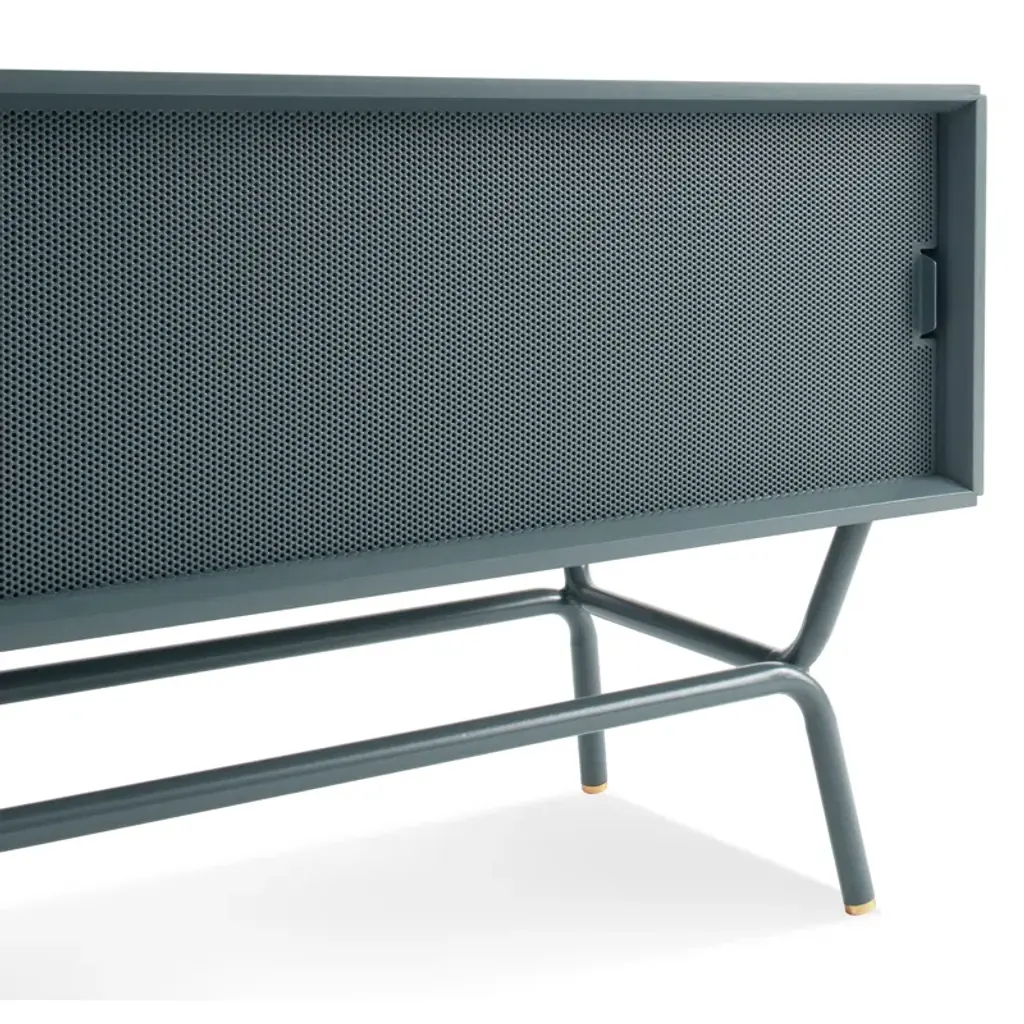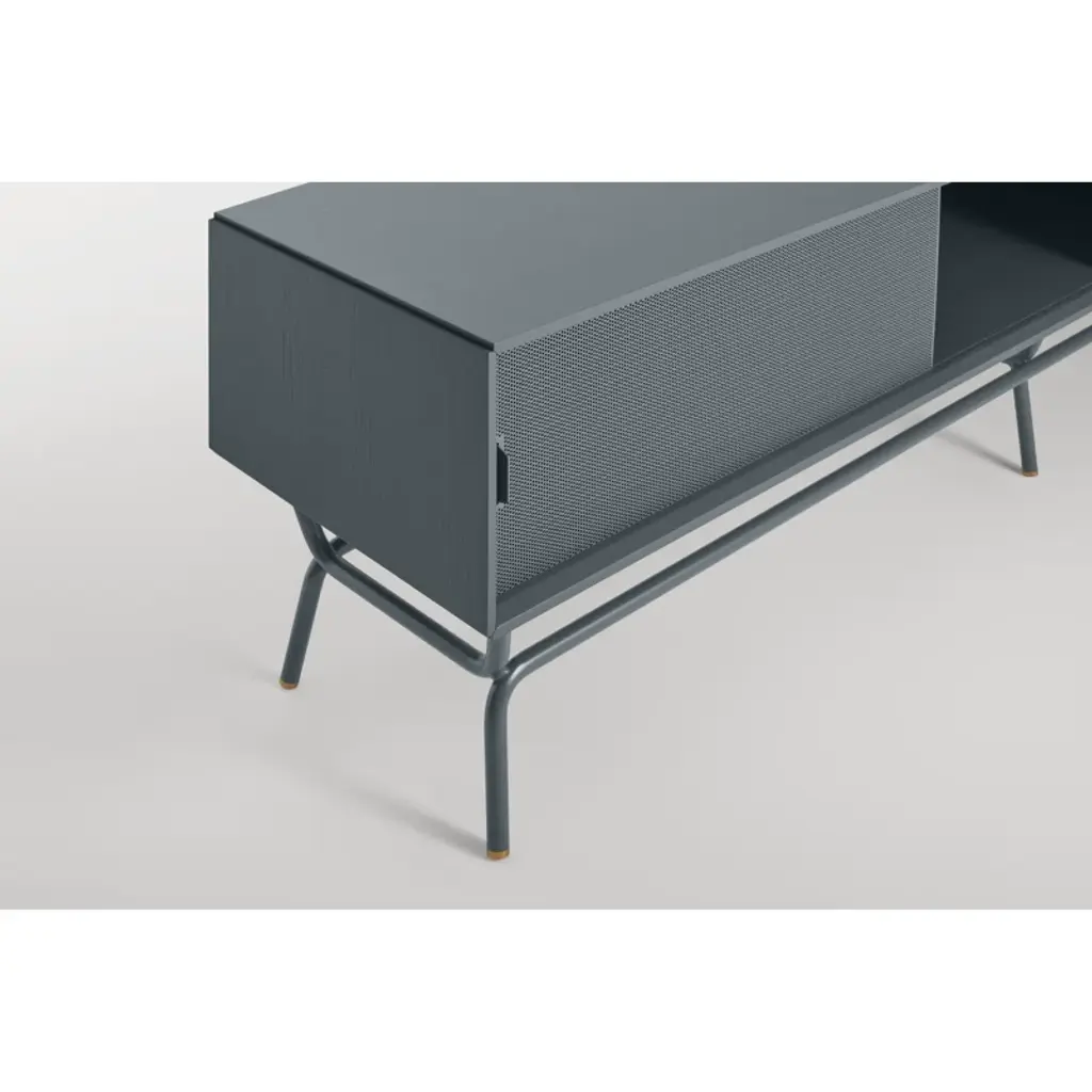 The perforated steel door front allows the use of remotes without spoiling the view. With cord management escapes in the back panel.
