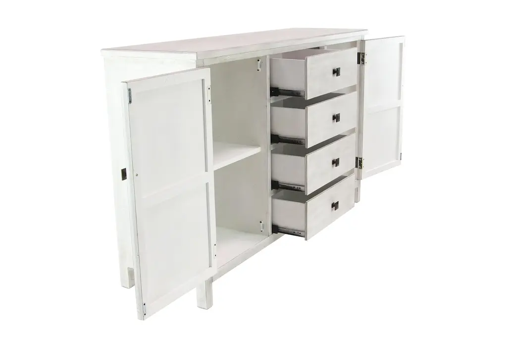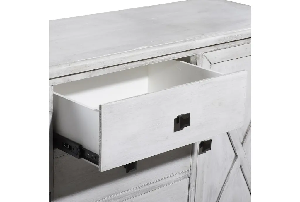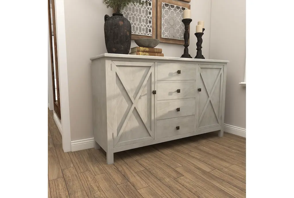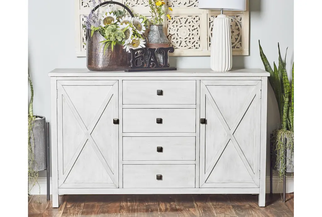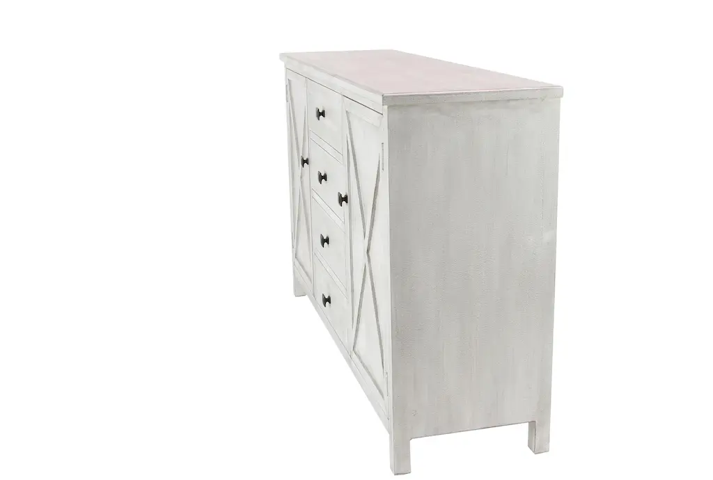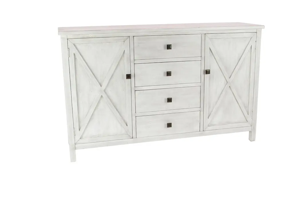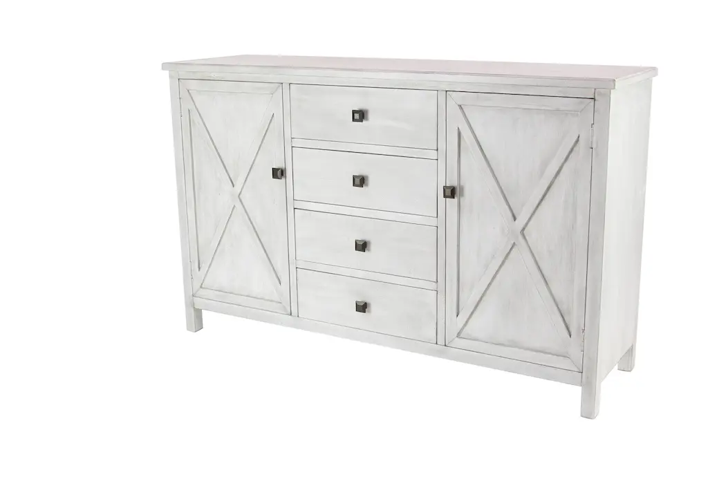 Bring a finishing touch to your home with an inviting appeal with this expertly crafted buffet sideboard. A stylish way to keep you organize and your belongings safe and protected. Create an rustic display with this storage unit and decorate it with large organic vases on top of books under an oversized wall mirror. Comes with spacious cabinet interior measuring 17”L x 15”W x 28”H . This item ships in 1 carton. White buffet features 4 drawers with 20 lbs weight limit. Cabinet with drawers painted cool white with a faint, textural gray wash finish, decorative, dimensional, dark gray metal square pull handles on each drawer and cabinet and X-shaped wood pieces across the 2 large side cabinets for a Farmhouse style touch. Suitable for indoor use only. This item ships fully assembled in one piece. Maximum weight limit is 30 lbs. This is a single white colored sideboard. Mdf buffet features 2 shelves. Farmhouse style.