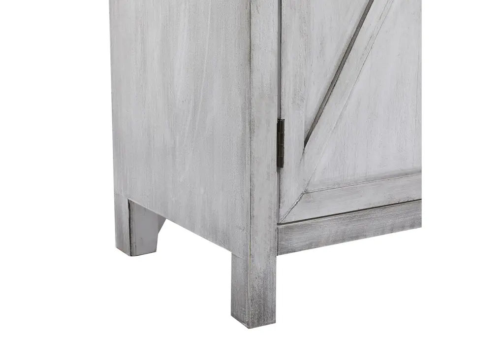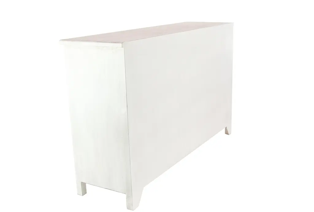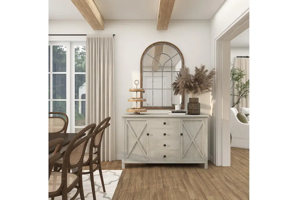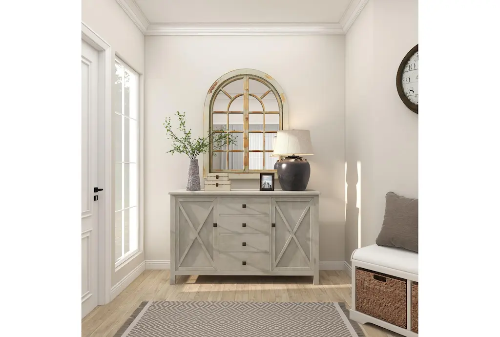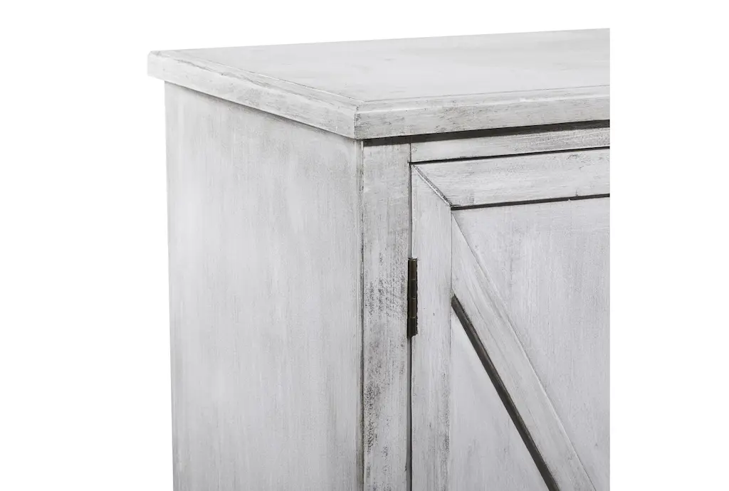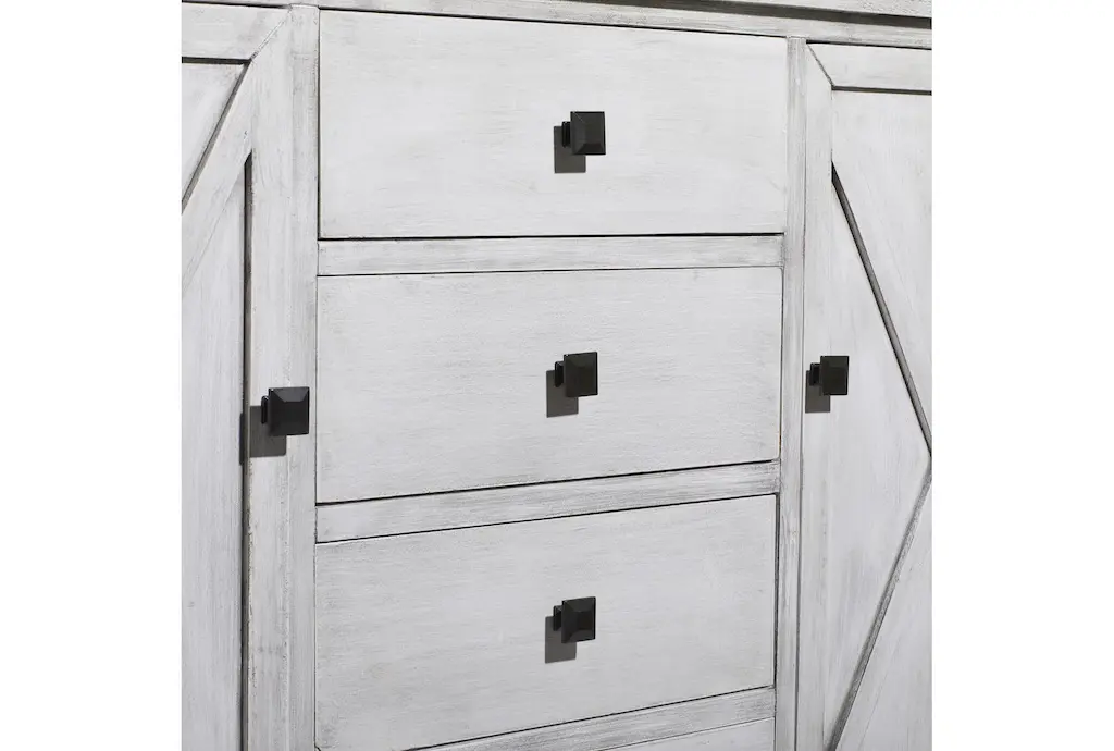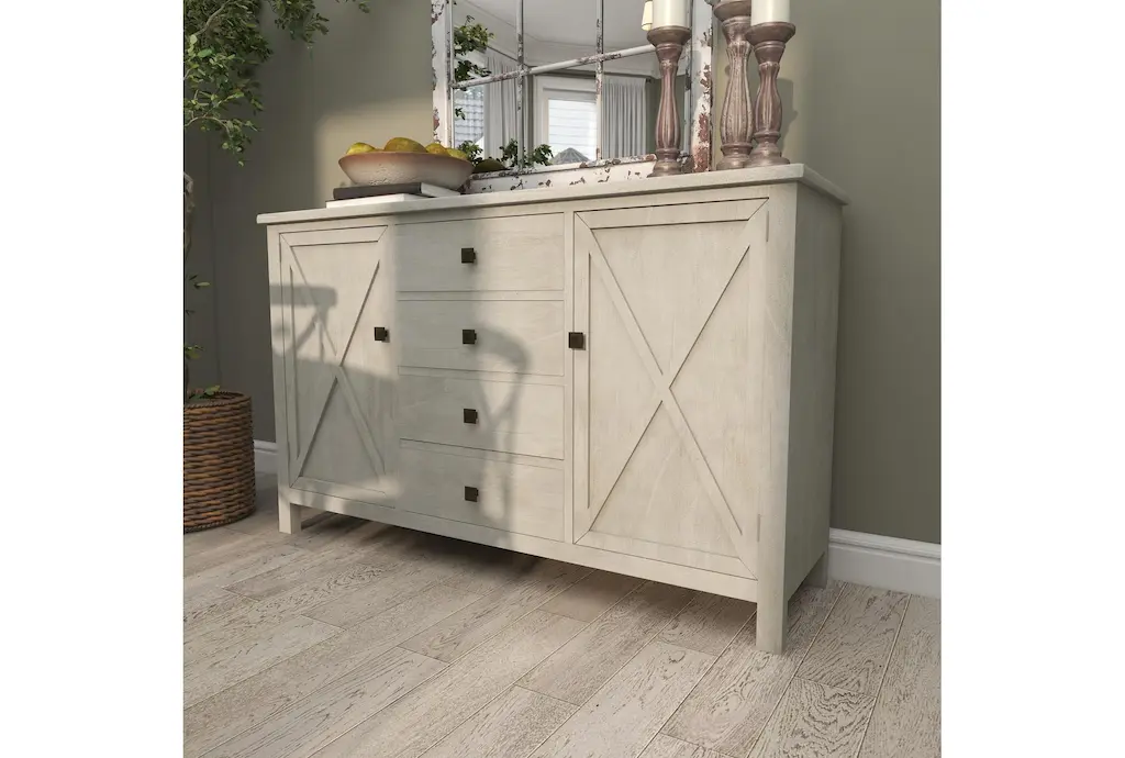 Bring a finishing touch to your home with an inviting appeal with this expertly crafted buffet sideboard. A stylish way to keep you organize and your belongings safe and protected. Create an rustic display with this storage unit and decorate it with large organic vases on top of books under an oversized wall mirror. Comes with spacious cabinet interior measuring 17”L x 15”W x 28”H . This item ships in 1 carton. White buffet features 4 drawers with 20 lbs weight limit. Cabinet with drawers painted cool white with a faint, textural gray wash finish, decorative, dimensional, dark gray metal square pull handles on each drawer and cabinet and X-shaped wood pieces across the 2 large side cabinets for a Farmhouse style touch. Suitable for indoor use only. This item ships fully assembled in one piece. Maximum weight limit is 30 lbs. This is a single white colored sideboard. Mdf buffet features 2 shelves. Farmhouse style.