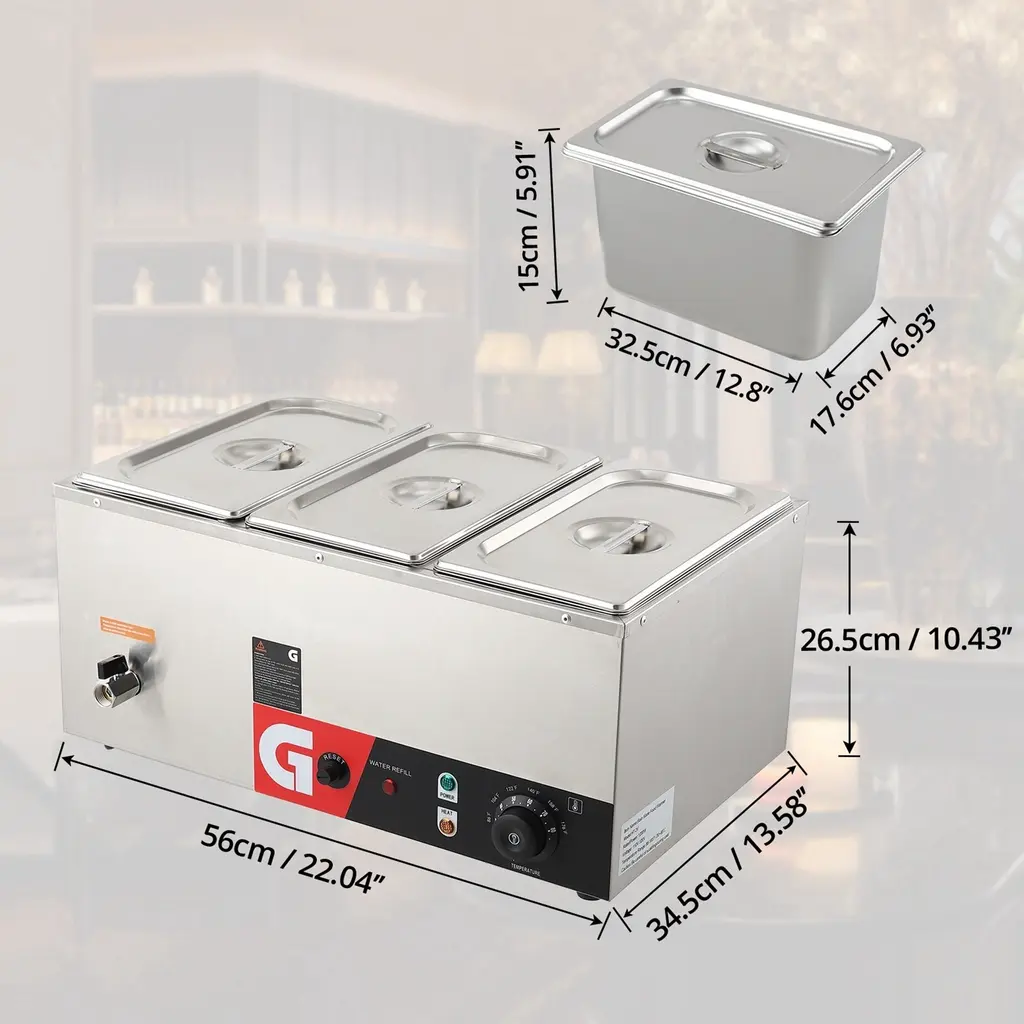 Efficient and Uniform Heating - This electric countertop food warmer features a powerful 1200-watt stainless steel heating tube that quickly warms your food. Thanks to its specially designed internal heating elements, this warmer keeps your prepared dishes at ready-to-eat temperatures for hours. The U-shaped design ensures even heat distribution for consistent results.Long-lasting Insulation - The electric food warmer comes with a temperature-adjustable knob for effective heat preservation. It maintains food temperatures between 86-185°F, so you can enjoy warm meals whenever you like!Considerate Details - Each pan is accompanied by a practical notched lid, cleverly designed to maintain warmth while sealing in flavor. This electric food warmer also features a drainage faucet for easy water release. Plus, we've included a soup ladle and a perforated ladle for effortless serving.Food-Grade Stainless Steel - The food-grade stainless steel construction ensures this countertop food warmer is resistant to rust and corrosion. The thickened walls provide durability and sturdiness, putting your mind at ease about deformation or scratches. Additionally, the detachable pans make cleaning and maintenance a breeze.Wide Application - Keep your steaming vegetables, chicken wings, fluffy eggs, or sizzling bacon hot and ready to serve with this steam table food warmer. It's a perfect, space-saving addition to your buffet, concession stand, home-style restaurant, cafeteria, or hotel breakfast bar, built to meet daily demands with ease.