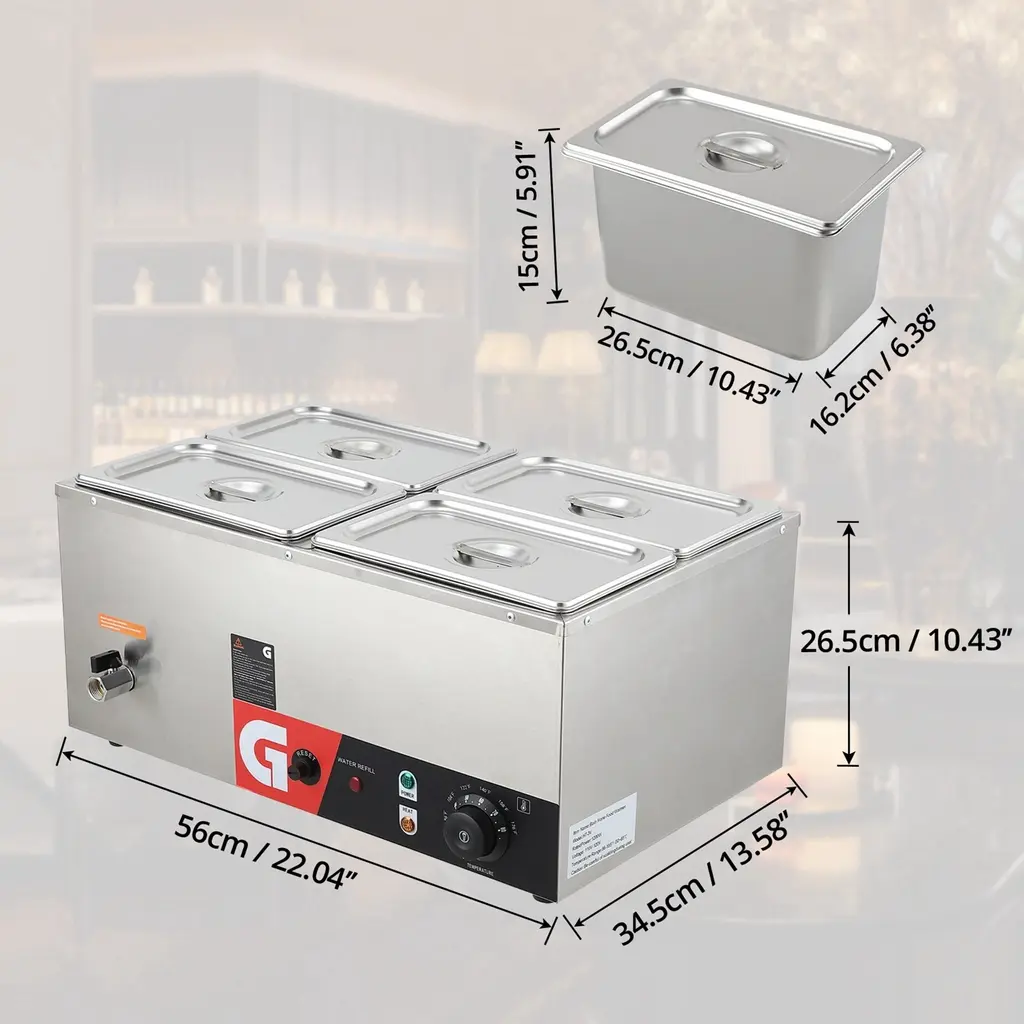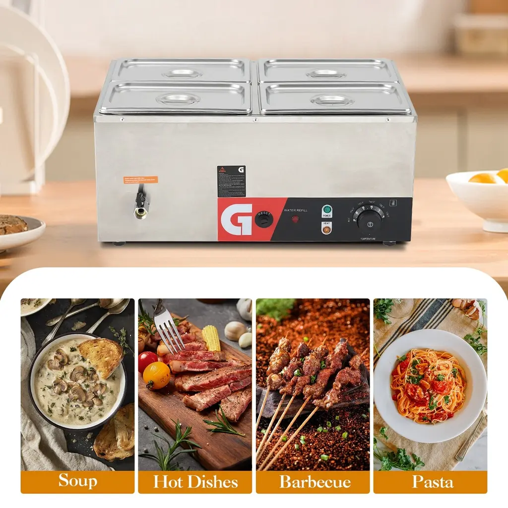Efficient and Uniform Heating - This electric countertop food warmer features a powerful 1200-watt stainless steel heating tube that quickly warms your food. Thanks to its specially designed internal heating elements, this warmer keeps your prepared dishes at ready-to-eat temperatures for hours. The U-shaped design ensures even heat distribution for consistent results.Long-lasting Insulation - The electric food warmer comes with a temperature-adjustable knob for effective heat preservation. It maintains food temperatures between 86-185°F, so you can enjoy warm meals whenever you like!Considerate Details - Each pan is accompanied by a practical notched lid, cleverly designed to maintain warmth while sealing in flavor. This electric food warmer also features a drainage faucet for easy water release. Plus, we've included a soup ladle and a perforated ladle for effortless serving.Food-Grade Stainless Steel - The food-grade stainless steel construction ensures this countertop food warmer is resistant to rust and corrosion. The thickened walls provide durability and sturdiness, putting your mind at ease about deformation or scratches. Additionally, the detachable pans make cleaning and maintenance a breeze.Wide Application - Keep your steaming vegetables, chicken wings, fluffy eggs, or sizzling bacon hot and ready to serve with this steam table food warmer. It's a perfect, space-saving addition to your buffet, concession stand, home-style restaurant, cafeteria, or hotel breakfast bar, built to meet daily demands with ease.