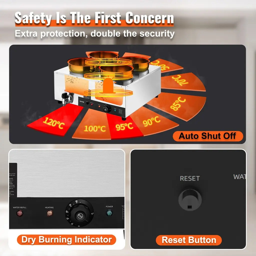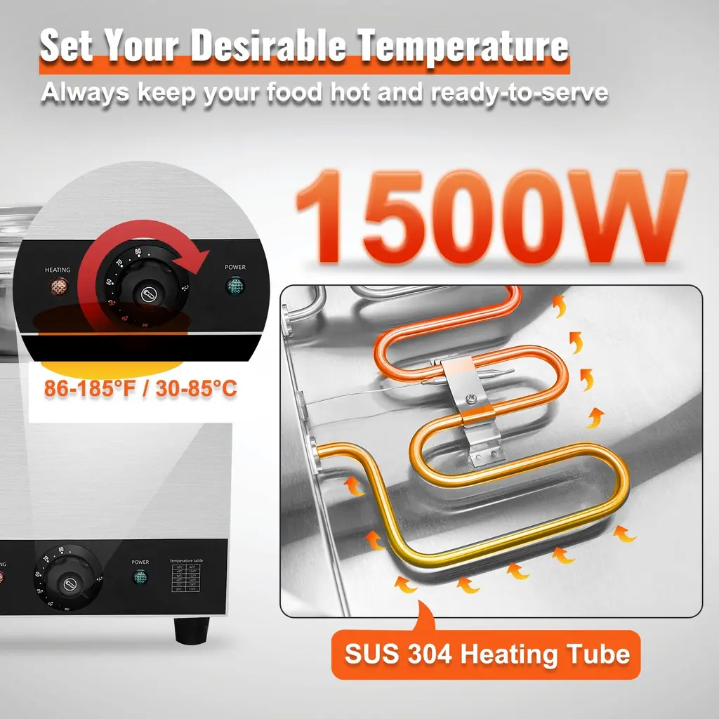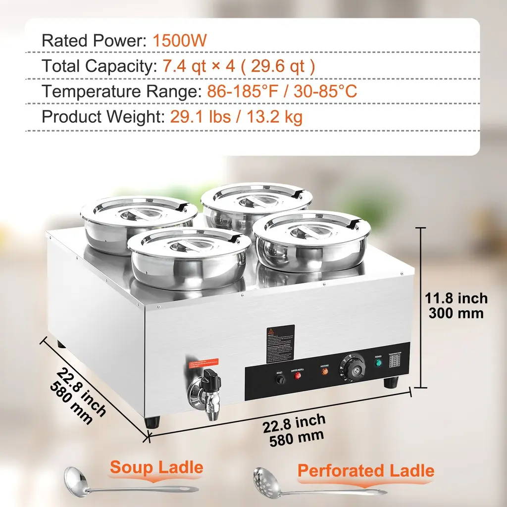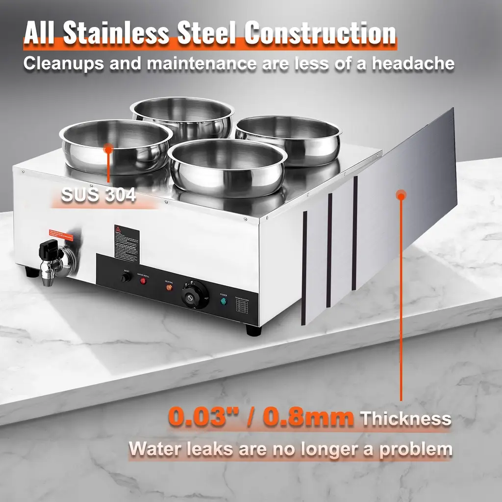Fast Heating, Lasting Warmth: This impressive food warmer comes with a powerful 1500-watt stainless steel heating tube that rapidly warms up your food to maintain its hot and delicious flavors. You can adjust the temperature output to suit your preference, ranging from 86 - 185℉ / 30 - 85℃, thanks to the temperature controller. Robust Stainless Steel Build: Built with all stainless steel material, cleanups and maintenance are less of a headache. The stainless steel pot ensures added durability and peace of mind, while the thickened wall (0.03" / 0.7 mm) provides sturdiness and has a secure water seal. Additional Security: We have upgraded our food warmer with newly designed "Dry Burning Indicator" and "Reset Button". The dry-burning indicator function automatically stops heating the food when the temperature exceeds 248°F (120°C). To resume operations, simply refill the water and press the Reset Button. Details Made for You: The soup pot is thoughtfully designed with water level markers inside for effortless water maintenance. The container features a faucet for draining water after use, reducing the hassle of cleaning the machine's interior. Additionally, two extra long-handled ladles are included, perfectly suited for deep pots. Includes Four 7.4Qt Soup Pots: Our commercial soup warmer comes equipped with Four 7.4Qt round pots with their respective lids, allowing you to serve different dishes simultaneously. Feel free to change up your menu from soups and sauces to stew, or even nacho cheese and chocolate. Package Content 1 x Soup Warmer 4 x Soup Pot 7.4qt 1 x Teflon Tape 1 x Drainage Faucet 1 x Soup Ladle 1 x Slotted Spoon