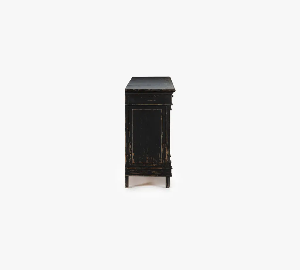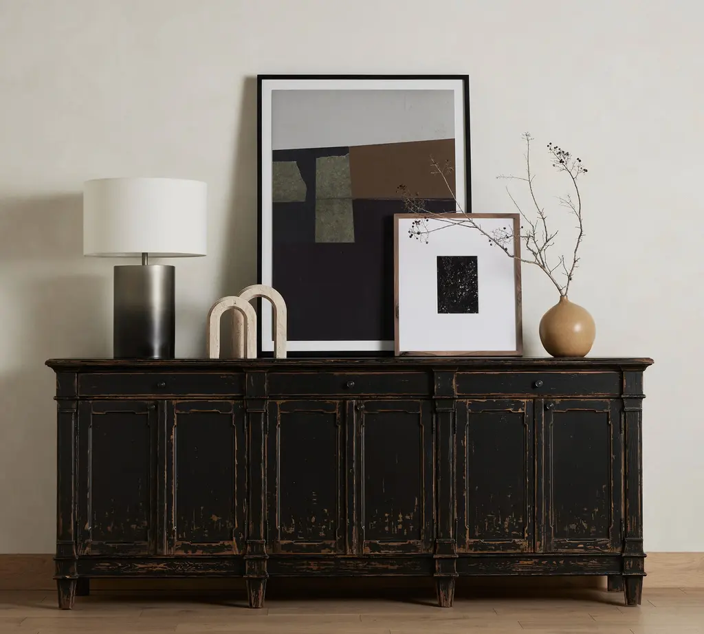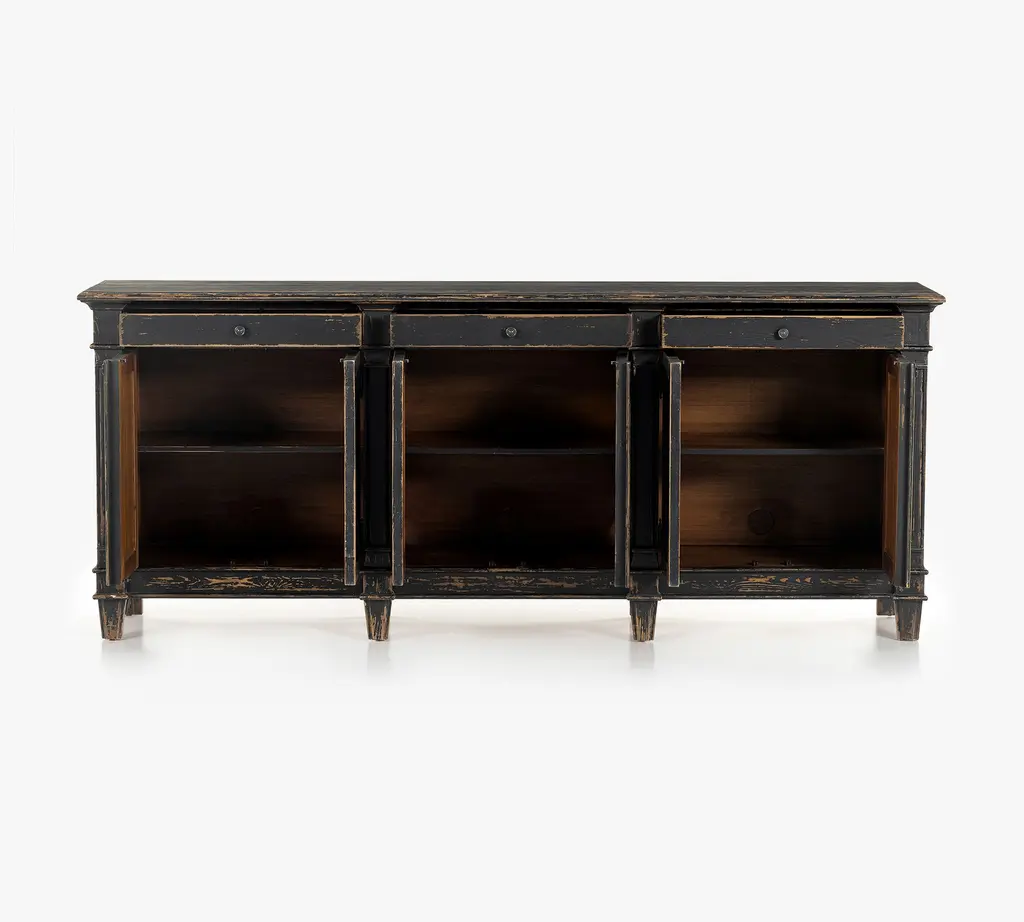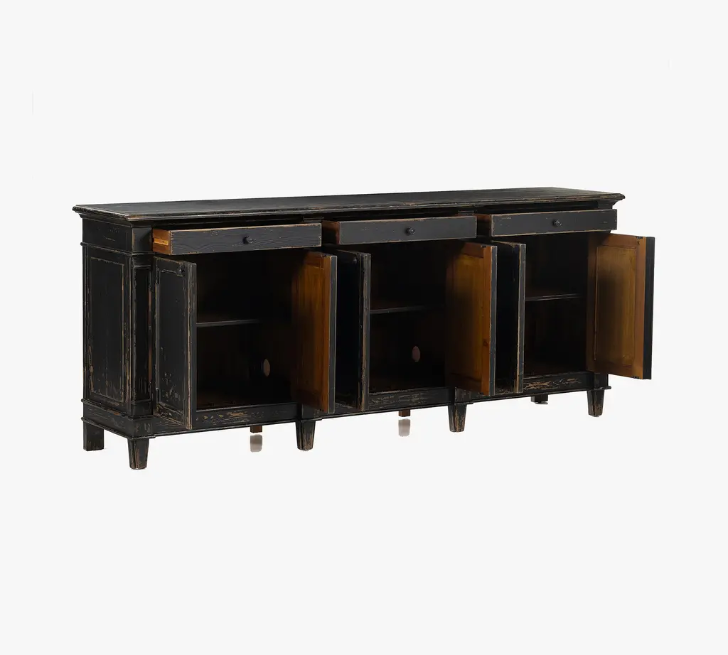 Inspired by European antiques, our solid pine sideboard is hand finished for a weathered look. Grand in scale with plenty of interior storage, it features three drawers for linens, plates, and accessories. Perfect for a dining or living space, it’s ideal with farmhouse or classic styles.