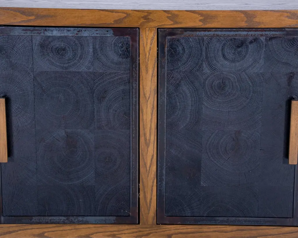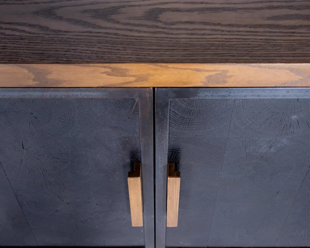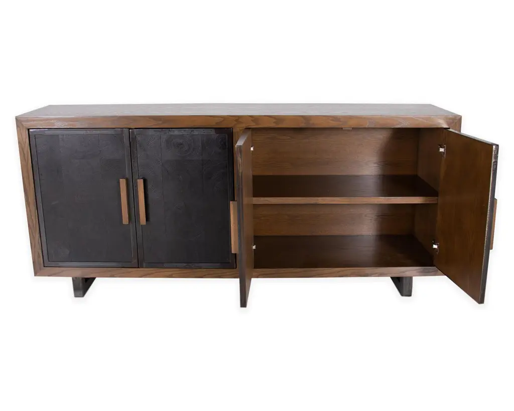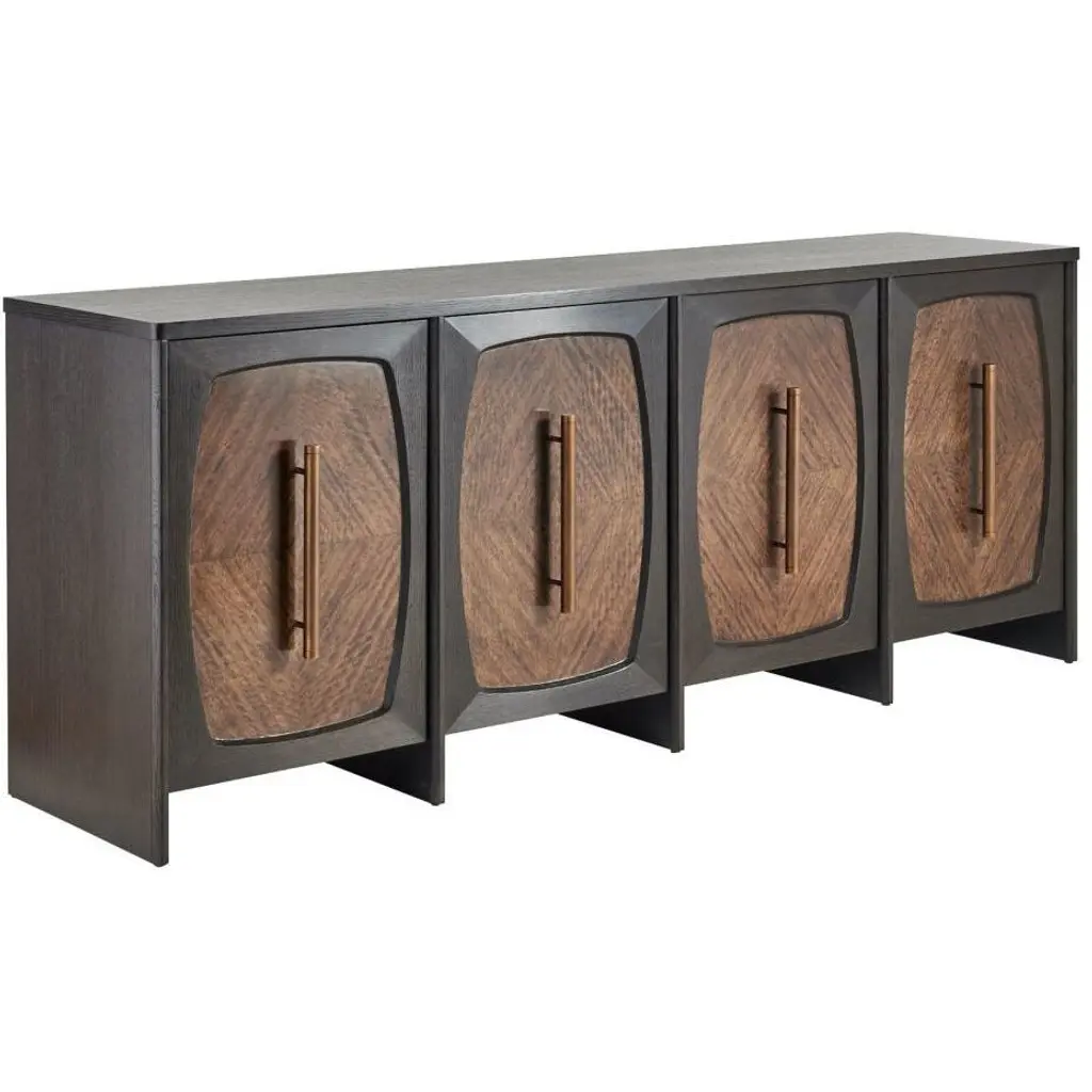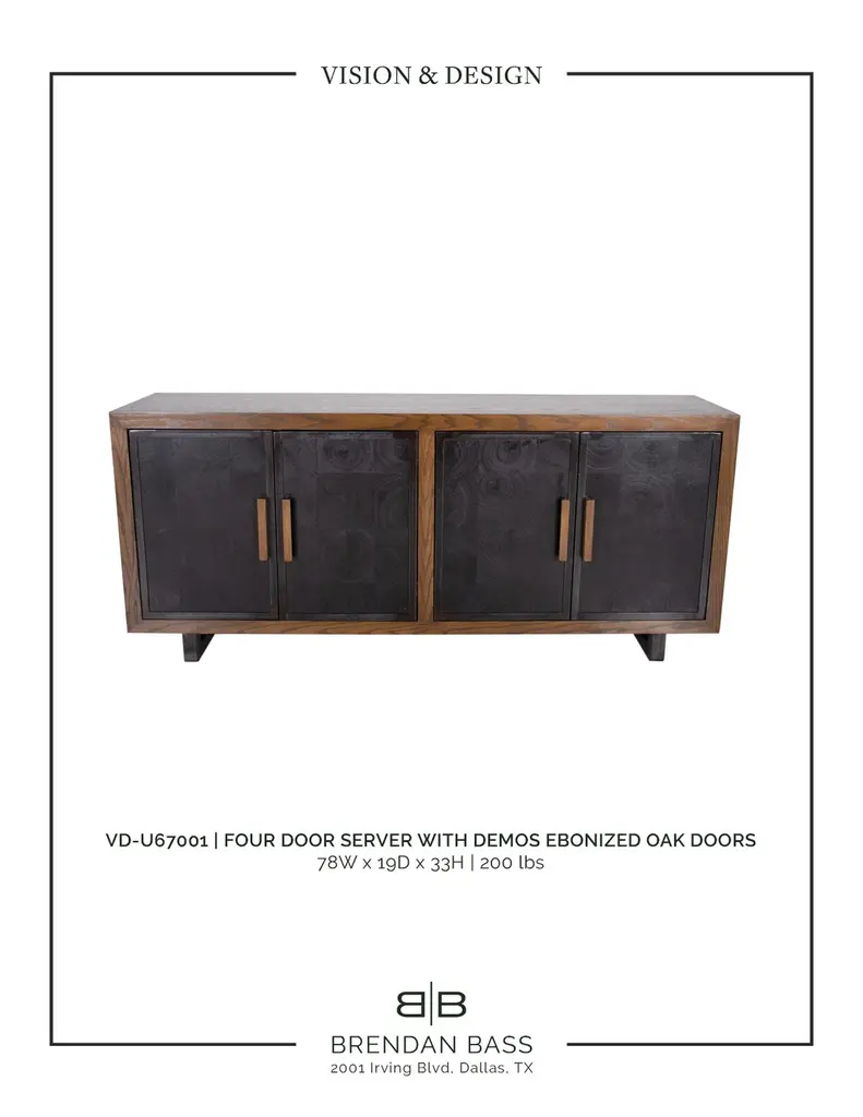 Four door server in oak with a bombay finish, demos ebonized oak doors, and ebony patina. Designed by Brendan Bass for the Vision and Design Collection, by using high quality materials and textures. All materials are sourced from local vendors throughout the state of Texas. The sleek, flowing lines exude a clean, contemporary look that is perfect for today's living spaces. Hand-crafted by Brendan’s select team of highly experienced Artisans, all located in Dallas. Each craftsperson leaves their own unique touch on each piece, making a truly one-of-a-kind piece of art.The Vision and Design experience is hands-on from the beginning. Clients have the ability to adjust all shapes, sizing, and dimensions. Coloring and finish can be customized as well from our deep selection of unique and eye-catching samples. Ranging from high quality stones, water-stained wood, and patinated metals.The price of the listing is representative of the exact piece pictured. If sizing, coloring, or other customization is changed please anticipate pricing to change accordingly. The current lead time for custom pieces is 10-12 weeks.This item is crafted from natural materials. Coloring and detailing may vary, adding to its uniqueness.