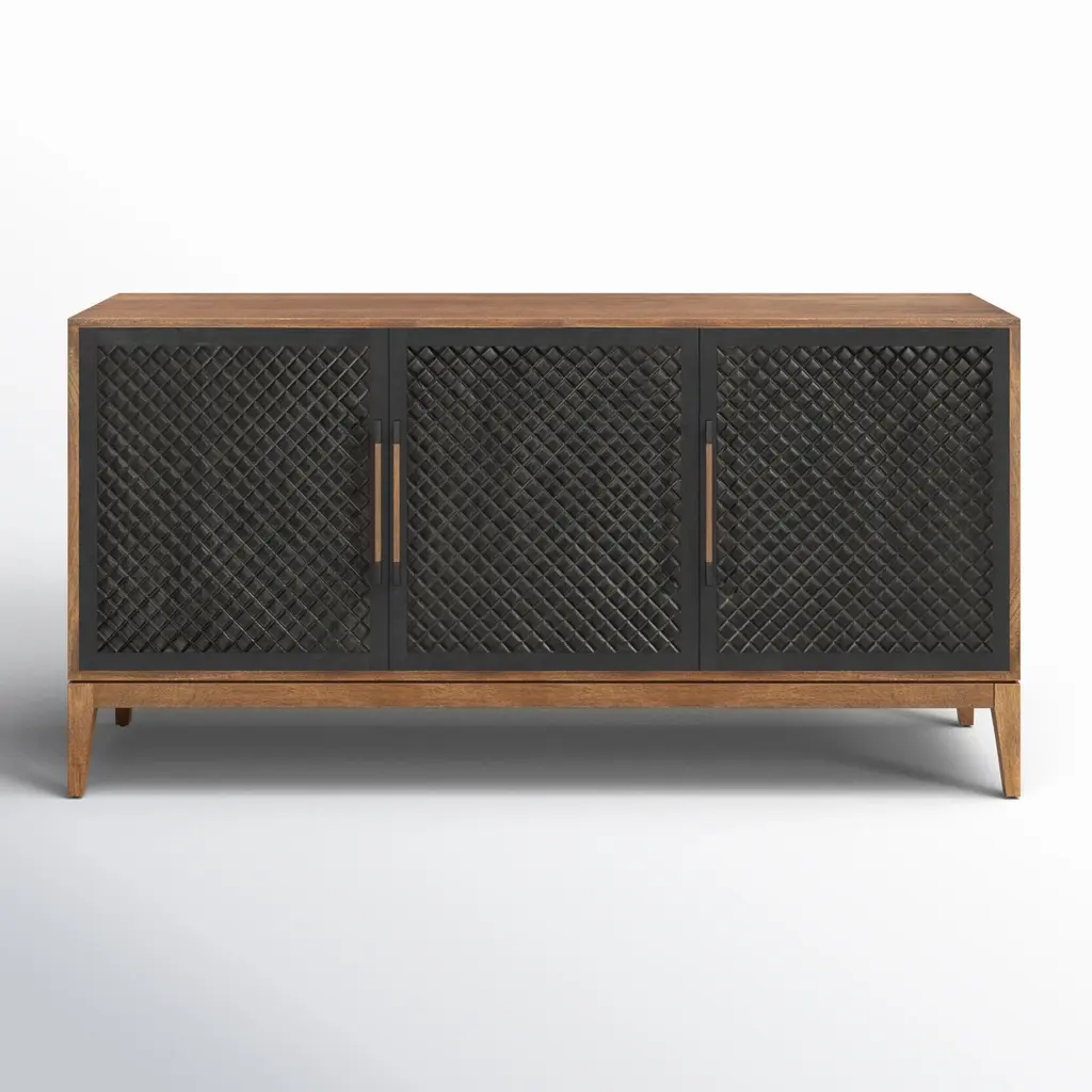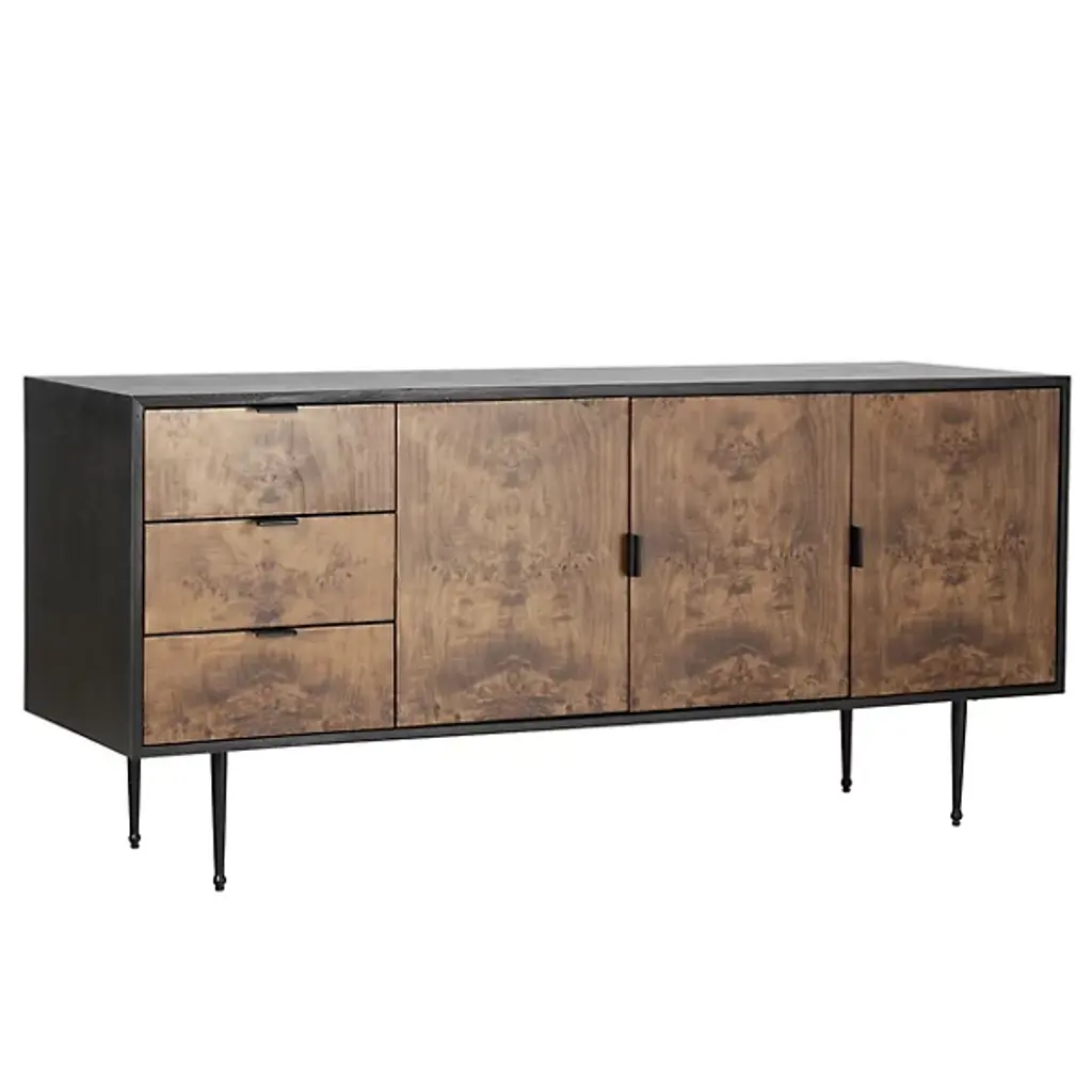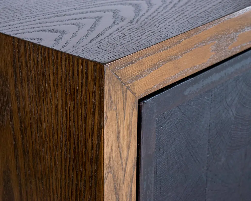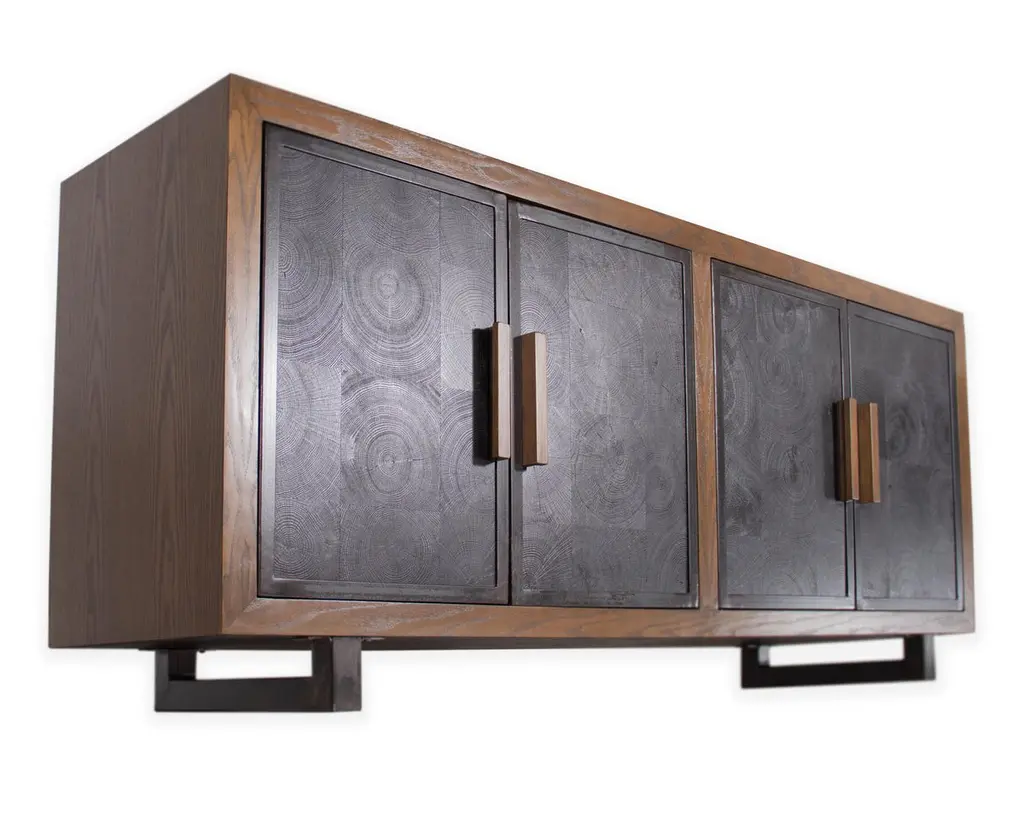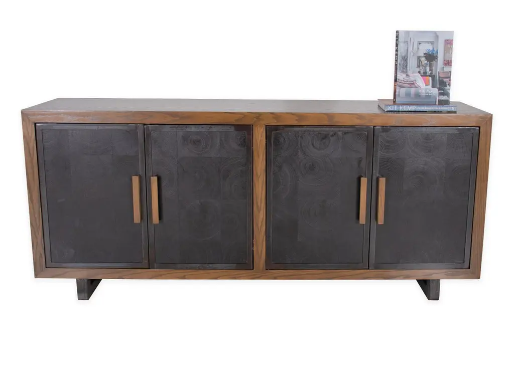 Four door server in oak with a bombay finish, demos ebonized oak doors, and ebony patina. Designed by Brendan Bass for the Vision and Design Collection, by using high quality materials and textures. All materials are sourced from local vendors throughout the state of Texas. The sleek, flowing lines exude a clean, contemporary look that is perfect for today's living spaces. Hand-crafted by Brendan’s select team of highly experienced Artisans, all located in Dallas. Each craftsperson leaves their own unique touch on each piece, making a truly one-of-a-kind piece of art.The Vision and Design experience is hands-on from the beginning. Clients have the ability to adjust all shapes, sizing, and dimensions. Coloring and finish can be customized as well from our deep selection of unique and eye-catching samples. Ranging from high quality stones, water-stained wood, and patinated metals.The price of the listing is representative of the exact piece pictured. If sizing, coloring, or other customization is changed please anticipate pricing to change accordingly. The current lead time for custom pieces is 10-12 weeks.This item is crafted from natural materials. Coloring and detailing may vary, adding to its uniqueness.