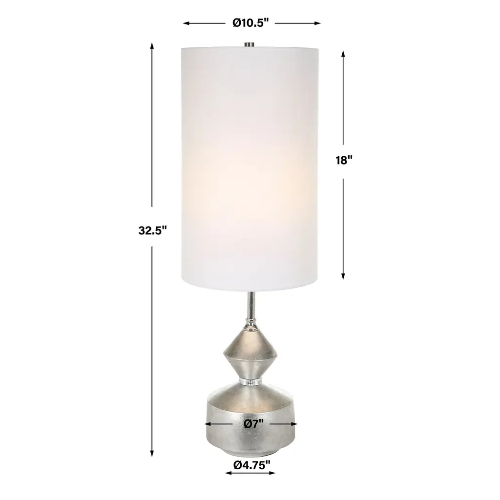 Elevate your decor with our contemporary-inspired buffet lamp, a sleek masterpiece that adds a touch of modern elegance to your space. Its geometric-shaped base features a leaf finish. The tall drum shade, wrapped in fabric, adds a touch of simplicity and sophistication, making it a versatile and stylish addition to any room. Product Features: Silver buffet lamp with shade Lamp features a geometric base with leaf finish Accented with a polished nickel neck and crystal details Tall drum shade Is covered in a fabric Lamp uses (1) 150-watt E26 bulb - not included Socket type: 3-way Switch type: socket switch UL listed for indoor use only Dimensions: Overall dimension: 32.5" high Base diameter: 7" diameter Shade dimension: 18" high x 10.5" diameter Material(s): iron/polyresin/linen fabric