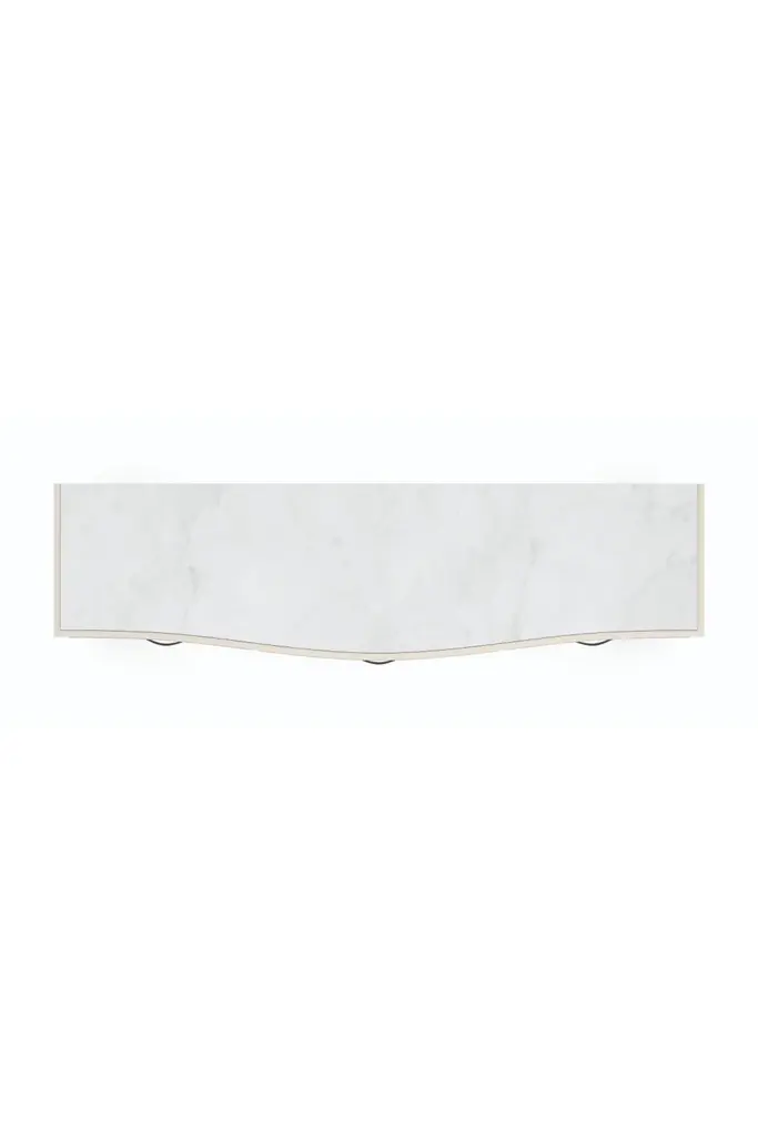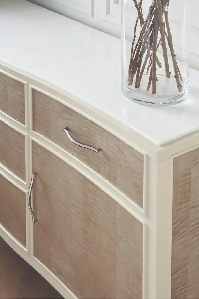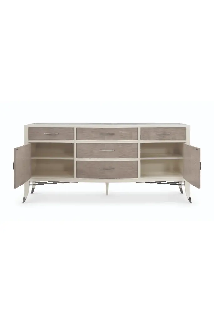 A beautifully figured wood grain lends a natural embellishment to this contemporary buffet, crafted in a modest yet memorable mix of materials and finishes. Linear drawer pulls create a sense of repetition, with a subtle arching curve and faux shagreen inlay. Adding to its subtle flare: stacked metal fretwork beneath the base and decorative ferrules in a Deep Bronze finish. Offers ample storage for serveware, linens, and other entertaining essentials.Download Assembly Sheet