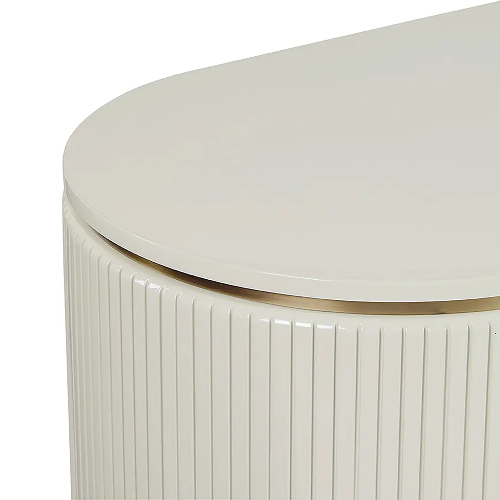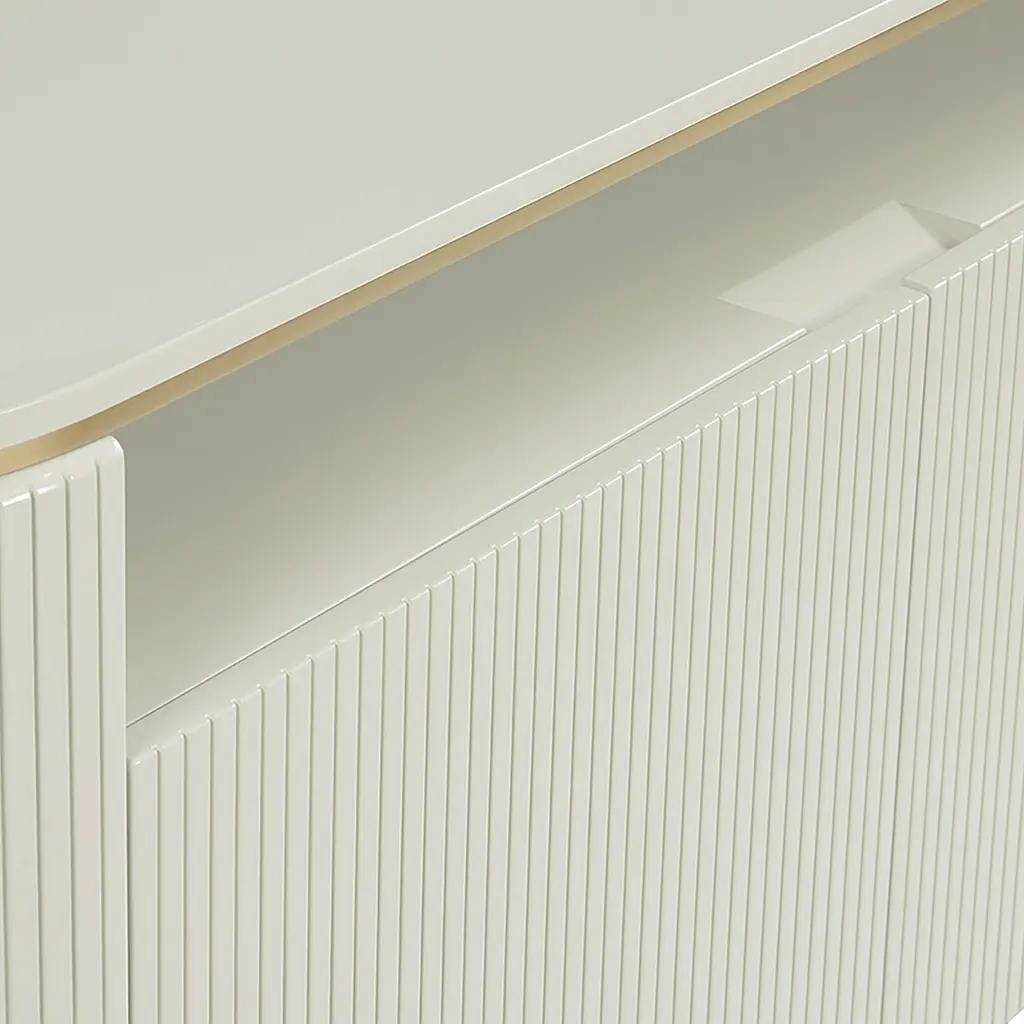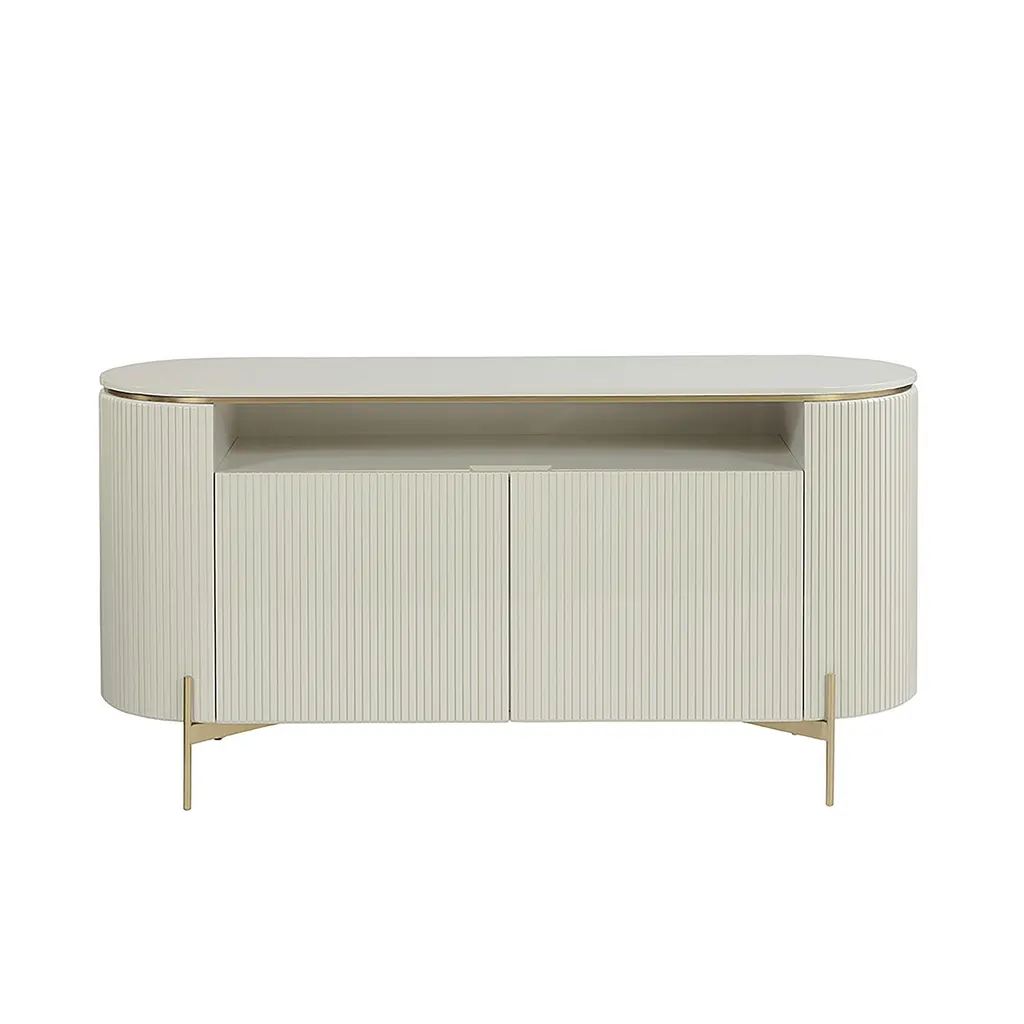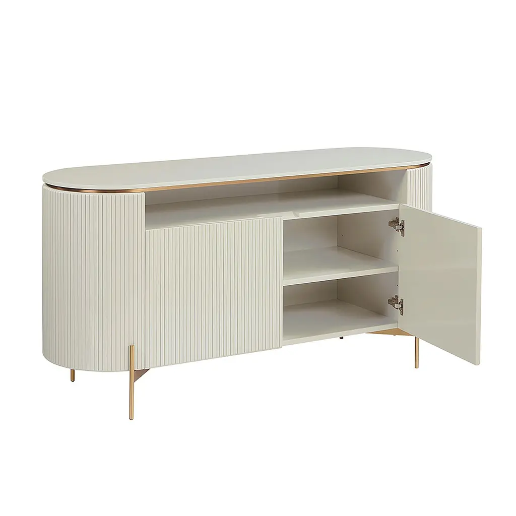Ribbed cabinet doors add texture. Two large doors open to reveal plenty of storage. Sleek metal accents bring some chic appeal to the buffet.