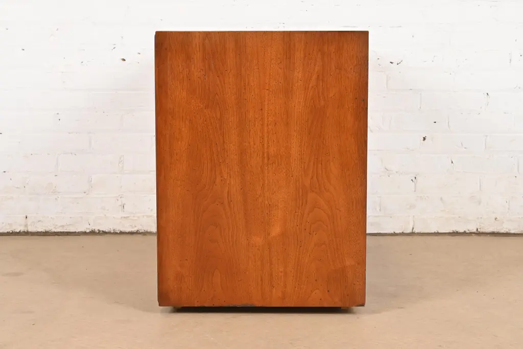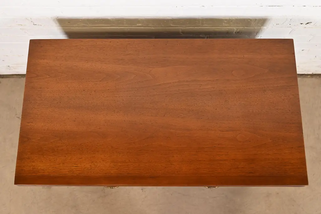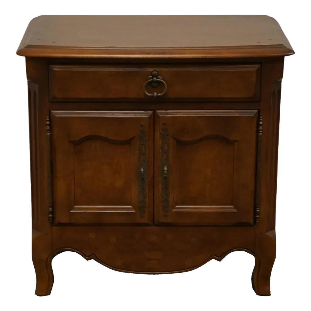 A gorgeous French Provincial Louis XV style sideboard, buffet server, bar cabinet, or compact credenza By Henredon USA, Circa 1960s Carved walnut, with original brass hardware. Drawer with felt insert for silverware or barware. Measures: 35"W x 19"D x 26"H. Very good original vintage condition. Two matching cabinets available.