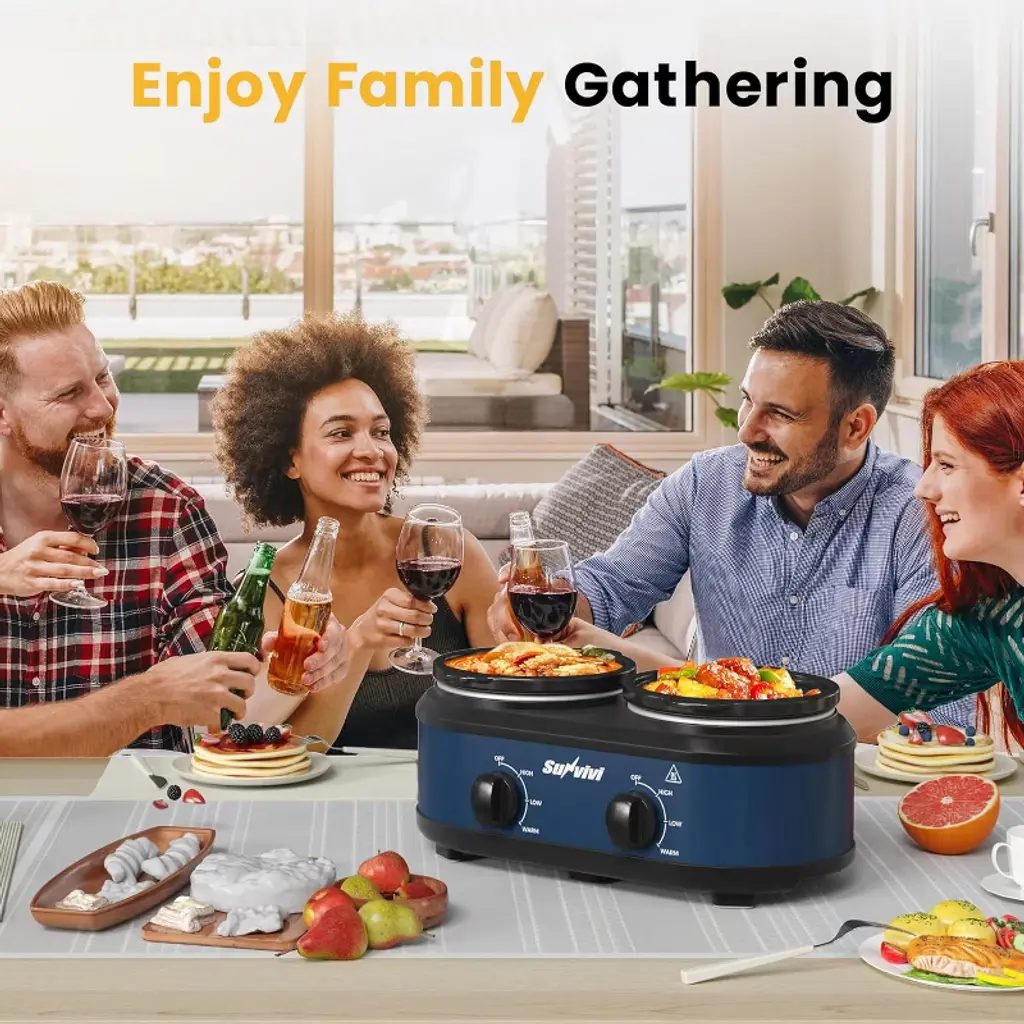 Cook Smarter, Not Harder Say goodbye to kitchen chaos with our dual slow cooker food warmer. Now you can prepare two different dishes at once, saving you time and effort. With three adjustable temperature settings, you have full control over cooking, ensuring your meals are cooked to perfection. The convenient glass lids let you monitor progress without lifting, and cleaning up is a breeze with dishwasher-safe pots. Whether it’s a family dinner or a party, this dual cooker brings efficiency and convenience to your kitchen, making meal prep easier and more enjoyable. Specification Product Name: Slow Cooker Color: Blue Material: Stainless Steel, Glass, PP Dimensions: 15.4" L x 8.9" W x 7.8" H Capacity: 2 x 1.25 QT Voltage: 120V Frequency: 60Hz Power: Low: 60W, High: 80W, Warm: 20W Certification: ETL+FDA