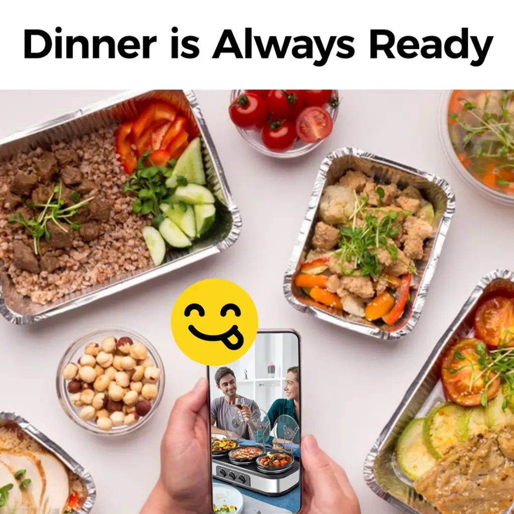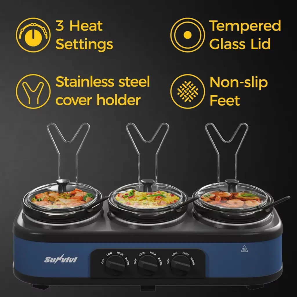 Effortless Cooking for Busy Lives Say goodbye to kitchen stress with our 3-pot slow cooker! Prepare a complete meal in one go, from sizzling chicken fajitas to savory refried beans and fluffy Spanish rice¡ªall at once. The three adjustable heat settings ensure your food is cooked perfectly, preserving flavor and moisture. Whether you¡¯re entertaining guests or cooking for the family, the sleek, compact design keeps your kitchen organized. Plus, cleaning is a breeze with dishwasher-safe pots and a wipeable base. Perfect for game nights, holiday gatherings, or any occasion, this cooker brings people together with delicious food. Specification Product Name: Slow Cooker Color: Blue Material: Stainless Steel, Glass, Chrome-Plated Iron, PP Dimensions: 27.5" L x 12" W x 8.66" H Capacity: 3 x 2.5 QT Voltage: 120V Frequency: 60Hz Power: Low: 100W, High: 140W, Warm: 40W