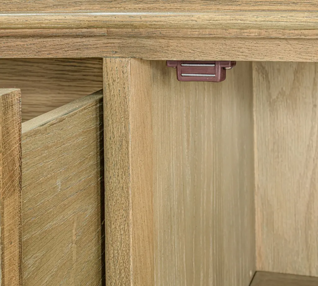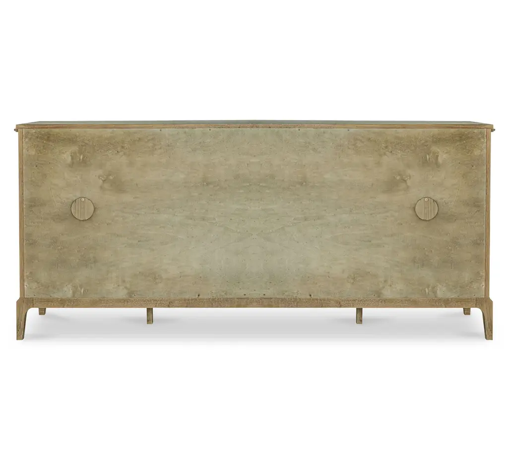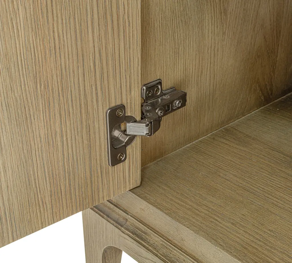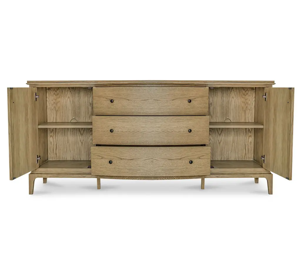 With its curved front and soft edges, this buffet pairs modern traditional style with practical design. A wire-brushed oak finish adds texture, while drawers and media cutouts offer smart storage for dining or living spaces.