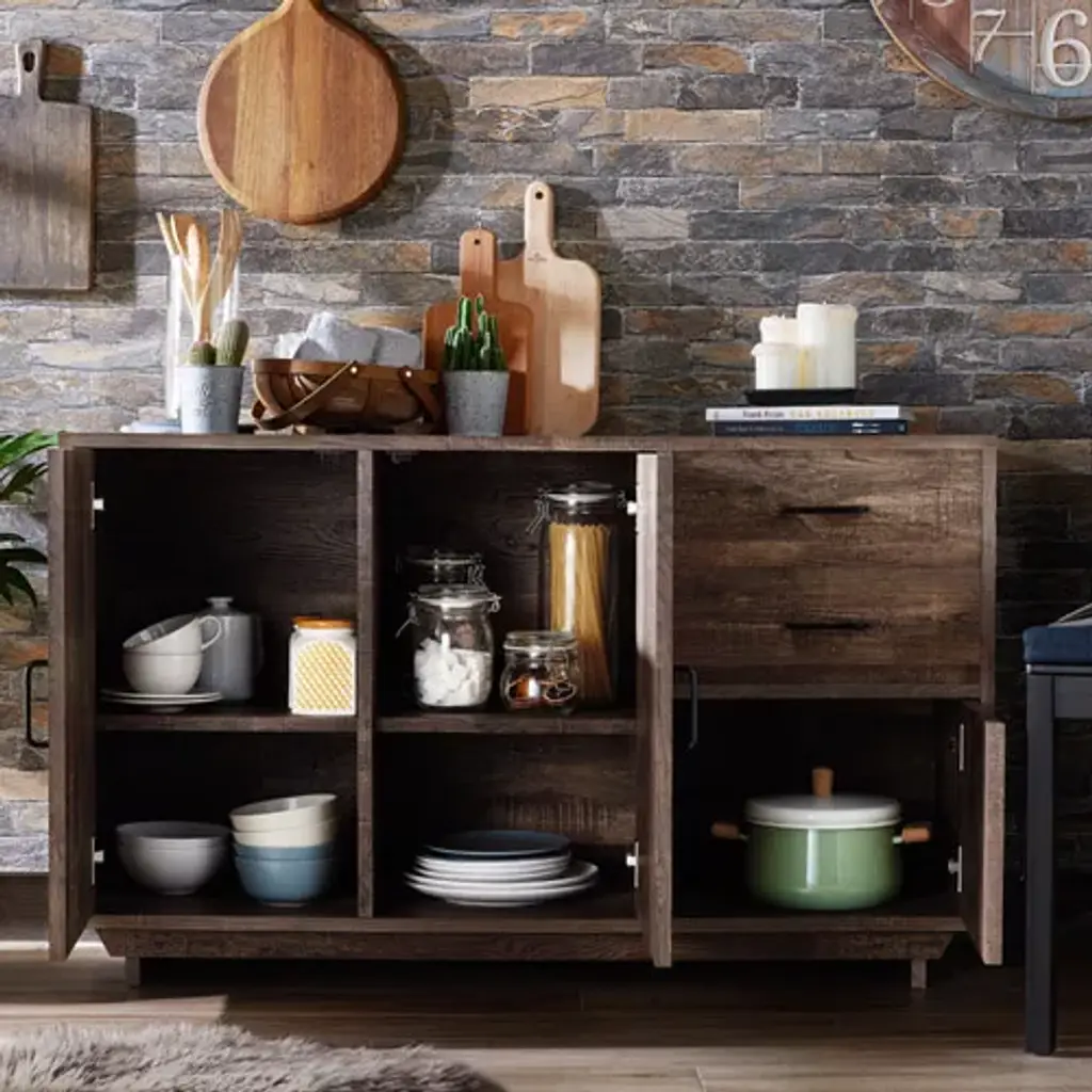 Warm up the look of your dining room with the Homes: Inside + Out Frakes Farmhouse Buffet Table. The neutral yet warm tones and distressed look of reclaimed wood creates a charming farmhouse effect. Designed to impress, this buffet summons a calming and familiar ambiance, while ample storage cabinets and drawers make it the perfect buffet to complete the custom look of your dining room. Have all your tableware organized inside the stylish Homes: Inside + Out Frakes Farmhouse Buffet Table.