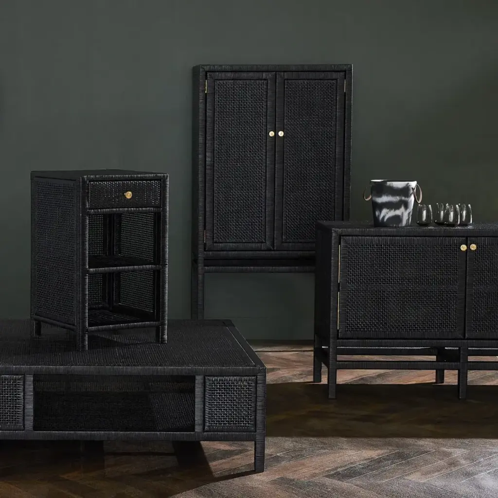 A tightly wrapped, natural peeled rattan frame with slender legs, reinforced by a box stretcher, complements the dense basket weave of the natural, peeled rattan top and the slightly looser basket weave of the doors includes lower-patterned gold knobs. Now available in White!