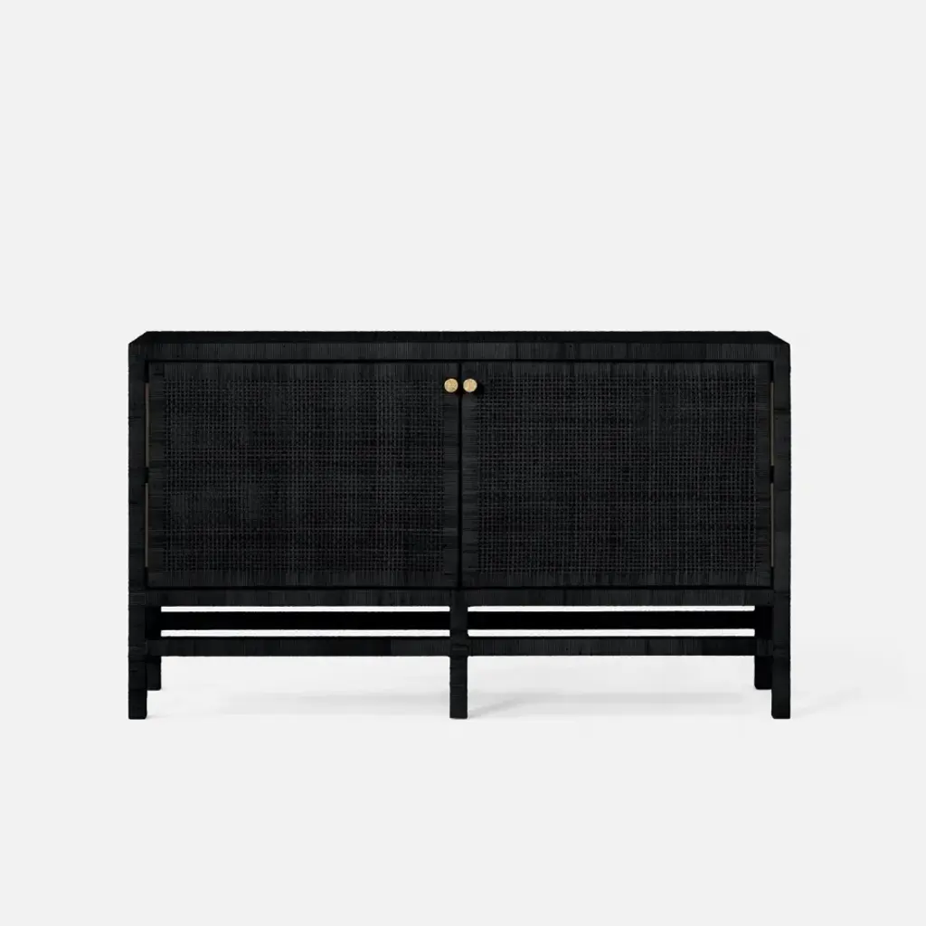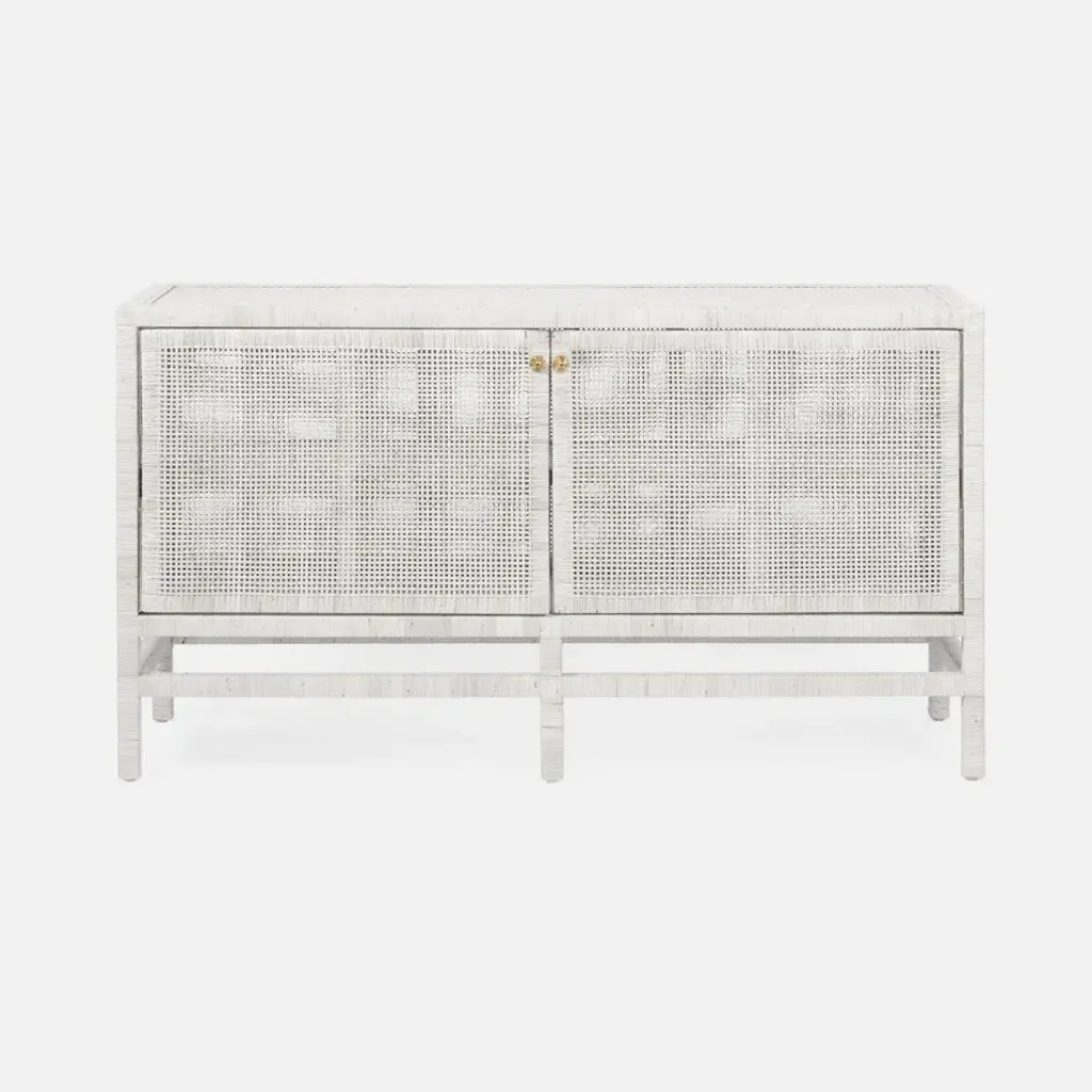 A tightly wrapped, natural peeled rattan frame with slender legs, reinforced by a box stretcher, complements the dense basket weave of the natural, peeled rattan top and the slightly looser basket weave of the doors includes lower-patterned gold knobs. Now available in White!