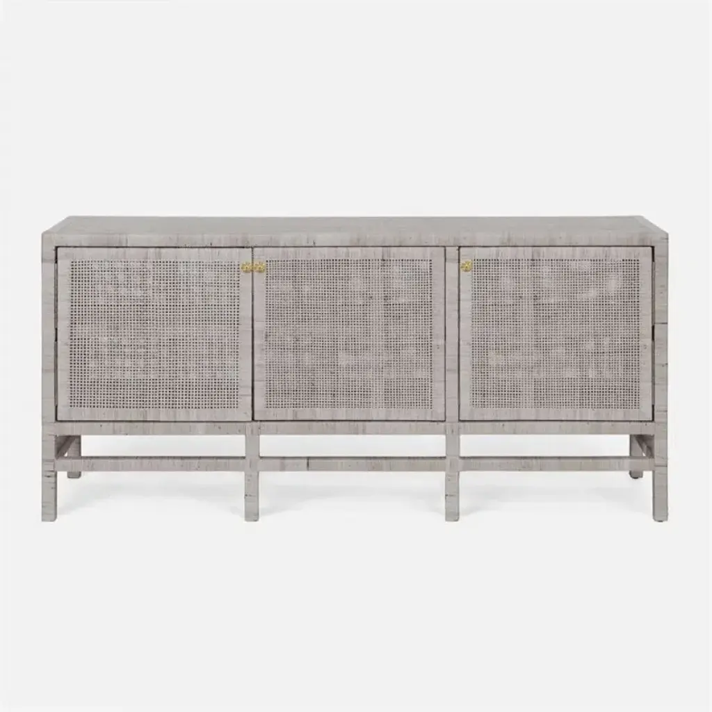 Our Isla deep buffet offers abundant storage with two loosely woven shelves and three drawers, finished with round sunburst brass knobs. A tightly wrapped, peeled rattan frame with slender legs is reinforced at the top and drawers with a dense basket weave.