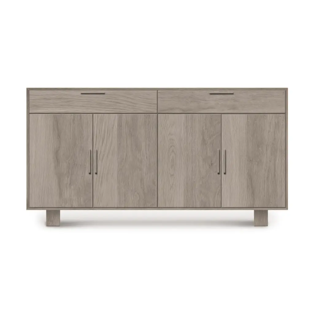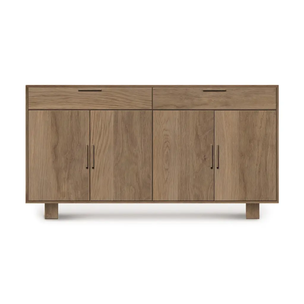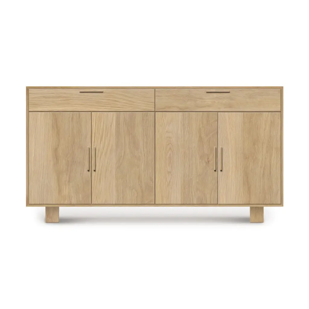 Drawing inspiration from the Greek word meaning "equal", the Iso design by Copeland Furniture is a geometric study in solid oak wood from every angle. The organic grain patterns of the oak wood juxtapose the crisp straight handcrafted edges and lines in a distinct mid-century modern style. Enjoy the aesthetics of the Iso design in the Iso Oak 4 Door, 2 Drawer Buffet. This piece is a great place to start with its large amount of storage room and easy-to-access configuration. Two drawers provide a fantastic place to store all of your cutlery and utensils, while the enclosed space below offers ample capacity for all of your dishware.