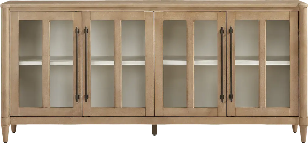 Four is more—when it comes to storage, that is. A quad of ample compartments makes this buffet with molded top, fluted pilasters, and tapered feet the perfect solution for a gracious dining room. Glass center doors provide the option for use as a media cabinet.