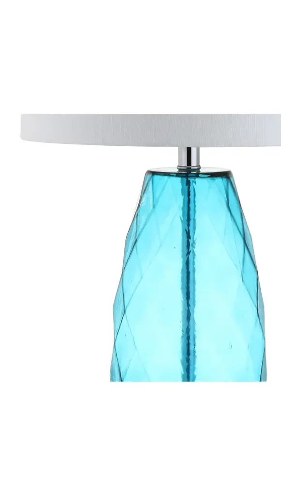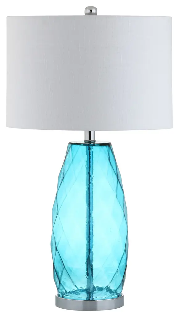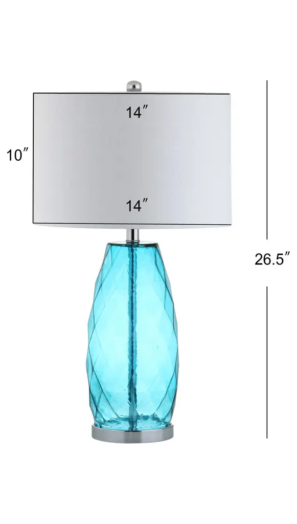 Features Constructed from glass and metal Comes with a 100% hardback cotton shade (1) 9 watt medium (E26) LED bulb included Capable of being dimmed if included bulbs are replaced with dimmable bulbs On / Off switch UL rated for dry locations Dimensions Height: 26-1/2" Width: 14" Cord Length: 60" Shade Height: 10" Shade Diameter: 14" Electrical Specifications Max Wattage: 9 watts Number of Bulbs: 1 Max Watts Per Bulb: 9 watts Lumens: 800 Bulb Base: Medium (E26) Bulb Shape: A19 Bulb Type: LED Color Temperature: 2700K Bulb Included: Yes