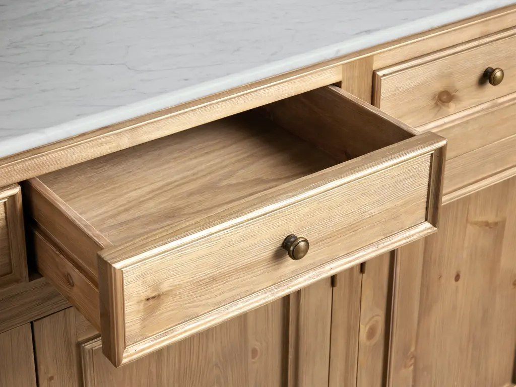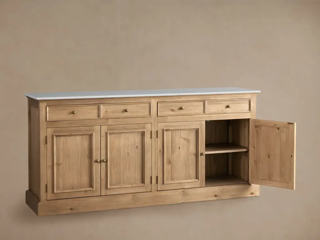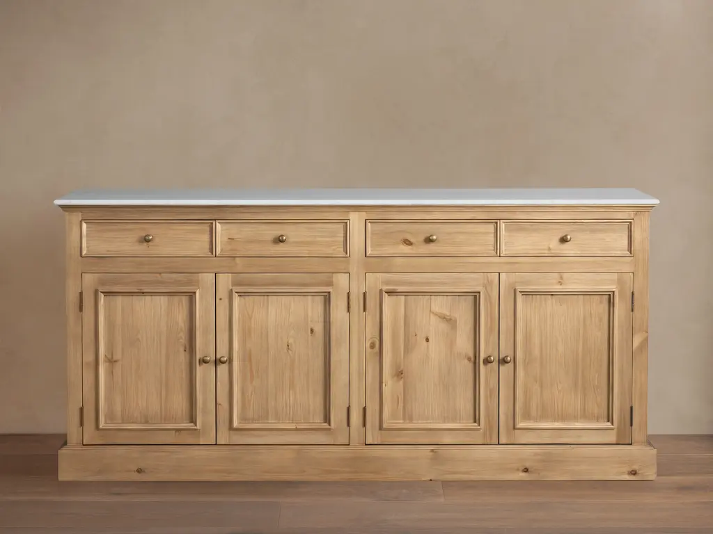 Every plank in our classic Kensington Buffet tells a story of expert craftsmanship. Our artisans build each piece by hand from solid, sustainably sourced Finnish pine wood complemented by smooth bluestone or white marble tops. Distinctive finishes are layered with stain and distressed detailing to accentuate the wood’s naturally unique features, resulting in a timeless antiqued aesthetic.