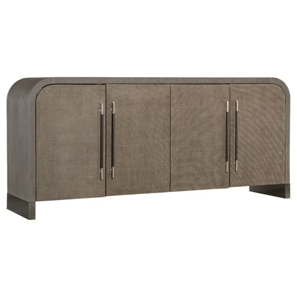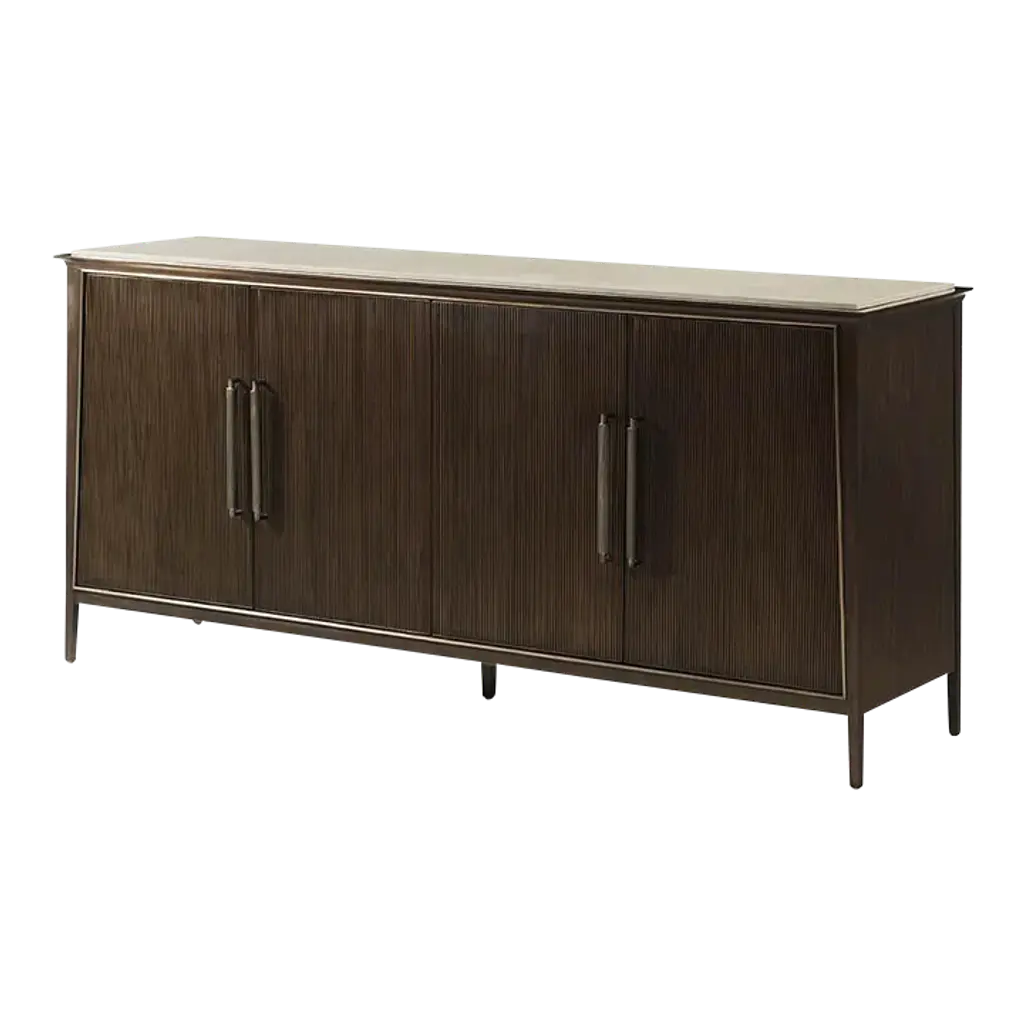 The Lido Buffet features a sophisticated tapering silhouette and reeded angular doors, crafted from Prima Vera veneer in our dark Bistre finish and complimented by a beautifully honed inset Crema Marfil marble stone top. The custom forged hardware, finished in a dark rubbed bronze, echoes the reeded details throughout.