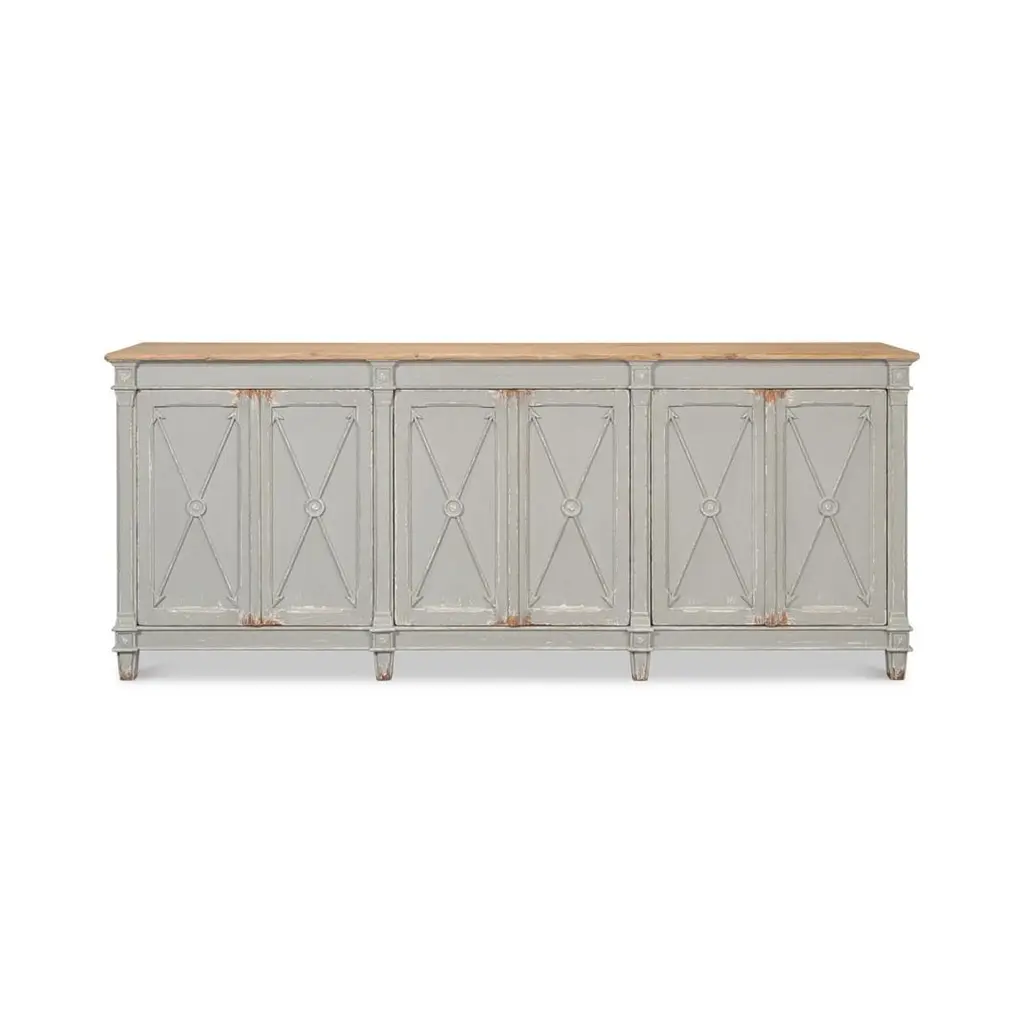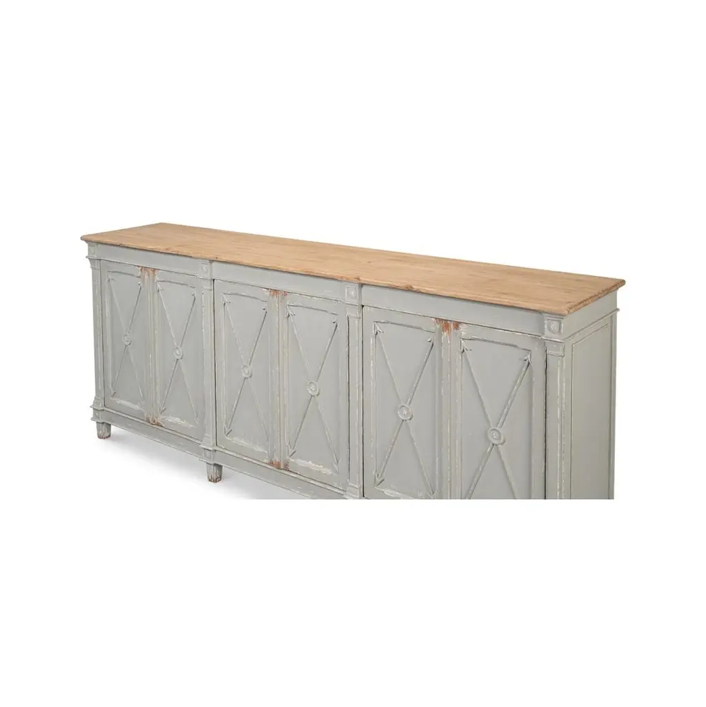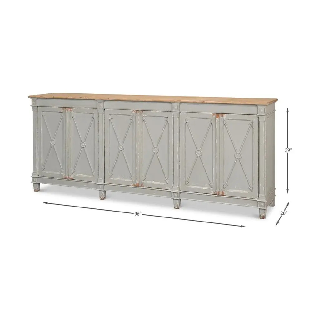 This piece features a hand-rubbed and distressed muted gray-painted finish and a natural finished top, complementing its six doors adorned with a classic cross-arrow design. Crafted from high-quality pine, this buffet offers a rustic, antiqued finish that exudes old-world charm and sophistication.Sized generously at 96" W x 20" D x 39" H, it provides ample storage with a painted interior and removable shelves, perfect for organizing tableware, linens, or other essentials. This buffet not only serves as a functional storage solution but also as a striking focal point in any room, blending seamlessly with both traditional and contemporary decor.Dimensions: 96" W x 20" D x 39" H