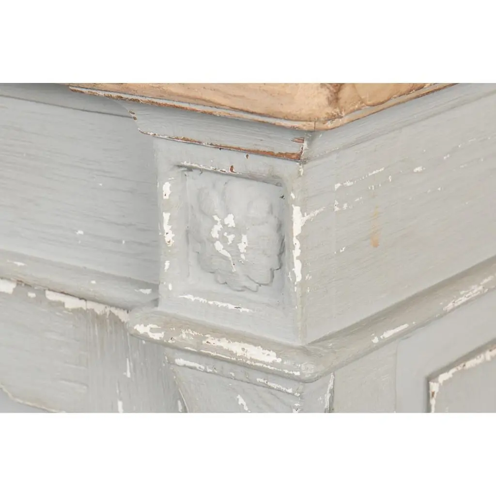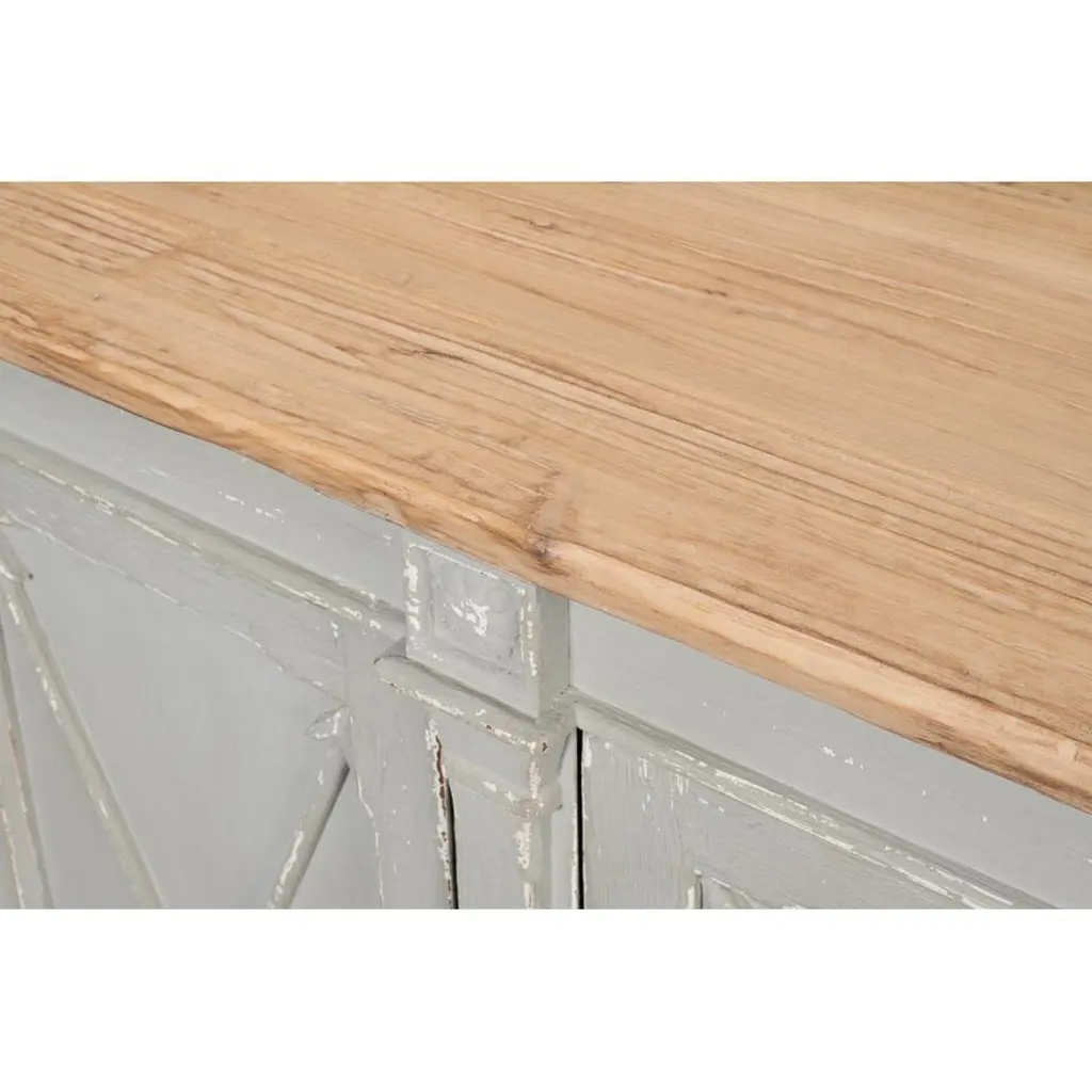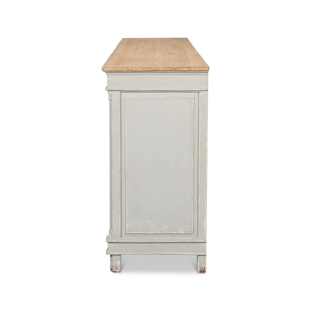 This piece features a hand-rubbed and distressed muted gray-painted finish and a natural finished top, complementing its six doors adorned with a classic cross-arrow design. Crafted from high-quality pine, this buffet offers a rustic, antiqued finish that exudes old-world charm and sophistication.Sized generously at 96" W x 20" D x 39" H, it provides ample storage with a painted interior and removable shelves, perfect for organizing tableware, linens, or other essentials. This buffet not only serves as a functional storage solution but also as a striking focal point in any room, blending seamlessly with both traditional and contemporary decor.Dimensions: 96" W x 20" D x 39" H