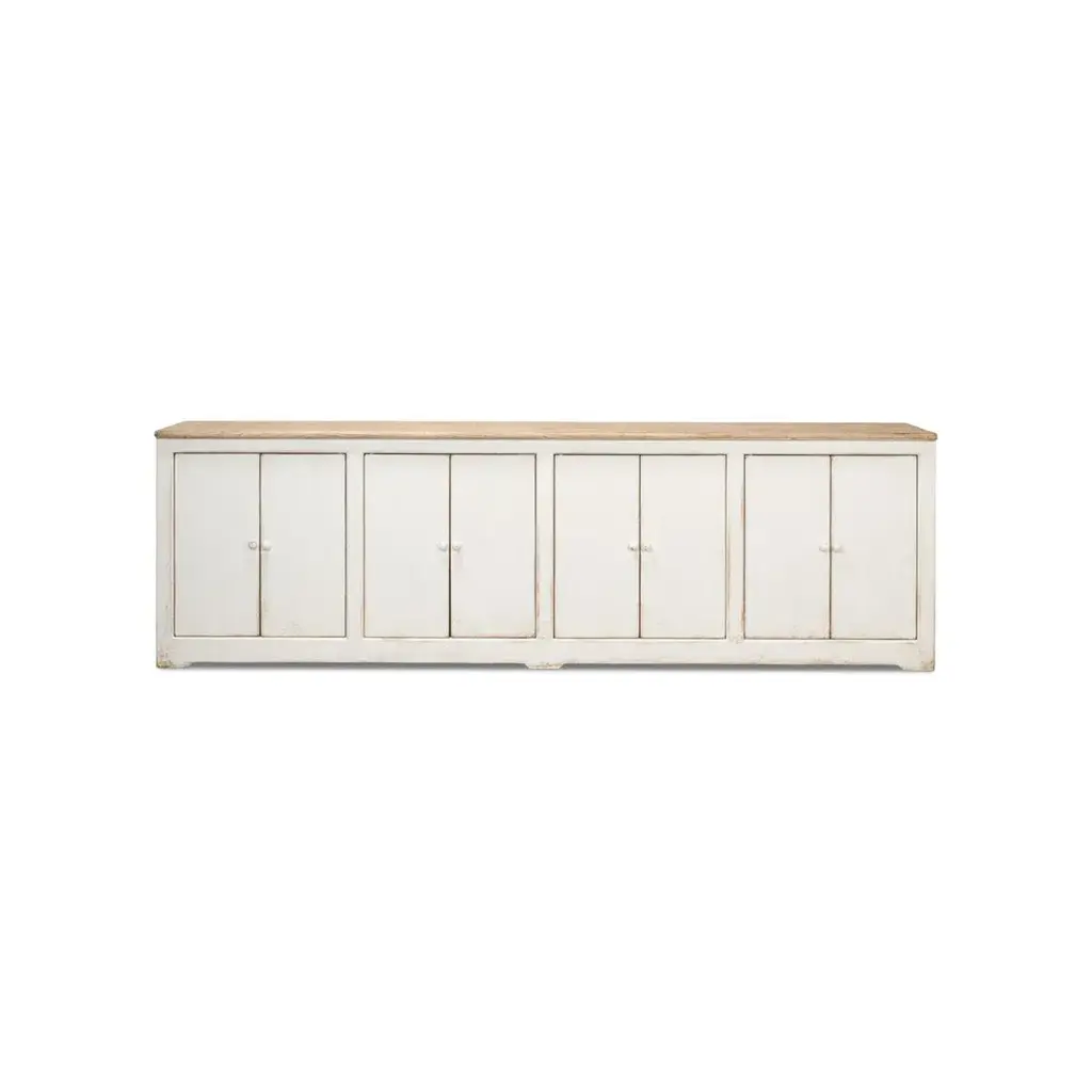 An eight door pine sideboard cabinet with a soft painted rub through antiqued whitewash finish with a natural finish top. Doors open to reveal a painted interior with removable shelves. Dimensions: 122" W x 19" D x 38" H