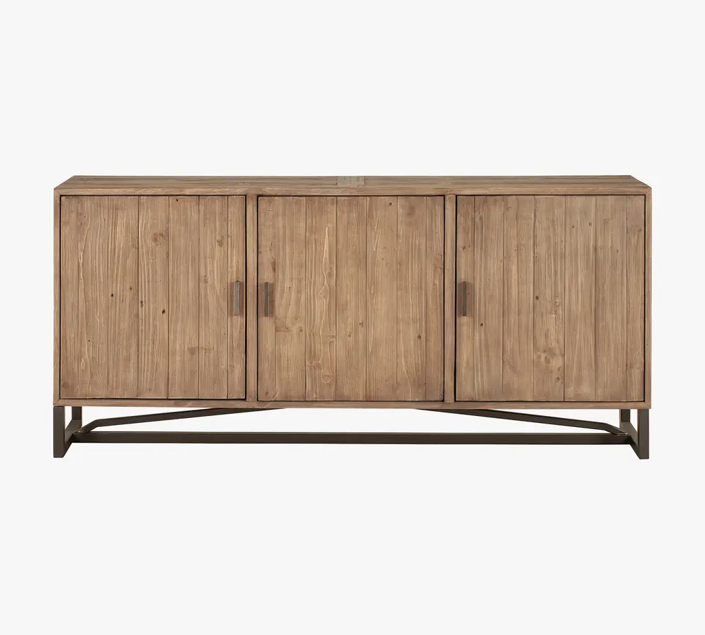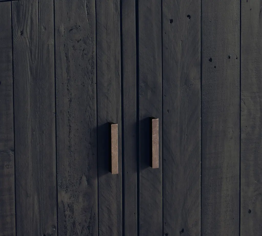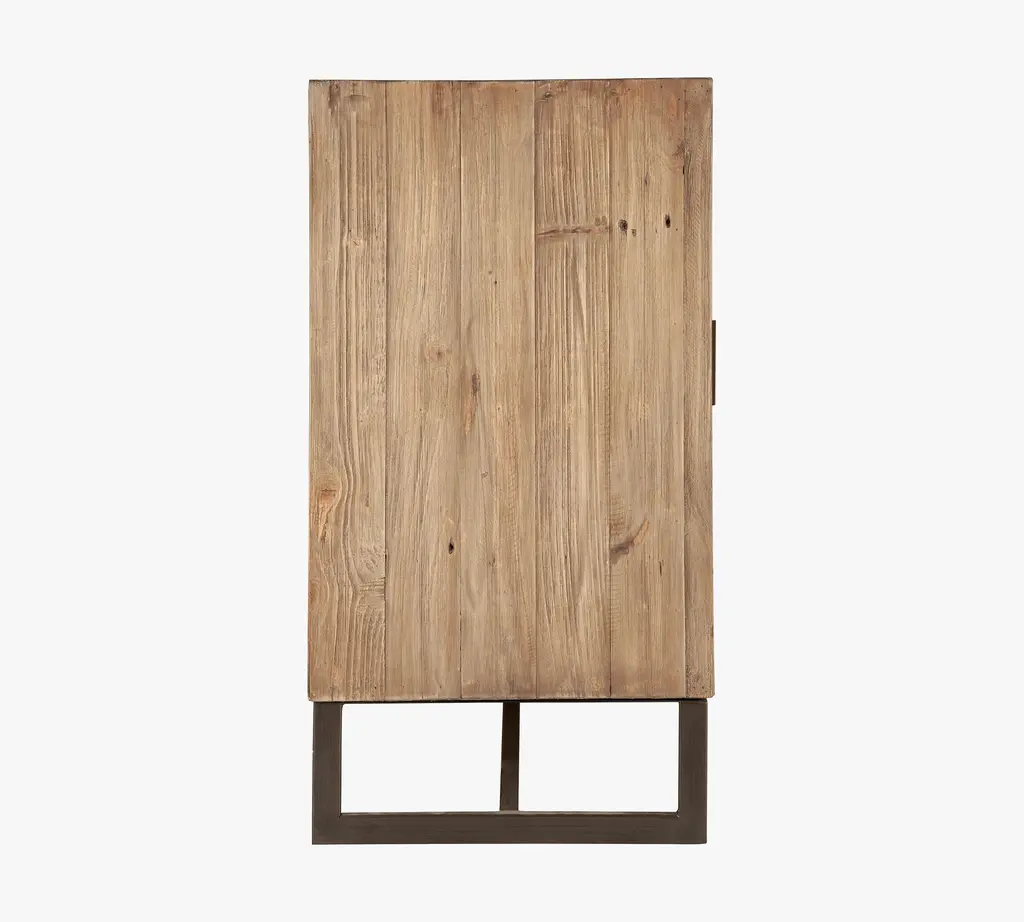 Reclaimed pine planks and visible wood grain are rugged moments in a modern shape. The sizable interior has six shelves for dining serveware or living room storage.