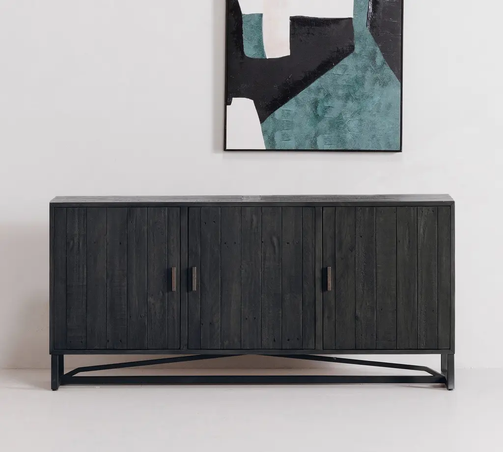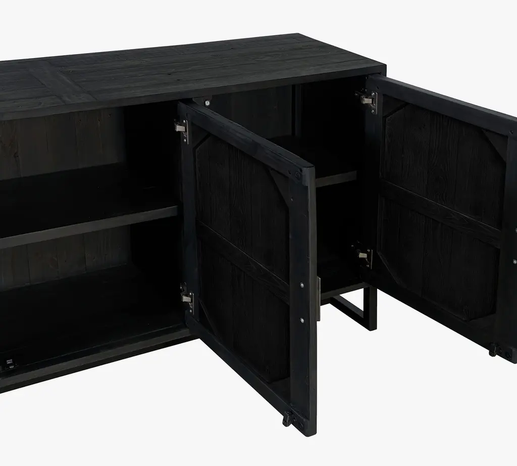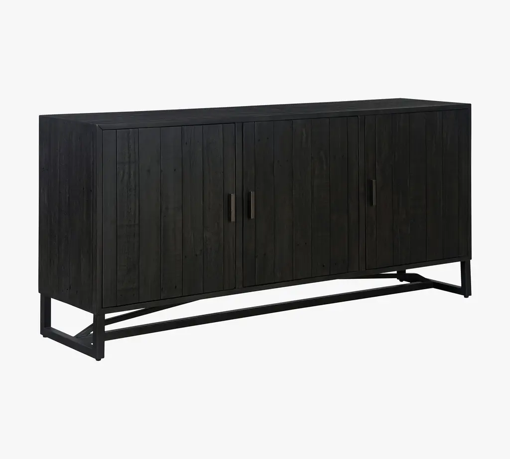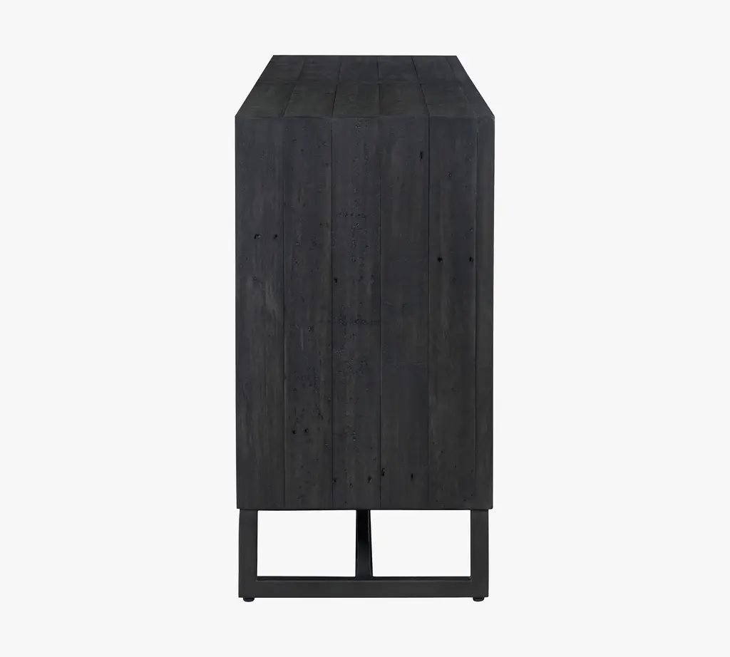 Reclaimed pine planks and visible wood grain are rugged moments in a modern shape. The sizable interior has six shelves for dining serveware or living room storage.