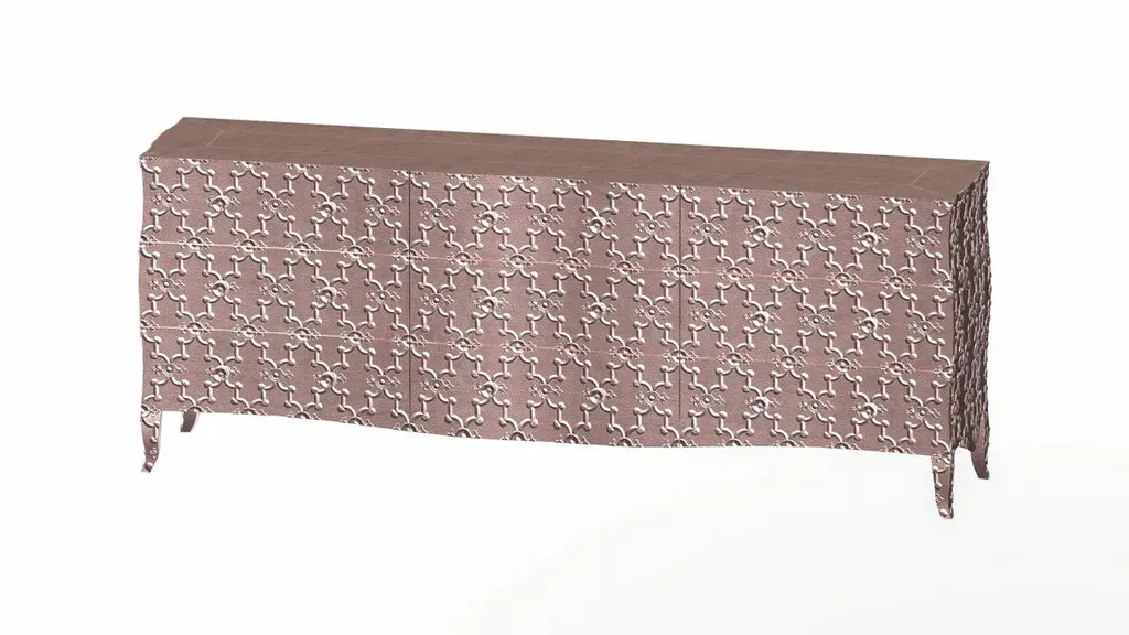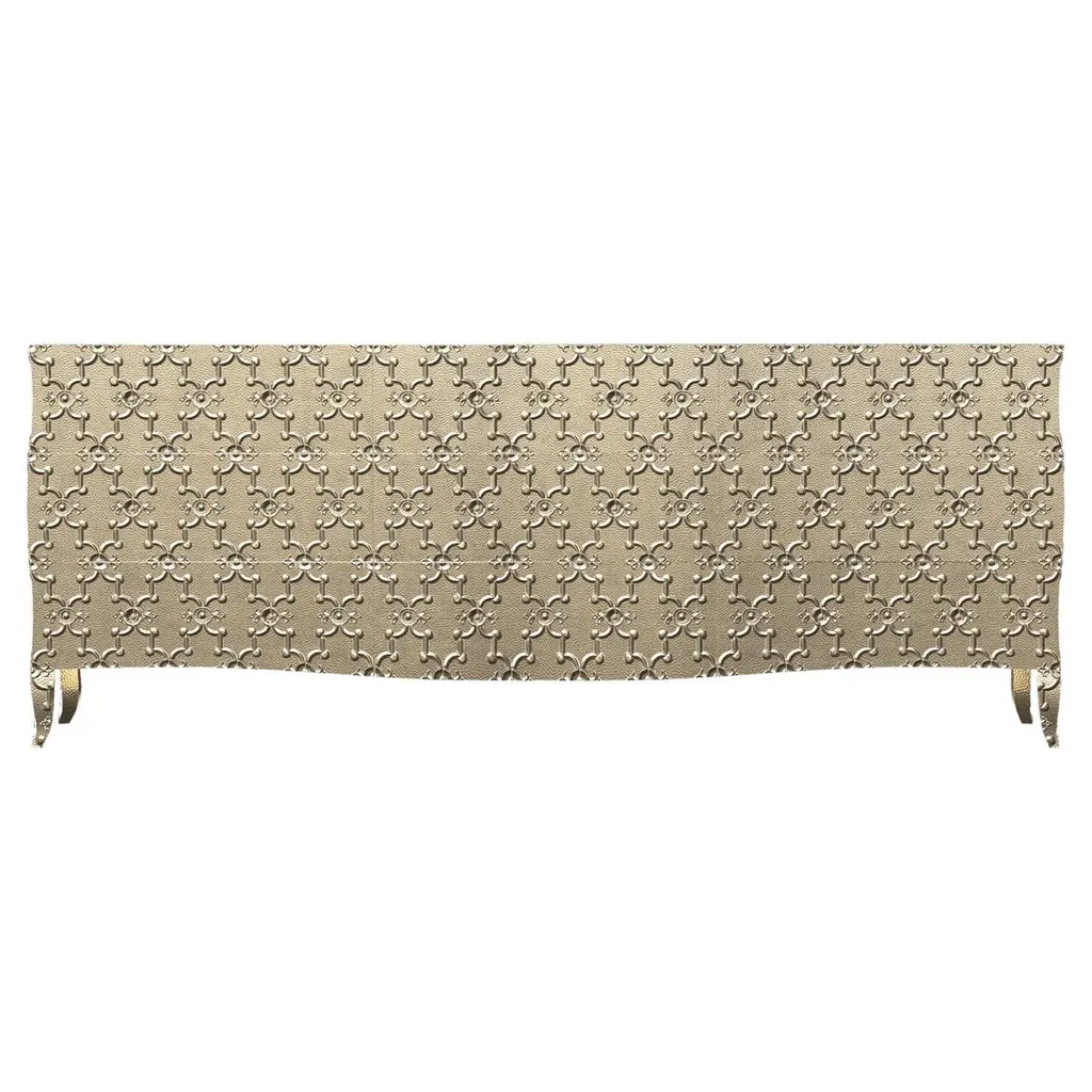Renowned designer Paul Mathieu created this large dresser with 9 drawers with his interpretation of Fleur de Lis motif carved all over the piece just like the other two designs namely the Louise Semainier and Demi Louise Semainier which are part of the Louise Collection he created for Stephanie OdegardCrafted with utmost care and attention to detail, these Louis XVI Fleur De Lis are made to order and are available in twelve metal clad finishes, ensuring that you can choose the perfect one to match your individual style and taste. The use of high-quality materials and expert craftsmanship ensure that each Art Deco Louis XVI Fleur De Lis is not only beautiful but also a true piece of art.The curved legs and side arms of this Art Deco Louis XVI Fleur De Lis are hand carved from solid pieces of teak. Pattern makers trace and cut complex forms that will cover the chair in a skin of copper, white bronze, brass or antiqued white bronze The metal finishes will tarnish over time. Regular non-abrasive household metal polishes can be used to restore the original luster.Overall, if you're looking for a piece of furniture that combines luxury, comfort, and style, then the Art Deco Louis XVI Fleur De Lis is an excellent choice. With its distinctive curved profile and multiple finish options, this Chair set is sure to elevate the look of any room it is placed in, and be a beloved addition to your home for years to come.The images shown in this listing are shot in different lighting conditions and/or are 3D illustrations. We encourage our customers to please request a sample or a full sample set of 12 finishes so that they can experience the finish first hand. Louise Art Deco Buffet Fleur De Lis Fine Hammered Copper by Paul MathieuSize- 84"x 18"x 33"HMaterials - Copper, Metal sheet, Teak, Wood, MetalTechniques: Hand-Crafted, Hand-Carved, Metal Work, Wood Work, Metal Wrapping, PolishedPlease note that moisture in air, sudden change in temperature and natural movement of wood over time causes the metal to wrinkle or bubble up. We use well seasoned, reclaimed teak and high quality marine grade MDF (wherever technically possible) to avoid and delay the mentioned changes. However a perfect stability of metal cannot be guaranteed. Please note that our smooth finish metal clad pieces will have some unavoidable tool marks. This is proof that everything is done by hand. The smooth finish will not come out like a machine made perfect surface and the master artisan will do their best to make it look as good/clean/stable/perfect as he possibly can.The antique white bronze finish is hand done by using an acidic chemical over the white bronze finish to recreate a natural patination. Like with the natural patination of silver, copper, or brass, the final result and color uniformity of the patina cannot be guaranteed. The goal of this finish is to achieve rainbow-like shades with dull, shiny, cloudy, and streaky patches to give an illusion of antiquing. Please note:None of our metal clad pieces are treated with a protective “finish” thus enabling the items to age naturally over time. We will of course polish them well before we pack them. a) Copper oxidizes faster than the other metals. In six to twelve months it will most likely lose its shine and will gradually turn to different shades of brown and/or green/blue. This aging process and its effect is referred to as verdigris. After a year the piece should not change much more. Copper does not rust, but does require periodic cleaning in order to retain its original shine if that the preferred option. ('BRASSO' or any known copper polish can be used to polish copper).b) Brass retains its shine for far longer than others, but will tarnish if not cleaned on occasion. ('BRASSO' is made to polish brass).c) White bronze, has the least tendency to show age or tarnish. If kept in a controlled climate, this metal will hold its shine for years. It can be cleaned with a cleanser and polished with a cloth. d) The antiqued white bronze finish will react with the natural elements the fastest in the beginning but it too will stop reacting and will settle down in a stable state like copper after 6-12 months. Since it is already antiqued and looked like it is tarnished, as described in an earlier message, this fast reaction will not change the over all look. In that way this surface is most forgiving. The images shown in this listing are shot in different lighting conditions and/or are 3D illustrations. We encourage our customers to please request a sample or a full sample set of 12 finishes so that they can experience the finish first hand.