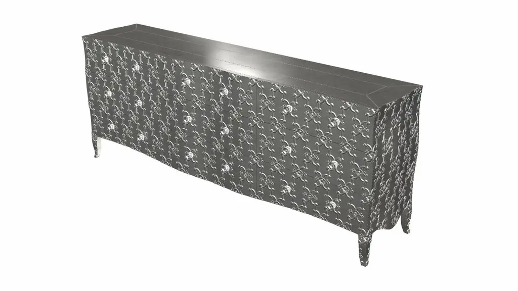 Renowned designer Paul Mathieu created this large dresser with 9 drawers with his interpretation of Fleur de Lis motif carved all over the piece just like the other two designs namely the Louise Semainier and Demi Louise Semainier which are part of the Louise Collection he created for Stephanie OdegardCrafted with utmost care and attention to detail, these Louis XVI Fleur De Lis are made to order and are available in twelve metal clad finishes, ensuring that you can choose the perfect one to match your individual style and taste. The use of high-quality materials and expert craftsmanship ensure that each Art Deco Louis XVI Fleur De Lis is not only beautiful but also a true piece of art.The curved legs and side arms of this Art Deco Louis XVI Fleur De Lis are hand carved from solid pieces of teak. Pattern makers trace and cut complex forms that will cover the chair in a skin of copper, white bronze, brass or antiqued white bronze The metal finishes will tarnish over time. Regular non-abrasive household metal polishes can be used to restore the original luster.Overall, if you're looking for a piece of furniture that combines luxury, comfort, and style, then the Art Deco Louis XVI Fleur De Lis is an excellent choice. With its distinctive curved profile and multiple finish options, this Chair set is sure to elevate the look of any room it is placed in, and be a beloved addition to your home for years to come.The images shown in this listing are shot in different lighting conditions and/or are 3D illustrations. We encourage our customers to please request a sample or a full sample set of 12 finishes so that they can experience the finish first hand. Louise Art Deco Buffet Fleur De Lis Mid. Hammered White Bronze by Paul MathieuSize- 84"x 18"x 33"HMaterials - White Bronze, Metal sheet, Teak, Wood, MetalTechniques: Hand-Crafted, Hand-Carved, Metal Work, Wood Work, Metal Wrapping, PolishedPlease note that moisture in air, sudden change in temperature and natural movement of wood over time causes the metal to wrinkle or bubble up. We use well seasoned, reclaimed teak and high quality marine grade MDF (wherever technically possible) to avoid and delay the mentioned changes. However a perfect stability of metal cannot be guaranteed. Please note that our smooth finish metal clad pieces will have some unavoidable tool marks. This is proof that everything is done by hand. The smooth finish will not come out like a machine made perfect surface and the master artisan will do their best to make it look as good/clean/stable/perfect as he possibly can.The antique white bronze finish is hand done by using an acidic chemical over the white bronze finish to recreate a natural patination. Like with the natural patination of silver, copper, or brass, the final result and color uniformity of the patina cannot be guaranteed. The goal of this finish is to achieve rainbow-like shades with dull, shiny, cloudy, and streaky patches to give an illusion of antiquing. Please note:None of our metal clad pieces are treated with a protective “finish” thus enabling the items to age naturally over time. We will of course polish them well before we pack them. a) Copper oxidizes faster than the other metals. In six to twelve months it will most likely lose its shine and will gradually turn to different shades of brown and/or green/blue. This aging process and its effect is referred to as verdigris. After a year the piece should not change much more. Copper does not rust, but does require periodic cleaning in order to retain its original shine if that the preferred option. ('BRASSO' or any known copper polish can be used to polish copper).b) Brass retains its shine for far longer than others, but will tarnish if not cleaned on occasion. ('BRASSO' is made to polish brass).c) White bronze, has the least tendency to show age or tarnish. If kept in a controlled climate, this metal will hold its shine for years. It can be cleaned with a cleanser and polished with a cloth. d) The antiqued white bronze finish will react with the natural elements the fastest in the beginning but it too will stop reacting and will settle down in a stable state like copper after 6-12 months. Since it is already antiqued and looked like it is tarnished, as described in an earlier message, this fast reaction will not change the over all look. In that way this surface is most forgiving. The images shown in this listing are shot in different lighting conditions and/or are 3D illustrations. We encourage our customers to please request a sample or a full sample set of 12 finishes so that they can experience the finish first hand.