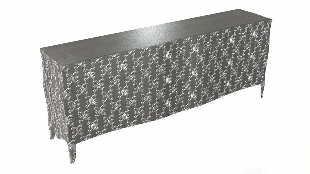 Renowned designer Paul Mathieu created this large dresser with 9 drawers with his interpretation of Fleur de Lis motif carved all over the piece just like the other two designs namely the Louise Semainier and Demi Louise Semainier which are part of the Louise Collection he created for Stephanie OdegardCrafted with utmost care and attention to detail, these Louis XVI Fleur De Lis are made to order and are available in twelve metal clad finishes, ensuring that you can choose the perfect one to match your individual style and taste. The use of high-quality materials and expert craftsmanship ensure that each Art Deco Louis XVI Fleur De Lis is not only beautiful but also a true piece of art.The curved legs and side arms of this Art Deco Louis XVI Fleur De Lis are hand carved from solid pieces of teak. Pattern makers trace and cut complex forms that will cover the chair in a skin of copper, white bronze, brass or antiqued white bronze The metal finishes will tarnish over time. Regular non-abrasive household metal polishes can be used to restore the original luster.Overall, if you're looking for a piece of furniture that combines luxury, comfort, and style, then the Art Deco Louis XVI Fleur De Lis is an excellent choice. With its distinctive curved profile and multiple finish options, this Chair set is sure to elevate the look of any room it is placed in, and be a beloved addition to your home for years to come.The images shown in this listing are shot in different lighting conditions and/or are 3D illustrations. We encourage our customers to please request a sample or a full sample set of 12 finishes so that they can experience the finish first hand. Louise Art Deco Buffet Fleur De Lis Mid. Hammered White Bronze by Paul MathieuSize- 84"x 18"x 33"HMaterials - White Bronze, Metal sheet, Teak, Wood, MetalTechniques: Hand-Crafted, Hand-Carved, Metal Work, Wood Work, Metal Wrapping, PolishedPlease note that moisture in air, sudden change in temperature and natural movement of wood over time causes the metal to wrinkle or bubble up. We use well seasoned, reclaimed teak and high quality marine grade MDF (wherever technically possible) to avoid and delay the mentioned changes. However a perfect stability of metal cannot be guaranteed. Please note that our smooth finish metal clad pieces will have some unavoidable tool marks. This is proof that everything is done by hand. The smooth finish will not come out like a machine made perfect surface and the master artisan will do their best to make it look as good/clean/stable/perfect as he possibly can.The antique white bronze finish is hand done by using an acidic chemical over the white bronze finish to recreate a natural patination. Like with the natural patination of silver, copper, or brass, the final result and color uniformity of the patina cannot be guaranteed. The goal of this finish is to achieve rainbow-like shades with dull, shiny, cloudy, and streaky patches to give an illusion of antiquing. Please note:None of our metal clad pieces are treated with a protective “finish” thus enabling the items to age naturally over time. We will of course polish them well before we pack them. a) Copper oxidizes faster than the other metals. In six to twelve months it will most likely lose its shine and will gradually turn to different shades of brown and/or green/blue. This aging process and its effect is referred to as verdigris. After a year the piece should not change much more. Copper does not rust, but does require periodic cleaning in order to retain its original shine if that the preferred option. ('BRASSO' or any known copper polish can be used to polish copper).b) Brass retains its shine for far longer than others, but will tarnish if not cleaned on occasion. ('BRASSO' is made to polish brass).c) White bronze, has the least tendency to show age or tarnish. If kept in a controlled climate, this metal will hold its shine for years. It can be cleaned with a cleanser and polished with a cloth. d) The antiqued white bronze finish will react with the natural elements the fastest in the beginning but it too will stop reacting and will settle down in a stable state like copper after 6-12 months. Since it is already antiqued and looked like it is tarnished, as described in an earlier message, this fast reaction will not change the over all look. In that way this surface is most forgiving. The images shown in this listing are shot in different lighting conditions and/or are 3D illustrations. We encourage our customers to please request a sample or a full sample set of 12 finishes so that they can experience the finish first hand.