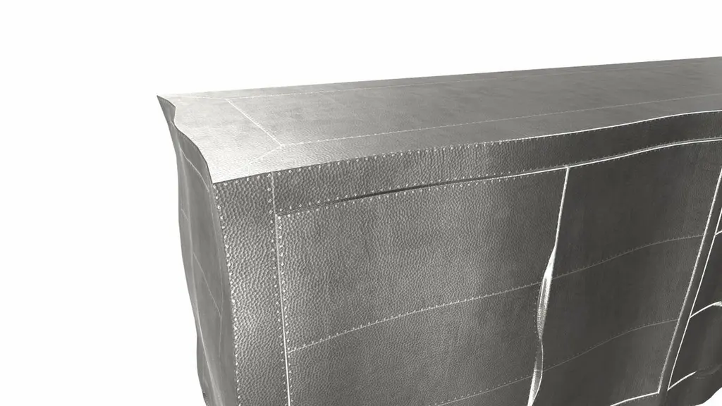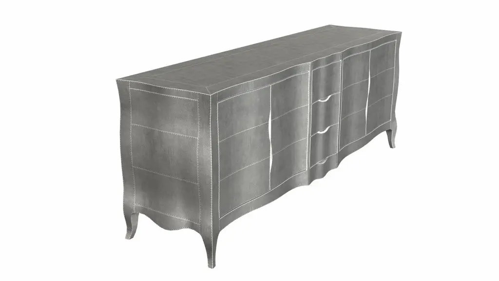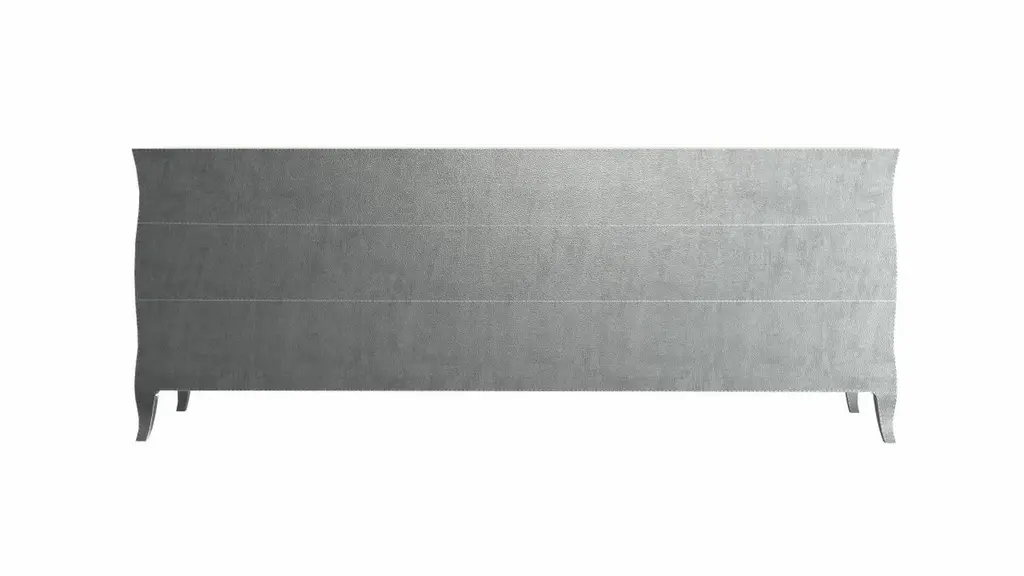 Louise Credenza from our Louise Collection. The renowned designer Paul Mathieu chose the name “Louise Credenza” when he created his more feminine version of Louis XV (1730-1760) furniture. The characteristic cabriole leg, curving outward at the knee and inward towards the foot in an "S" shape was born during this period. It is during the same era that English furniture makers produced the Queen Anne and Chippendale styles.Crafted with utmost care and attention to detail, these Louise Credenza are made to order and are available in twelve metal clad finishes, ensuring that you can choose the perfect one to match your individual style and taste. The use of high-quality materials and expert craftsmanship ensure that each Art Deco Louise Credenza is not only beautiful but also a true piece of Art.The curved legs and side arms of this Art Deco Louise Credenza are hand carved from solid pieces of teak. Pattern makers trace and cut complex forms that will cover the chair in a skin of copper, white bronze, brass or antiqued white bronze The metal finishes will tarnish over time. Regular non-abrasive household metal polishes can be used to restore the original luster.Overall, if you're looking for a piece of furniture that combines luxury, comfort, and style, then the Art Deco Louise Credenza is an excellent choice. With its distinctive curved profile and multiple finish options, this Chair set is sure to elevate the look of any room it is placed in, and be a beloved addition to your home for years to come.The images shown in this listing are shot in different lighting conditions and/or are 3D illustrations. We encourage our customers to please request a sample or a full sample set of 12 finishes so that they can experience the finish first hand. Louise Credenza Art Deco Buffets in Mid. Hammered White Bronze by Paul Mathieu for Stephanie OdegardSize- 78"L x 21"W x 30"HMaterials - White Bronze, Metal sheet, Teak, Wood, MetalTechniques: Hand-Crafted, Hand-Carved, Metal Work, Wood Work, Metal Wrapping, PolishedPlease note that moisture in air, sudden change in temperature and natural movement of wood over time causes the metal to wrinkle or bubble up. We use well seasoned, reclaimed teak and high quality marine grade MDF (wherever technically possible) to avoid and delay the mentioned changes. However a perfect stability of metal cannot be guaranteed. Please note that our smooth finish metal clad pieces will have some unavoidable tool marks. This is proof that everything is done by hand. The smooth finish will not come out like a machine made perfect surface and the master Artisan will do their best to make it look as good/clean/stable/perfect as he possibly can.The antique white bronze finish is hand done by using an acidic chemical over the white bronze finish to recreate a natural patination. Like with the natural patination of silver, copper, or brass, the final result and color uniformity of the patina cannot be guaranteed. The goal of this finish is to achieve rainbow-like shades with dull, shiny, cloudy, and streaky patches to give an illusion of antiquing. Please note:None of our metal clad pieces are treated with a protective “finish” thus enabling the items to age naturally over time. We will of course polish them well before we pack them. a) Copper oxidizes faster than the other metals. In six to twelve months it will most likely lose its shine and will gradually turn to different shades of brown and/or green/blue. This aging process and its effect is referred to as verdigris. After a year the piece should not change much more. Copper does not rust, but does require periodic cleaning in order to retain its original shine if that the preferred option. ('BRASSO' or any known copper polish can be used to polish copper).b) Brass retains its shine for far longer than others, but will tarnish if not cleaned on occasion. ('BRASSO' is made to polish brass).c) White bronze, has the least tendency to show age or tarnish. If kept in a controlled climate, this metal will hold its shine for years. It can be cleaned with a cleanser and polished with a cloth. d) The antiqued white bronze finish will react with the natural elements the fastest in the beginning but it too will stop reacting and will settle down in a stable state like copper after 6-12 months. Since it is already antiqued and looked like it is tarnished, as described in an earlier message, this fast reaction will not change the over all look. In that way this surface is most forgiving. The images shown in this listing are shot in different lighting conditions and/or are 3D illustrations. We encourage our customers to please request a sample or a full sample set of 12 finishes so that they can experience the finish first hand.