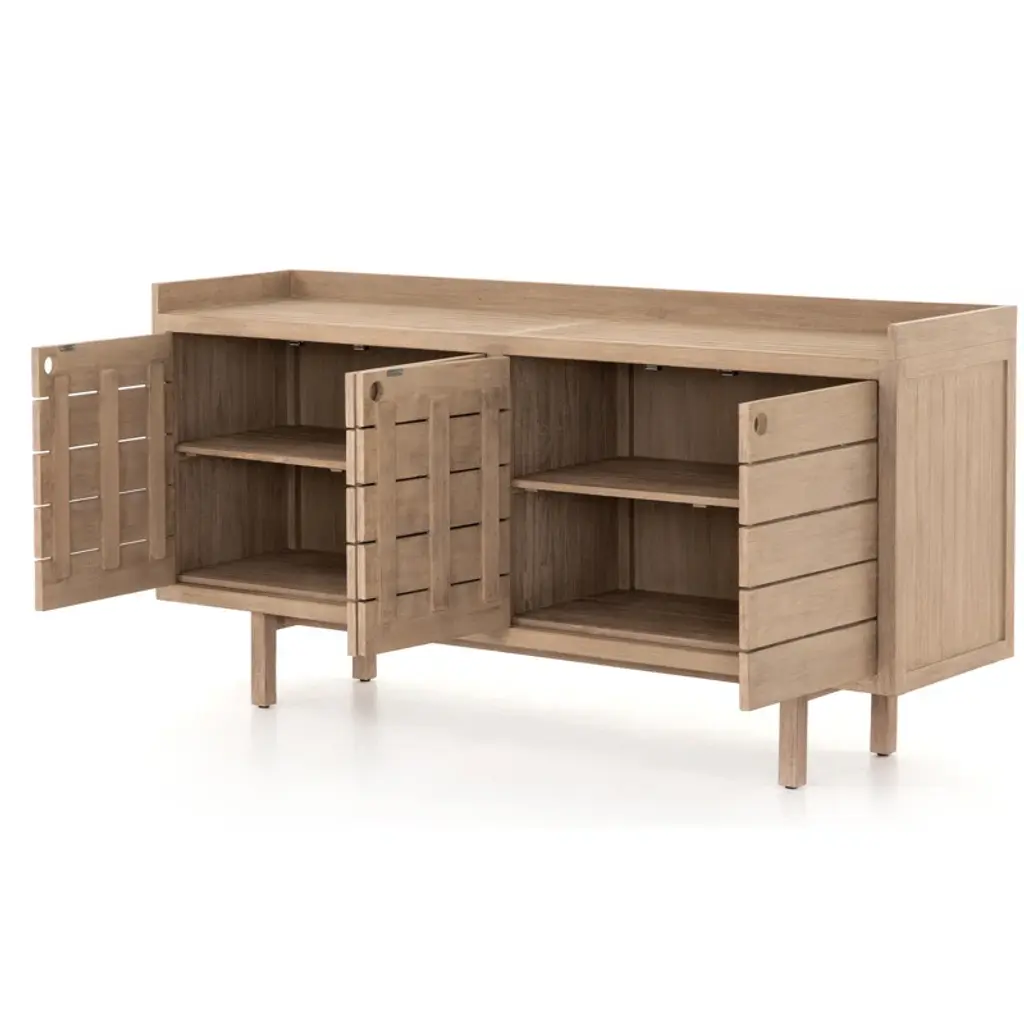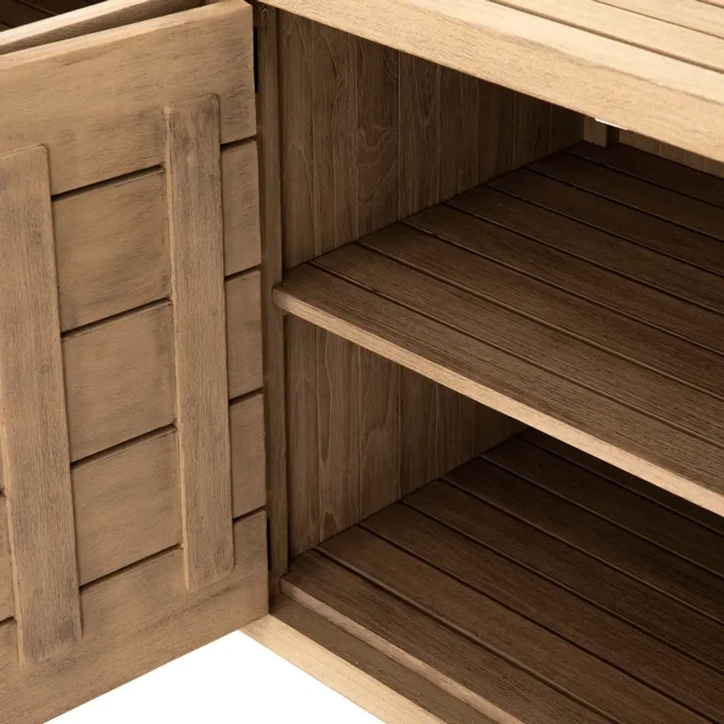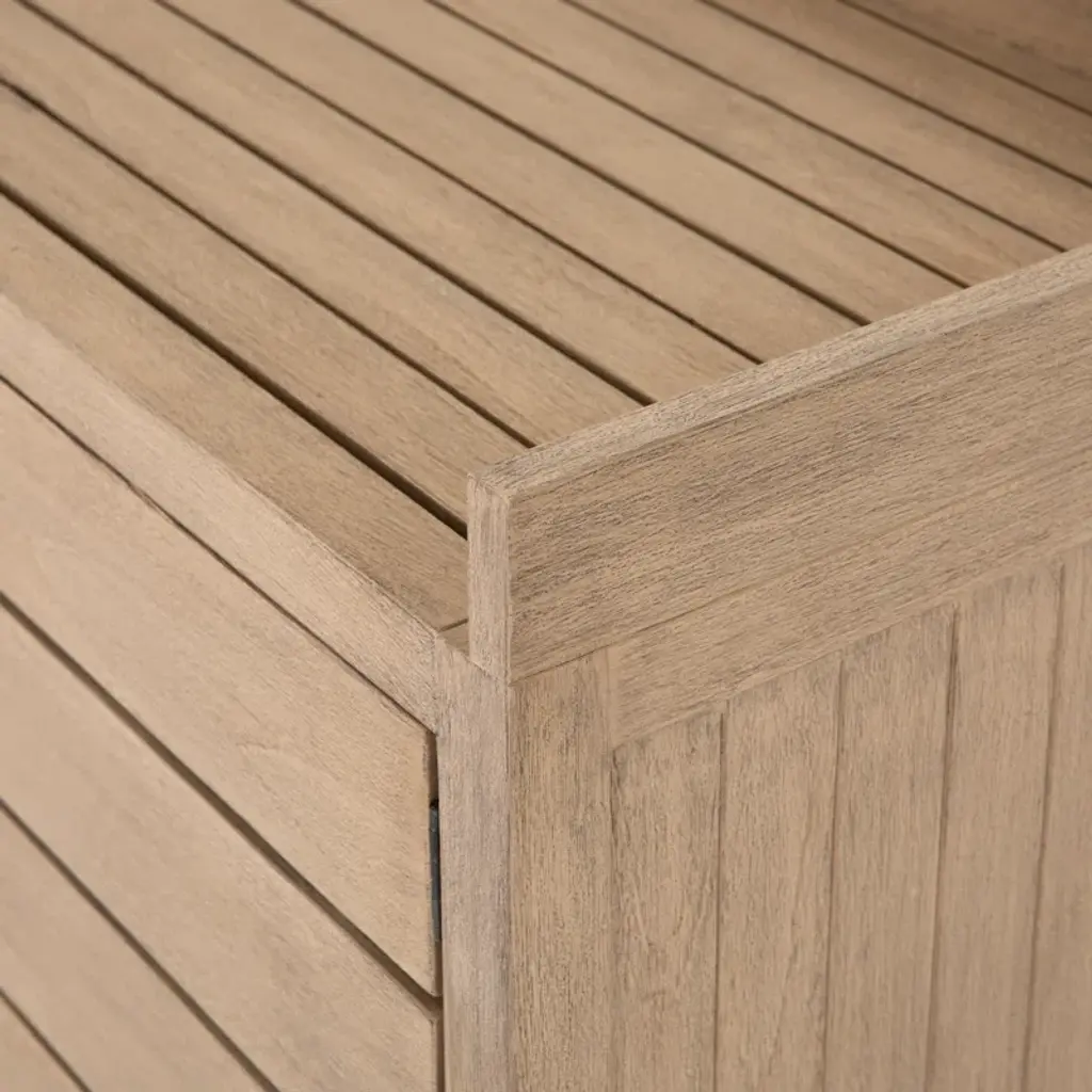 Bring style and storage outdoors. Teak finished features slating for an open, textural look, with cutout openings in place of hardware. Gallery top ready for outdoor entertaining. Cover or store inside during inclement weather and when not in use.