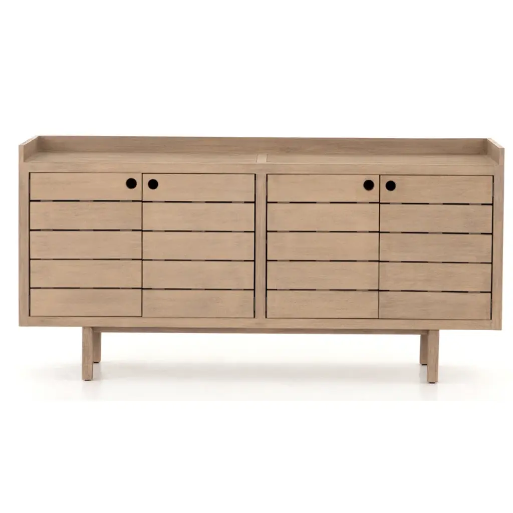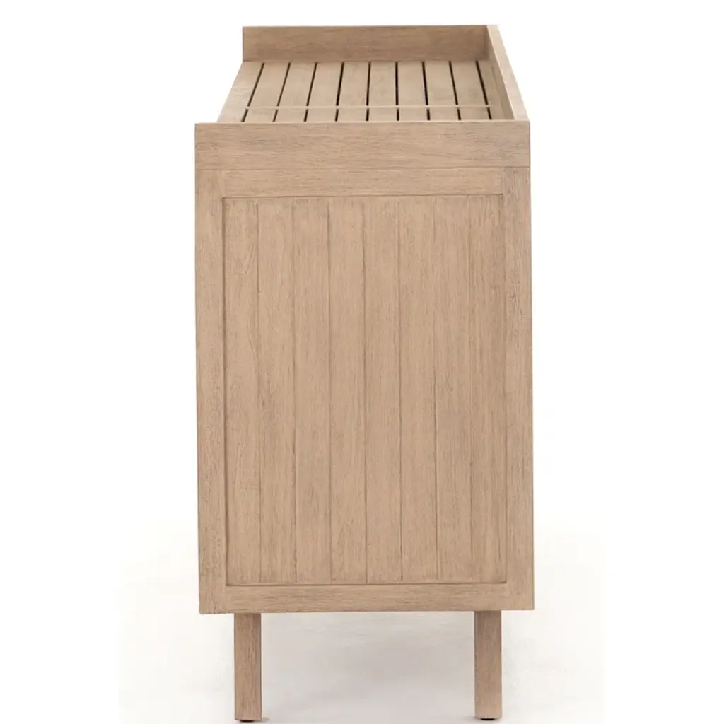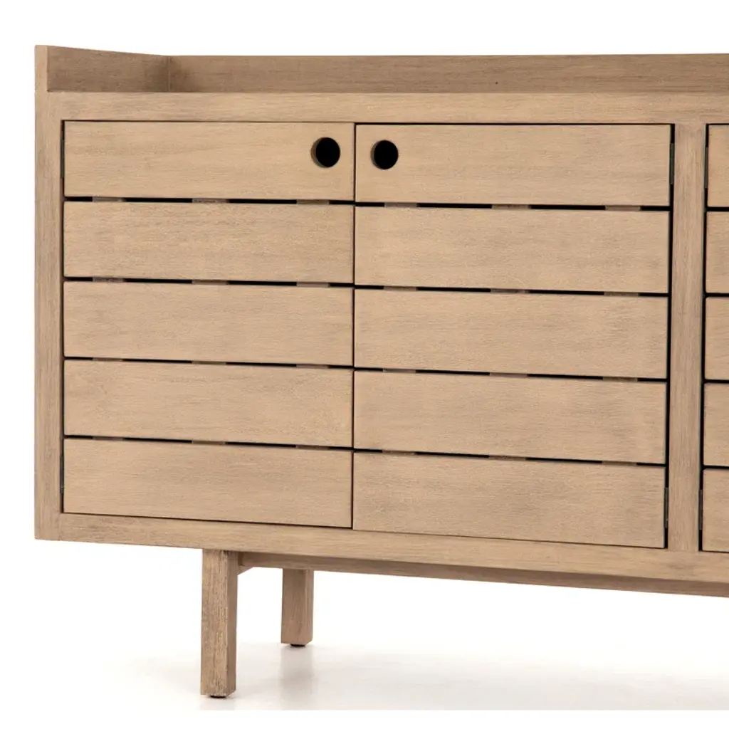 Bring style and storage outdoors. Teak finished features slating for an open, textural look, with cutout openings in place of hardware. Gallery top ready for outdoor entertaining. Cover or store inside during inclement weather and when not in use.