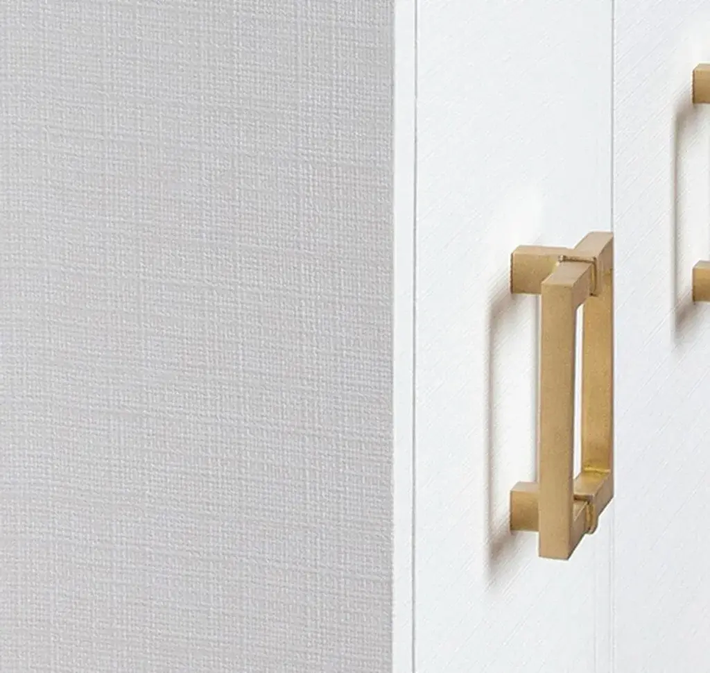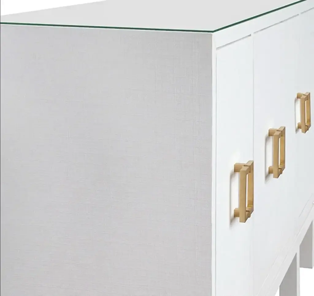 New special order item. Not vintage or pre-owned. Looking for a versatile piece to liven up your home? You’ve found it! Our Effie WH is elegant, striking, and practical all in one. With ample storage space concealed behind each of its four doors, the Effie GR combines elegance with functionality. The buffet is adorned with four square brass handles that open to reveal three adjustable and removable shelves, one in center and two on sides, and a protective glass top. Along with the beautiful white textured linen, our Effie is also offered in blue and green dyed grass cloth. 62"W x 35.5"H x 20"D